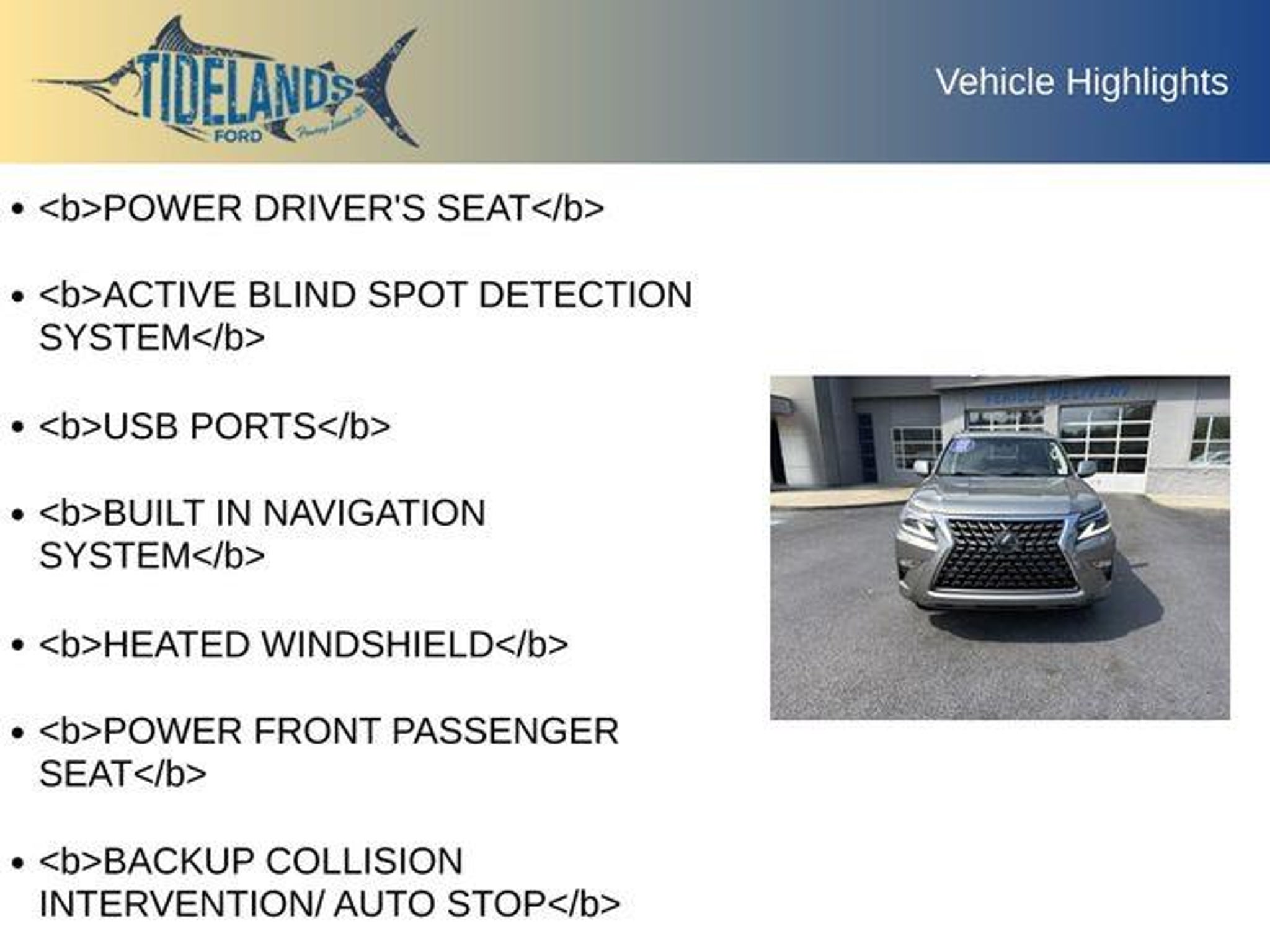 2021 Lexus GX 460 *** Price Includes $500 Dealer Rebate for trade-in and $500 dealer rebate for financing *** Premium Package Heated and Cooled Front Seats Rear Heated Seats Navigation Package Wheel Locks *POWER DRIVER'S SEAT*, *ACTIVE BLIND SPOT DETECTION SYSTEM*, *USB PORTS*, *BUILT IN NAVIGATION SYSTEM*, *HEATED WINDSHIELD*, *POWER FRONT PASSENGER SEAT*, *BACKUP COLLISION INTERVENTION/ AUTO STOP*, *LEATHER SEATS*, *BLUETOOTH STREAMING*, *PUSH-BUTTON IGNITION*, *FORWARD-COLLISION WARNING (FCW)*, *AUTOMATIC EMERGENCY BRAKING (AEB)*, *REAR CROSS TRAFFIC ALERT*, *BLIND-SPOT MONITORING*, *360-DEGREE SURROUND-VIEW CAMERA SYSTEM*, *APPLE CarPlay*, *ANDROID AUTO*, All Services Up To Date, Parking Sensors, Push Button Start, Remote Start, USB, Navigation, Backup Camera/ Rearview Camera, Touchscreen Controls, Memory Seat, Power Seats, Steering Wheel Controls, 18 x 7.5J Aluminum Alloy Wheels, 3.909 Axle Ratio, 3rd row seats: split-bench, 4-Wheel Disc Brakes, 9 Speakers, ABS brakes, Accessory Package, Air Conditioning, Alloy Wheel Locks, Alloy wheels, AM/FM radio: SiriusXM, Anti-whiplash front head restraints, Auto High-beam Headlights, Auto tilt-away steering wheel, Auto-dimming Rear-View mirror, Automatic temperature control, Brake assist, Bumpers: body-color, Cargo Net, Carpet Cargo Mat, CD player, Compass, Delay-off headlights, Driver door bin, Driver vanity mirror, Driver's Seat Mounted Armrest, Dual Front & Rear Auto Air Conditioner, Dual front impact airbags, Dual front side impact airbags, Electronic Stability Control, Emergency communication system, Exterior Parking Camera Rear, Front & Rear Heated Seats, Front anti-roll bar, Front Bucket Seats, Front dual zone A/C, Front reading lights, Front wheel independent suspension, Fully automatic headlights, Garage door transmitter: HomeLink, Heated door mirrors, Illuminated entry, Illuminated running boards, Intuitive Parking Assist, Key Gloves, Knee airbag, Leather Shift Knob, Leather steering wheel, LED Front Fog & Driving Lamp, Low tire pressure warning, Memory seat, Navigation Package, NuLuxe Seat Trim, NuLuxe Synthetic Leather Seat Trim, Occupant sensing airbag, Outside temperature display, Overhead airbag, Overhead console, Panic alarm, Passenger door bin, Passenger seat mounted armrest, Passenger vanity mirror, Power door mirrors, Power driver seat, Power moonroof, Power passenger seat, Power steering, Power windows, Premium Package, Radio data system, Radio: Lexus Multimedia System, Rear anti-roll bar, Rear reading lights, Rear seat center armrest