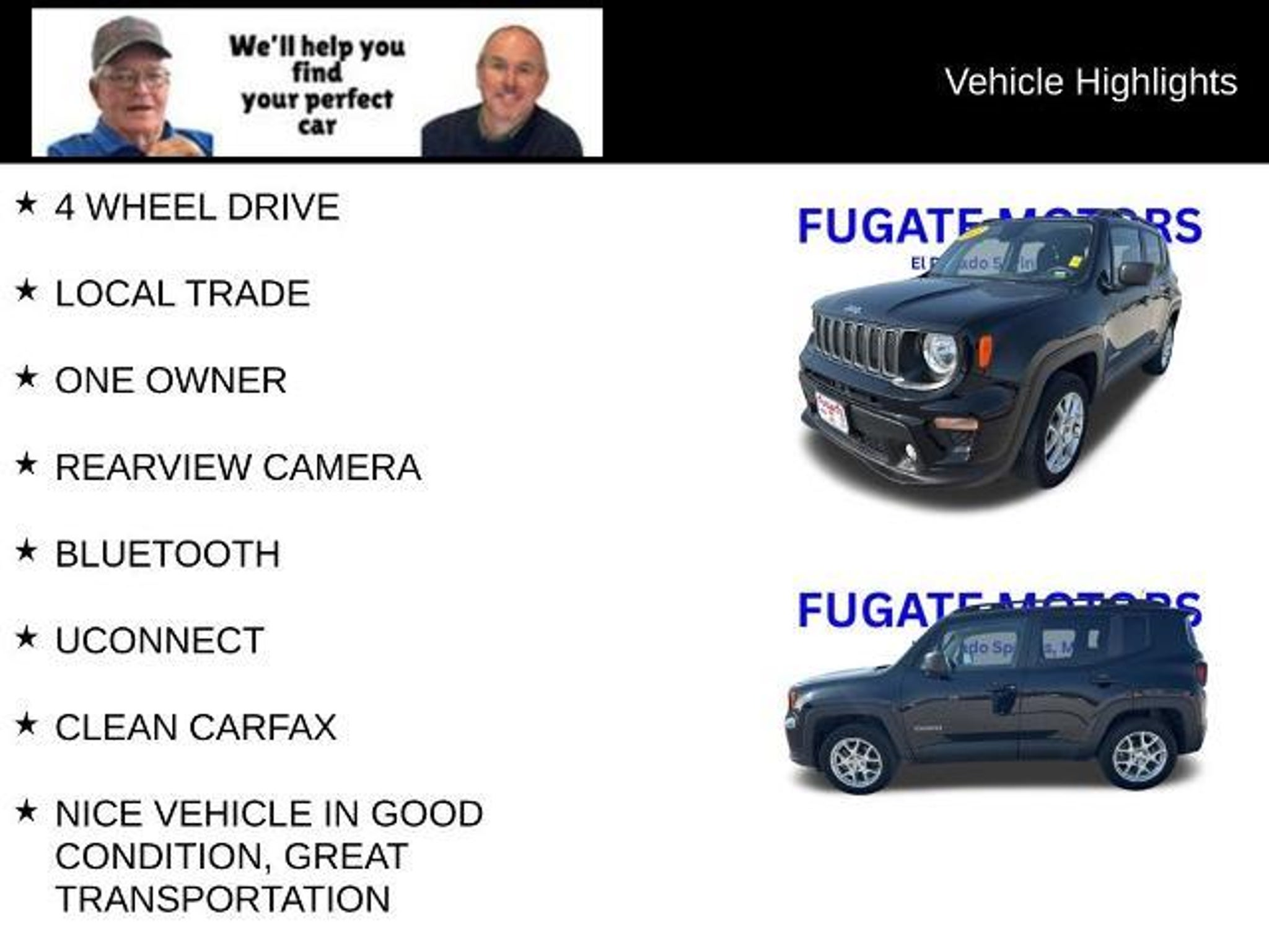 As always - ABSOLUTELY NO FEES! This 2022 Jeep Renegade Latitude is a must-see for any discerning driver. With its sleek Black exterior and well-appointed interior, this vehicle is the perfect blend of style and capability. - 4 WHEEL DRIVE - LOCAL TRADE - ONE OWNER - REARVIEW CAMERA - BLUETOOTH - UCONNECT - CLEAN CARFAX - NICE VEHICLE IN GOOD CONDITION, GREAT TRANSPORTATION Under the hood, you'll find a powerful 1.3L I4 engine paired with a responsive 9-Speed 948TE Automatic transmission, delivering an impressive 23 city / 29 highway MPG. This Renegade Latitude is equipped with a host of premium features, including a Navigation System, Quick Order Package 22B, 6 Speakers, AM/FM radio: SiriusXM, Radio data system, and the renowned Uconnect 4C Nav w/8.4 Display. Stay comfortable year-round with the dual-zone automatic climate control system, while the rear window defroster and power windows ensure a clear view and easy access. The Renegade's four-wheel independent suspension and traction control system provide a smooth and confident ride, no matter the terrain. Safety is a top priority, with features like dual front impact airbags, dual front side impact airbags, a knee airbag, and electronic stability control. The ParkView Rear Back-Up Camera and delay-off headlights also enhance your driving experience. Connectivity is key in today's world, and the Renegade Latitude delivers with Apple CarPlay and Android Auto integration, as well as a compass, driver's information display, and a tilt/telescoping steering wheel. This well-maintained, one-owner Jeep Renegade Latitude is a fantastic opportunity for the discerning buyer. Don't miss your chance to experience the perfect blend of style, capability, and technology. Schedule a test drive today and see why this Renegade is the perfect addition to your garage. As always - ABSOLUTELY NO FEES!