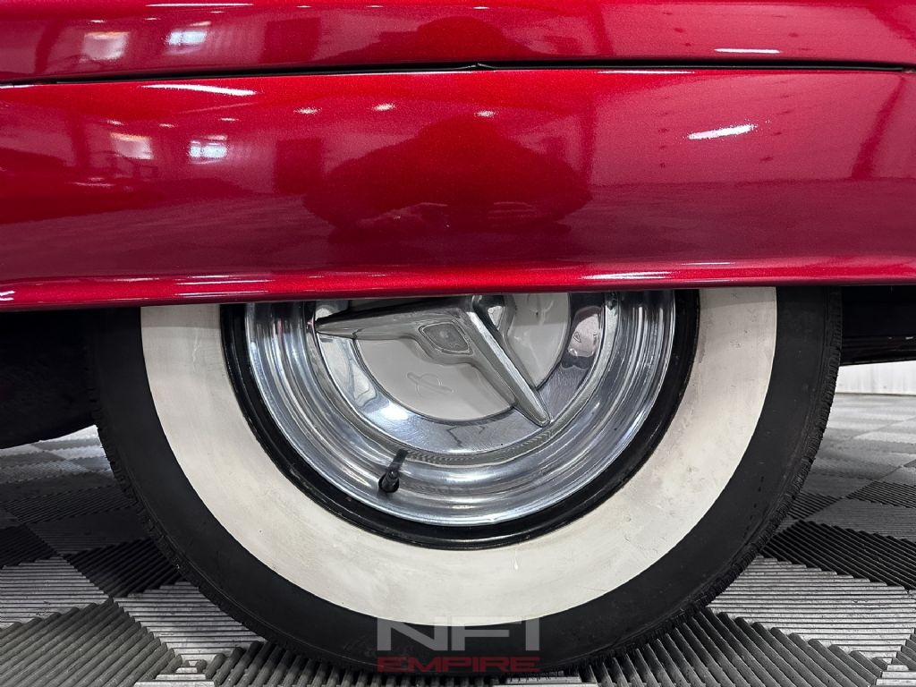 The body has been extensively customized in a traditional style. It features shaved door handles with electronic door poppers, a Carson-style top chopped 4 inches, frenched headlights, a 1956 Oldsmobile front bumper and grille, and 1956 Buick rear quarters with matching tail lights. The finishing details continue with 1957 Cadillac hubcaps and spinners sourced from a 1956 Oldsmobile application, helping tie the full custom look together without losing the period feel.
