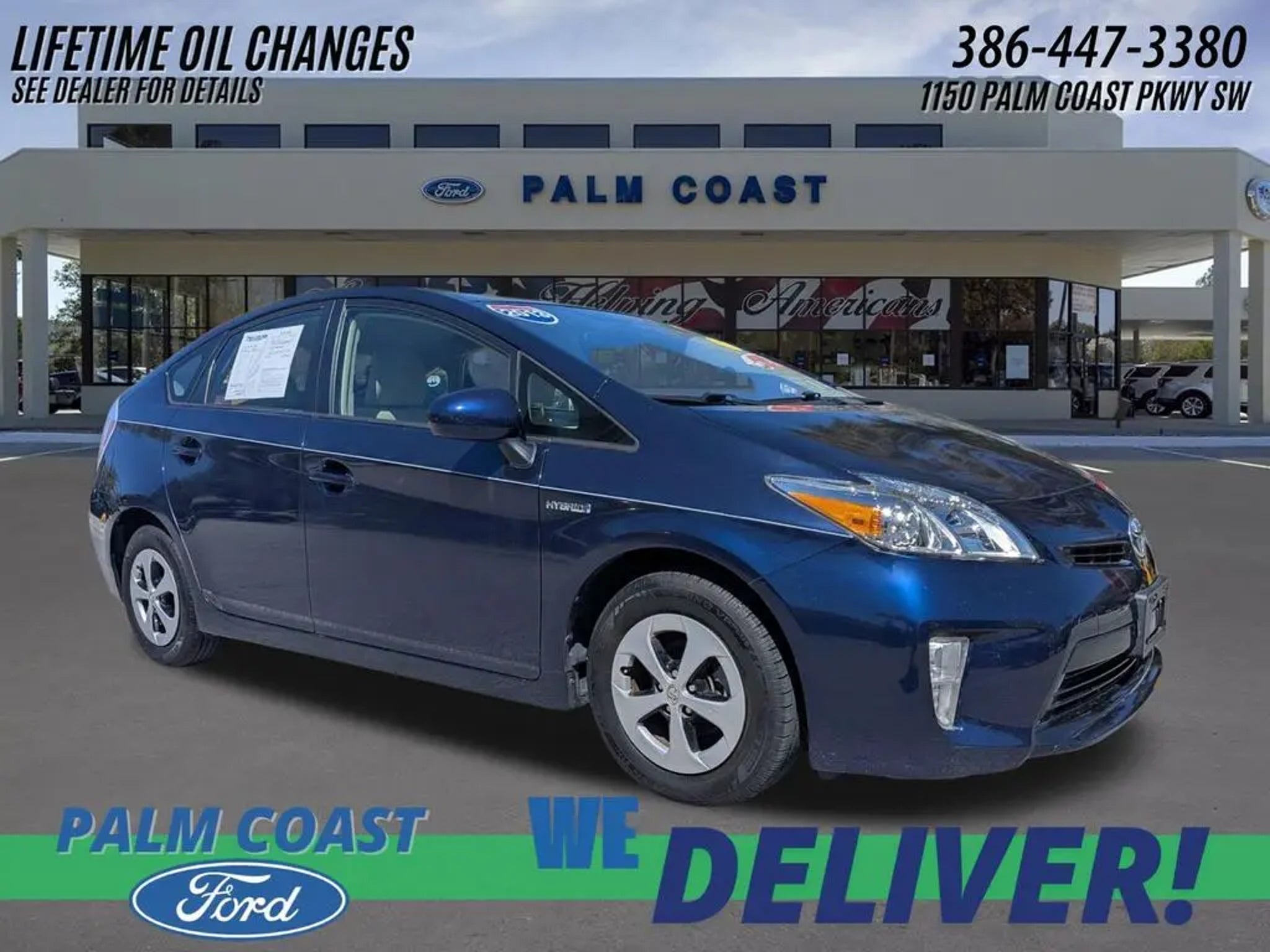 Recent Arrival! 2013 Toyota Prius Three FWD 1.8L 4-Cylinder DOHC 16V VVT-i CVT Nautical Blue Metallic 1.8L 4-Cylinder DOHC 16V VVT-i. Clean CARFAX. Odometer is 18426 miles below market average! 51/48 City/Highway MPG Equipped with 1.8L 4-Cylinder DOHC 16V VVT-i, 4-Wheel Disc Brakes, 6 Speakers, ABS brakes, Air Conditioning, Alloy wheels, AM/FM radio: SiriusXM, AM/FM/CD Player w/MP3/WMA Capability, Anti-whiplash front head restraints, Automatic temperature control, Back-Door Smart Entry, Brake assist, Bumpers: body-color, CD player, Delay-off headlights, Driver door bin, Driver vanity mirror, Dual front impact airbags, Dual front side impact airbags, Electronic Stability Control, Exterior Parking Camera Rear, Front anti-roll bar, Front Bucket Seats, Front Center Armrest w/Storage, Front reading lights, Front wheel independent suspension, HDD Navigation System, Heated door mirrors, Illuminated entry, Knee airbag, Low tire pressure warning, Navigation System, Occupant sensing airbag, Outside temperature display, Overhead airbag, Overhead console, Panic alarm, Passenger door bin, Passenger vanity mirror, Power door mirrors, Power steering, Power windows, Rear Bumper Applique/Rear Bumper Protector, Rear seat center armrest, Rear window defroster, Rear window wiper, Remote keyless entry, Speed control, Split folding rear seat, Spoiler, Steering wheel mounted A/C controls, Steering wheel mounted audio controls, Telescoping steering wheel, Tilt steering wheel, Traction control, Trip computer, and Variably intermittent wipers. Palm Coast Ford, We're Not That Far! Free deliveries within 200 miles. Call us today to experience the difference, (386) 447-3380.