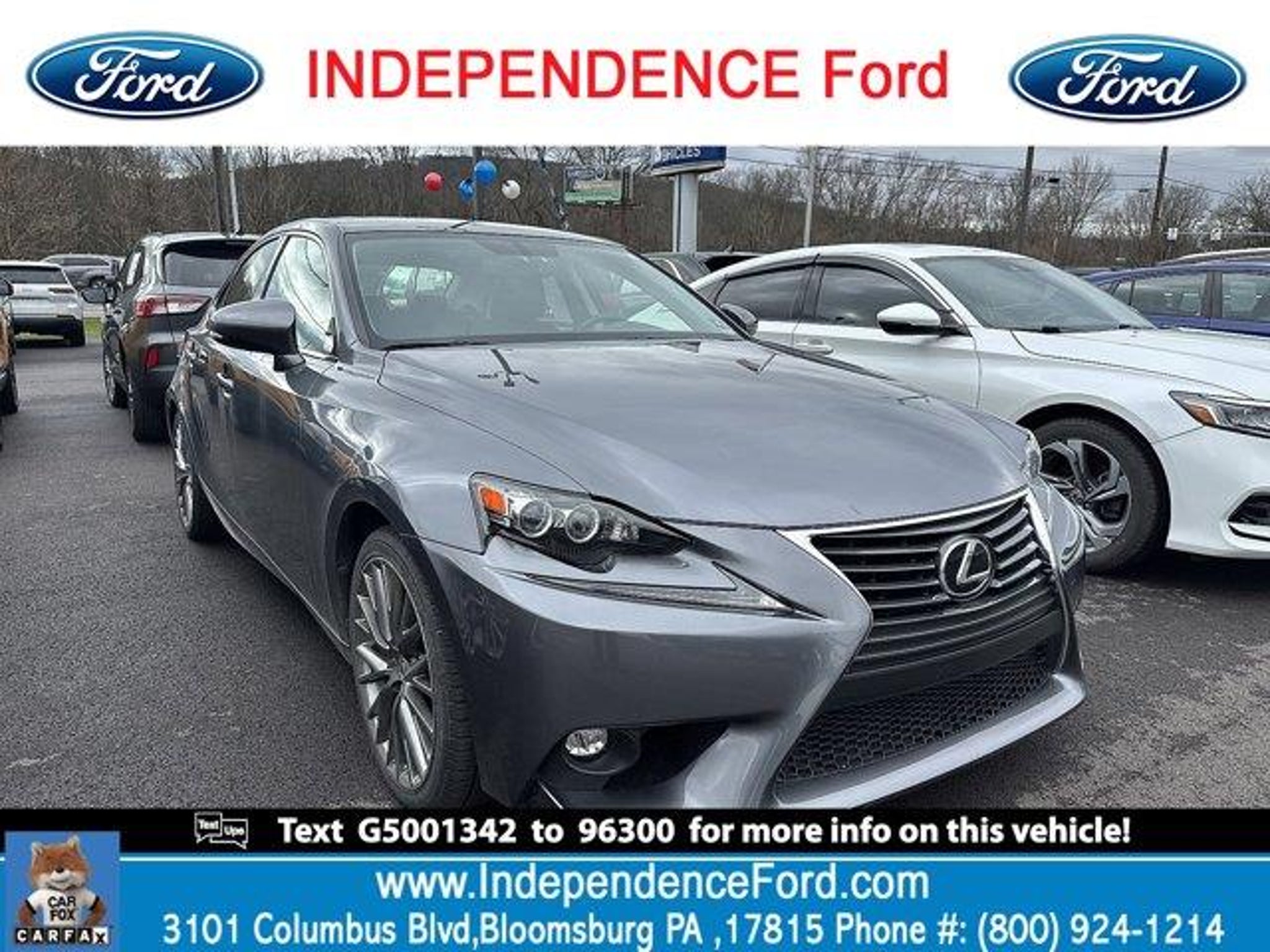 Look at this 2016 Lexus IS 300 . Its Automatic transmission and Premium Unleaded V-6 3.5 L/211 engine will keep you going. This Lexus IS 300 features the following options: Wireless Phone Connectivity, Window Grid Diversity Antenna, Valet Function, Trunk Rear Cargo Access, Transmission w/Driver Selectable Mode, Tracker System, Speed Sensitive Variable Intermittent Wipers, Remote Releases -Inc: Power Cargo Access, Remote Keyless Entry w/Integrated Key Transmitter, 2 Door Curb/Courtesy, Illuminated Entry, Illuminated Ignition Switch and Panic Button, and Real-Time Traffic Display. Test drive this vehicle at Independence Ford, 3101 Columbia Boulevard Route 11, Bloomsburg, PA 17815.