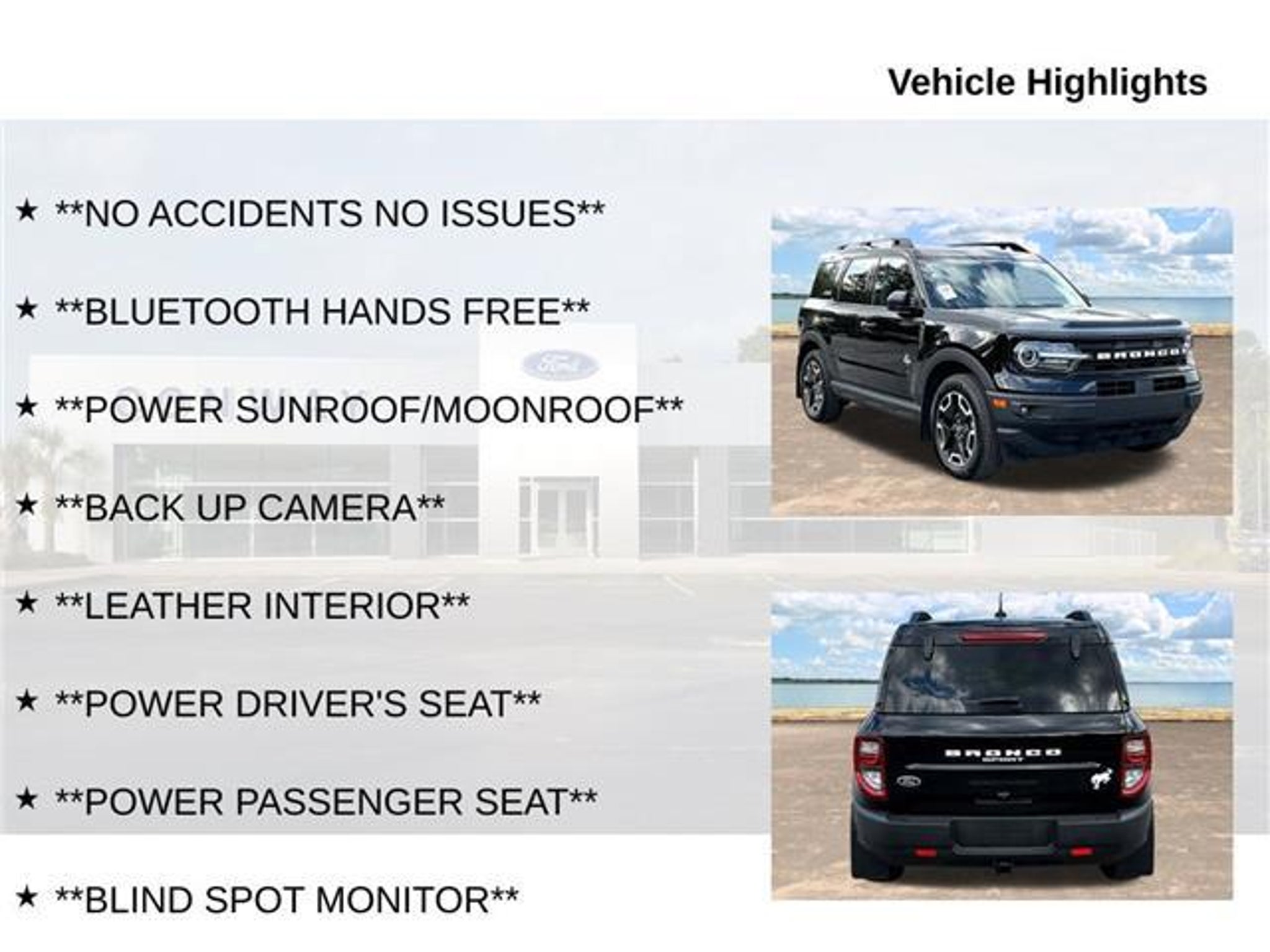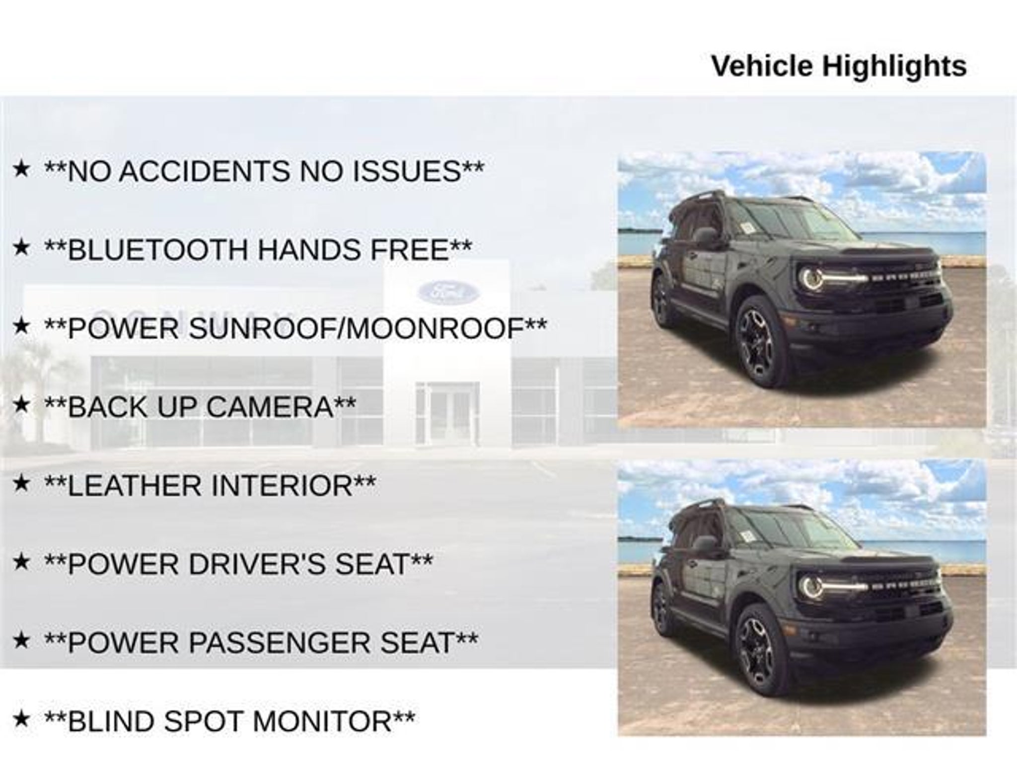 Discover the perfect blend of style, capability, and technology in this stunning 2023 Ford Bronco Sport Outer Banks. This exceptional SUV is ready to elevate your driving experience with its impressive features and uncompromising performance. - **NO ACCIDENTS NO ISSUES** - **BLUETOOTH HANDS FREE** - **POWER SUNROOF/MOONROOF** - **BACK UP CAMERA** - **LEATHER INTERIOR** - **POWER DRIVER'S SEAT** - **POWER PASSENGER SEAT** - **BLIND SPOT MONITOR** - **NAVIGATION** - **BALANCE OF FACTORY WARRANTY** - **FULLY SERVICED AND DETAILED** - Apple Carplay-Android Auto - Remote Start - Adaptive Cruise Control - Lane Keep Assist - Heated Power Front Seats - B&O Sound System - Dual Zone Climate Control - FordPass Connect - Trailer Package Beneath the bold and stylish exterior, this Bronco Sport Outer Banks is powered by a 1.5L EcoBoost engine, delivering an impressive 25 city/28 highway MPG. The 8-speed automatic transmission and 4WD system ensure a smooth and capable ride, whether you're navigating the city streets or exploring the great outdoors. The Tech Package on this Bronco Sport takes the driving experience to new heights. Enjoy the premium sound of the Bang & Olufsen audio system, the convenience of wireless charging, and the advanced features of the Voice-Activated Touchscreen Navigation System. The Ford Co-Pilot360 Assist suite of driver-assist technologies, including Evasive Steering Assist and Intelligent Adaptive Cruise Control, provide added peace of mind on every journey. Versatility is at the heart of the Bronco Sport Outer Banks. The Cargo Management System, with its shelf, divider, and table, ensures you can easily organize and transport your gear, while the Class II Trailer Tow Package with Trailer Sway Control allows you to bring along your favorite toys. This 2023 Ford Bronco Sport Outer Banks is a true standout in the SUV segment, blending rugged capability, advanced technology, and refined style. With its balance of factory warranty, meticulous servicing, and exceptional features, this vehicle is primed to exceed your expectations. Experience the difference for yourself and schedule a test drive today. We're confident you'll be impressed.