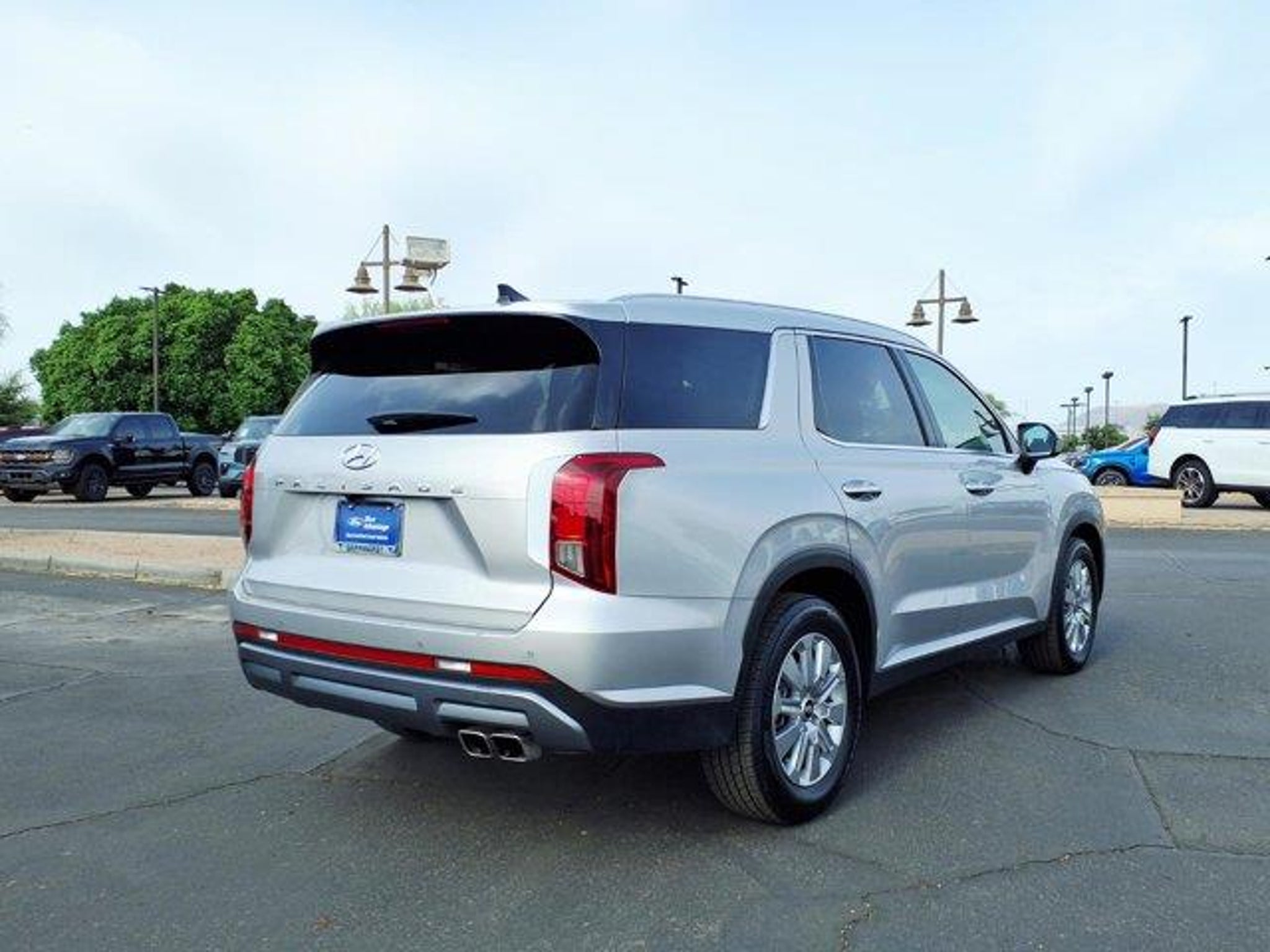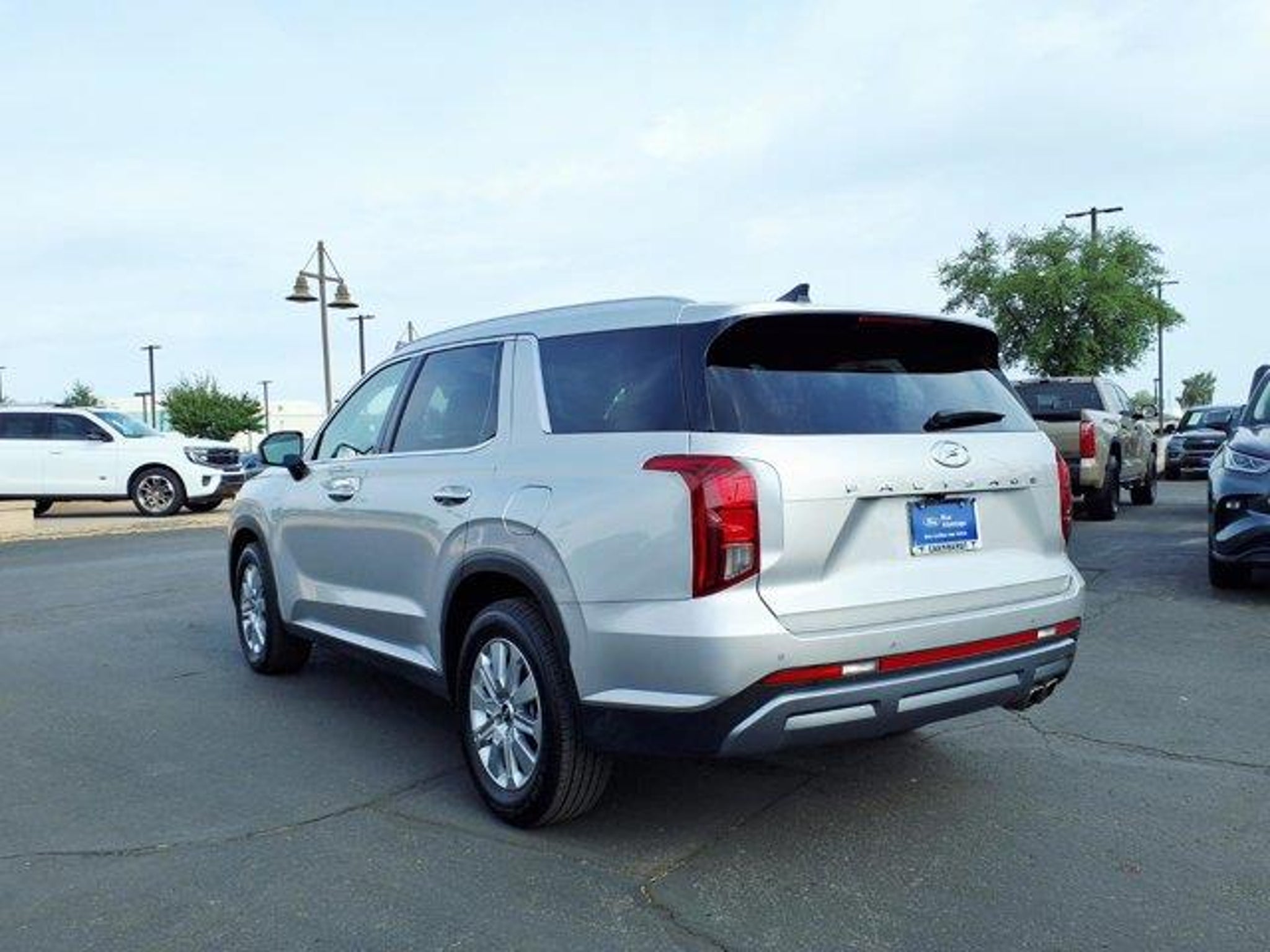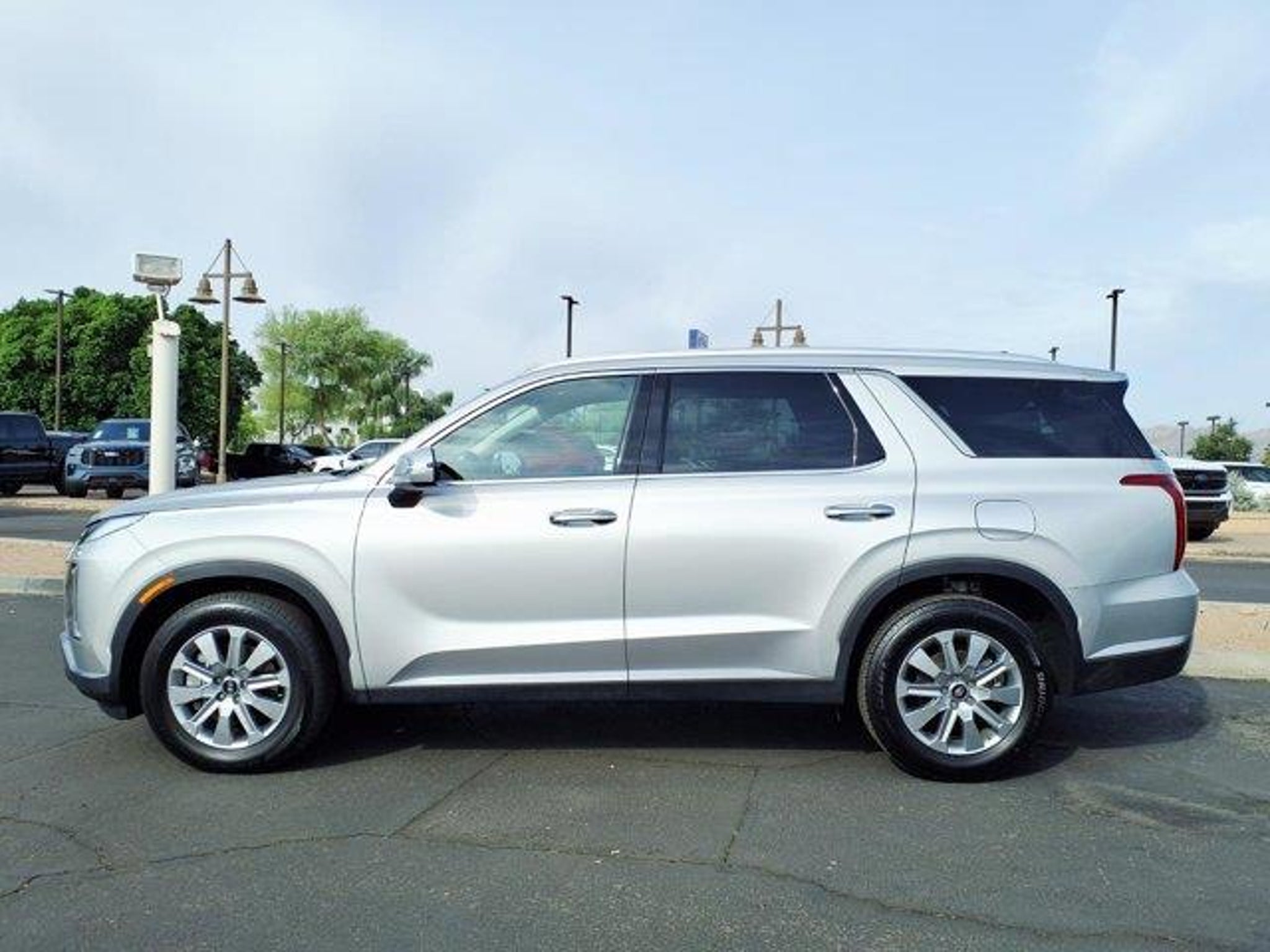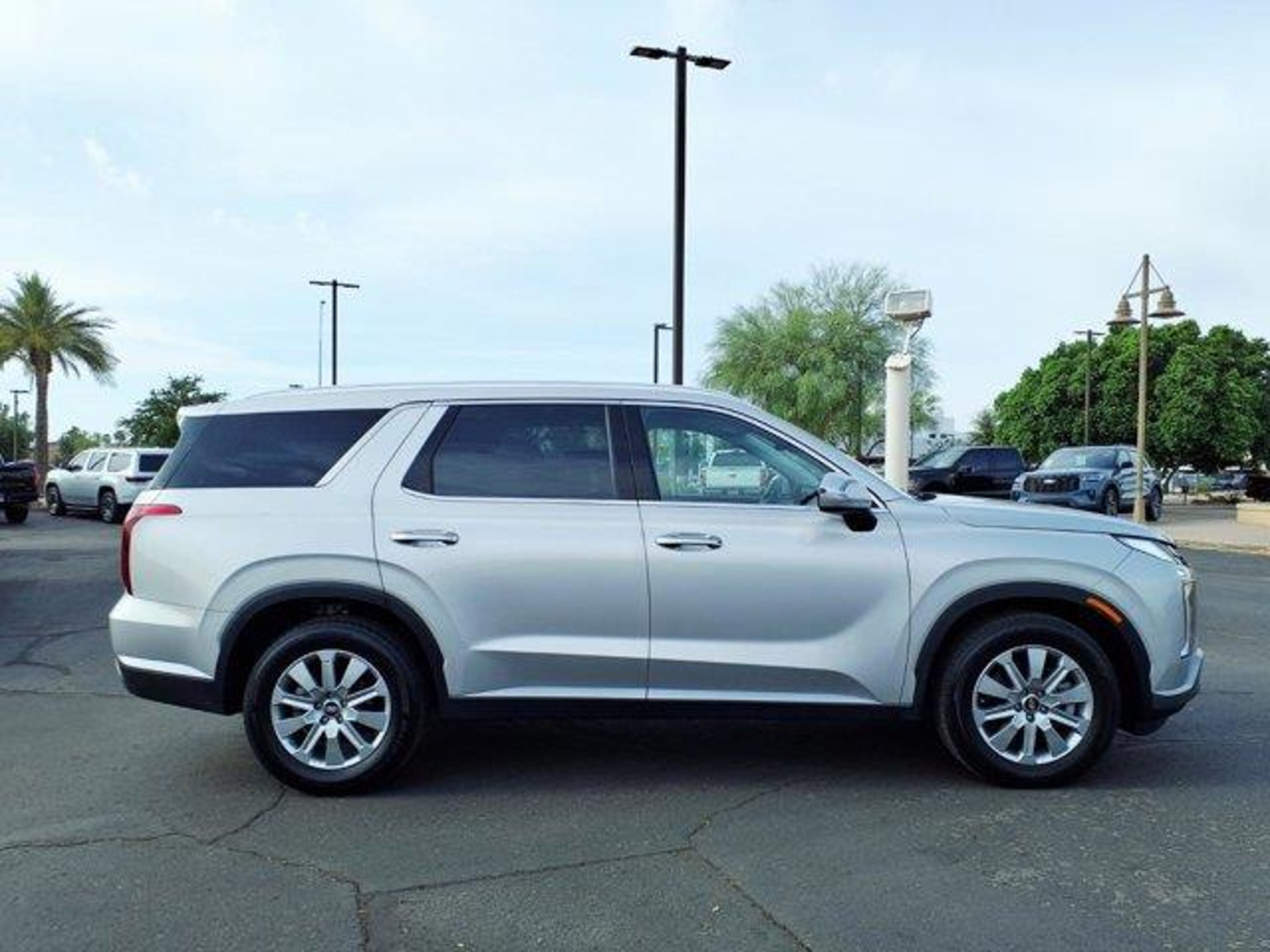 Typhoon Silver 2025 Hyundai Palisade SEL FWD 8-Speed Automatic with SHIFTRONIC V6 3rd row seats: split-bench, 4-Wheel Disc Brakes, 6 Speakers, ABS brakes, Air Conditioning, Alloy wheels, AM/FM radio: SiriusXM, Apple CarPlay & Android Auto, Auto High-beam Headlights, Auto-dimming Rear-View mirror, Automatic temperature control, Brake assist, Bumpers: body-color, Delay-off headlights, Driver door bin, Driver vanity mirror, Dual front impact airbags, Dual front side impact airbags, Electronic Stability Control, Emergency communication system, Exterior Parking Camera Rear, Four wheel independent suspension, Front anti-roll bar, Front Bucket Seats, Front Center Armrest, Front dual zone A/C, Front reading lights, Fully automatic headlights, H-Tex Leatherette Seat Trim, Heated door mirrors, Heated Front Bucket Seats, Heated front seats, Illuminated entry, Knee airbag, Leather steering wheel, Low tire pressure warning, Navigation System, Occupant sensing airbag, Option Group 01, Outside temperature display, Overhead airbag, Overhead console, Panic alarm, Passenger door bin, Passenger vanity mirror, Power door mirrors, Power driver seat, Power Liftgate, Power passenger seat, Power steering, Power windows, Radio data system, Radio: AM/FM/MP3 Audio System, Rear air conditioning, Rear anti-roll bar, Rear audio controls, Rear reading lights, Rear side impact airbag, Rear window defroster, Rear window wiper, Reclining 3rd row seat, Remote keyless entry, Security system, Speed control, Speed-sensing steering, Split folding rear seat, Spoiler, Steering wheel mounted audio controls, Tachometer, Telescoping steering wheel, Tilt steering wheel, Traction control, Trip computer, Turn signal indicator mirrors, Variably intermittent wipers, Wheels: 18 x 7.5J Painted Finish Alloy.Recent Arrival! Odometer is 13408 miles below market average! 19/26 City/Highway MPG