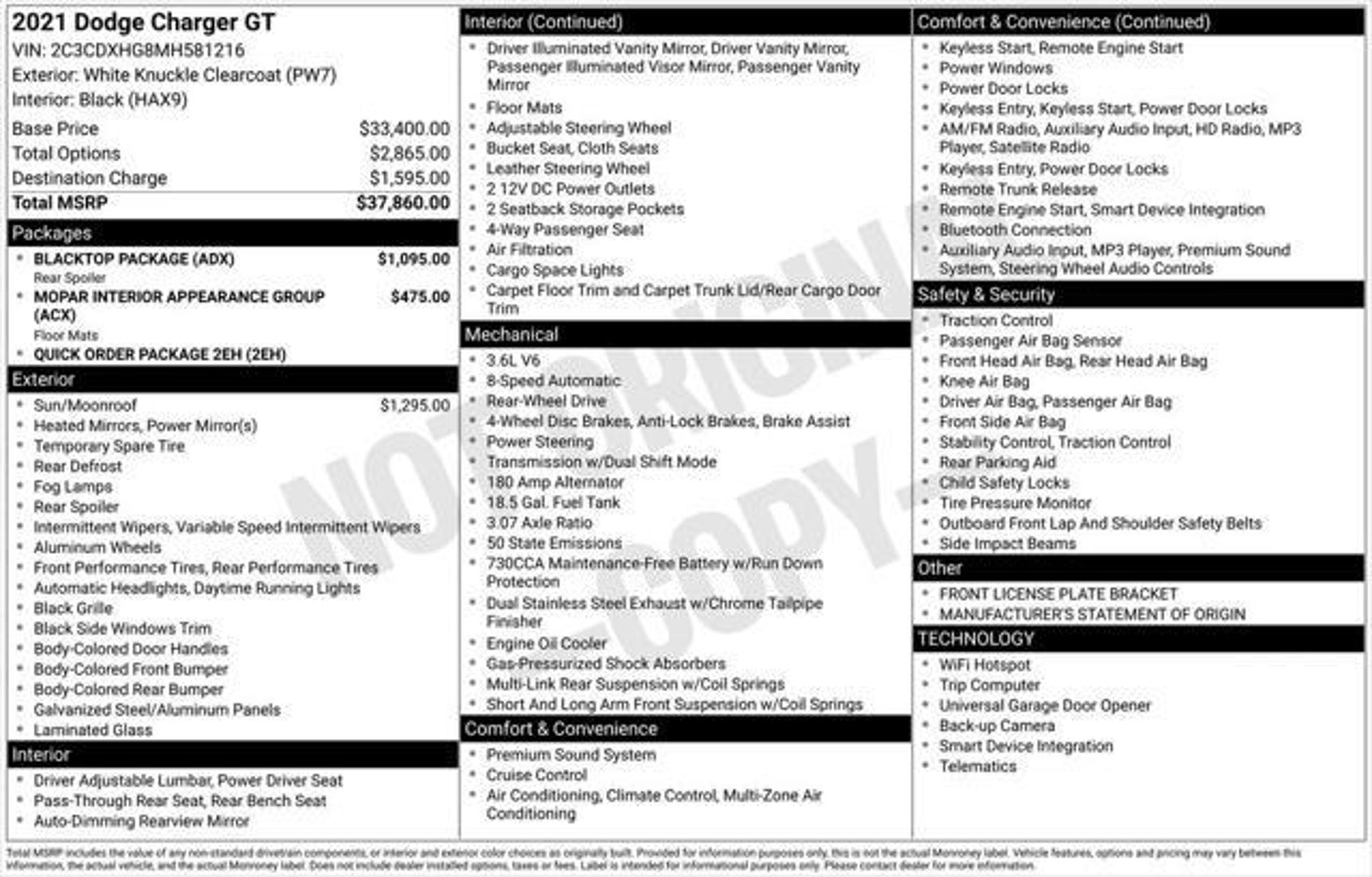 Discover the power and style of the 2021 Dodge Charger GT. This exceptional performance sedan combines head-turning good looks with impressive capabilities, making it the ultimate choice for the discerning driver. Outfitted with a thrilling 3.6L V6 engine and an 8-speed automatic transmission, the Charger GT delivers an exhilarating driving experience. Boasting 19 MPG in the city and 30 MPG on the highway, this vehicle offers the perfect balance of power and efficiency. Elevate your commute or weekend adventures with the Charger GT's responsive handling and smooth, controlled ride. - Blacktop Package - Mopar Interior Appearance Group - Quick Order Package 2EH - ParkView Rear Back-Up Camera - Power Sunroof - Alloy wheels The Charger GT's striking exterior features a bold, muscular design that commands attention on the road. The sleek, aerodynamic silhouette is complemented by a range of premium exterior touches, including a black performance spoiler, black badging, and satin black accents that add a touch of sophistication. Step inside the Charger GT and you'll be greeted by a well-appointed, driver-focused cabin. Cloth performance seats provide exceptional comfort and support, while the Uconnect 4C infotainment system with an 8.4-inch display keeps you connected and entertained. Convenience features like dual-zone automatic climate control, remote keyless entry, and a power driver's seat ensure a premium driving experience. Safety is also a top priority in the Charger GT, with a comprehensive suite of advanced driver-assistance technologies. From the ParkView Rear Back-Up Camera to the Electronic Stability Control system, you can drive with confidence knowing you and your passengers are well-protected. Whether you're seeking a thrilling daily driver or a versatile weekend warrior, the 2021 Dodge Charger GT is the perfect choice. Experience the perfect blend of power, style, and technology by scheduling a test drive today. We're confident you'll be impressed by everything this exceptional vehicle has to offer.