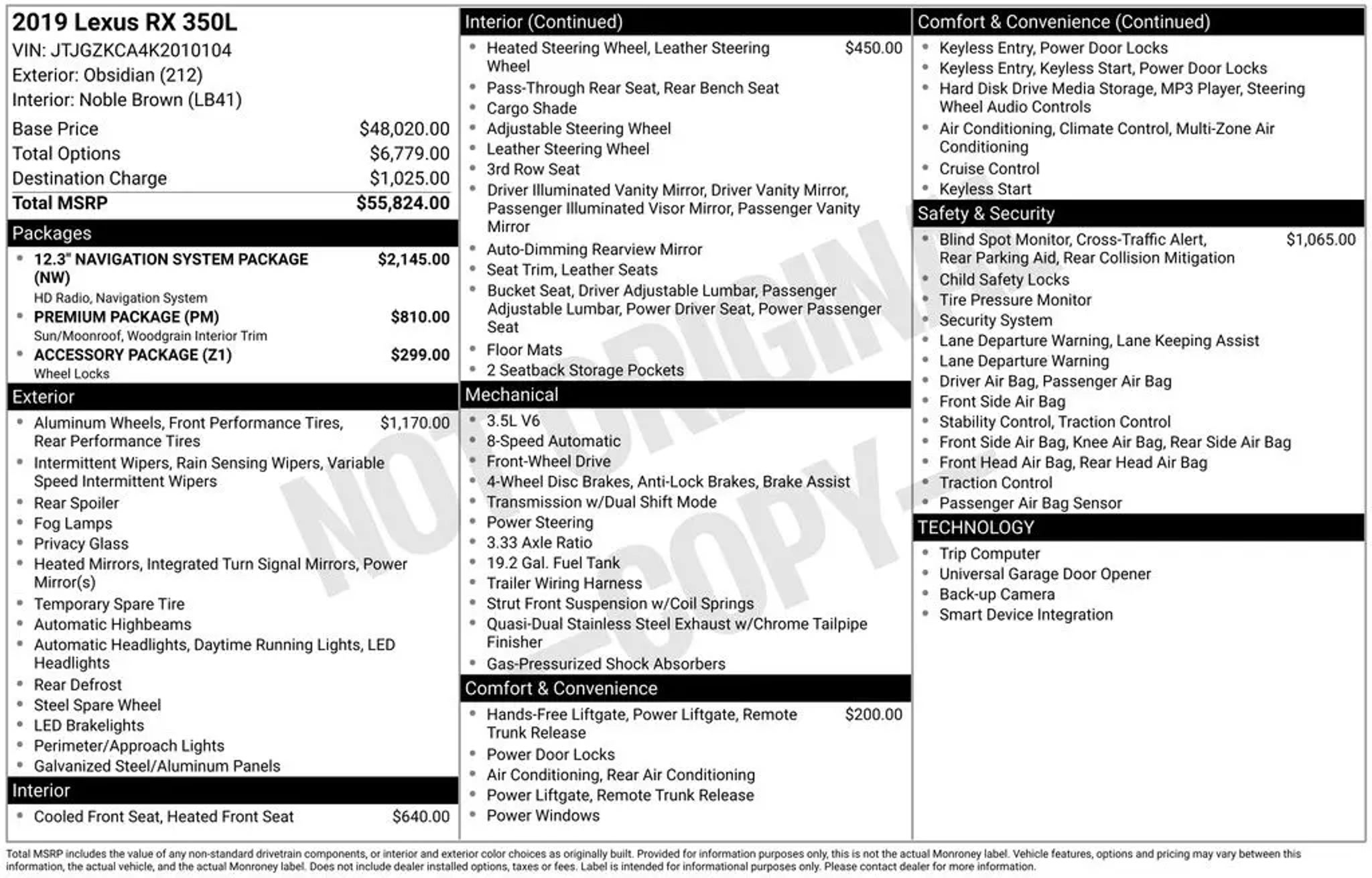 Discover the luxurious 2019 Lexus RX 350L, a captivating SUV that combines sophisticated style with exceptional performance. This meticulously maintained vehicle boasts a sleek black exterior, complemented by a spacious and well-appointed interior that will elevate your driving experience. Indulge in the remarkable features that set this RX 350L apart: - 12.3 Navigation System Package with advanced voice command - 20 High-Gloss Machined Dark Silver Wheels - Blind Spot Monitor and Rear Cross Traffic Alert - Premium Package with Tilt & Slide Sunroof and Wood Door Trim - Heated and Ventilated Front Seats - Premium Heated Wood Steering Wheel This Lexus RX 350L is not just a vehicle; it's a statement of refined taste and exceptional craftsmanship. With its powerful 3.5L V6 engine, 8-speed automatic transmission, and front-wheel drive, this SUV delivers a captivating blend of performance and efficiency, earning an impressive 19 city and 26 highway MPG. Elevate your driving experience with the unparalleled comfort and convenience of this Lexus RX 350L. The spacious cabin, with its premium features and thoughtful design, will make every journey a true pleasure. Whether you're embarking on a family adventure or seeking a sophisticated daily driver, this vehicle is sure to exceed your expectations. This Lexus RX 350L has been meticulously inspected and certified, ensuring you can purchase with confidence. Our team of experts has thoroughly evaluated the vehicle, verifying its exceptional condition and adherence to Lexus' rigorous standards. Discover the exceptional value and uncompromising quality of this 2019 Lexus RX 350L. We invite you to experience the difference for yourself by scheduling a test drive at our showroom. Let us demonstrate how this remarkable SUV can enhance your driving experience and exceed your expectations.