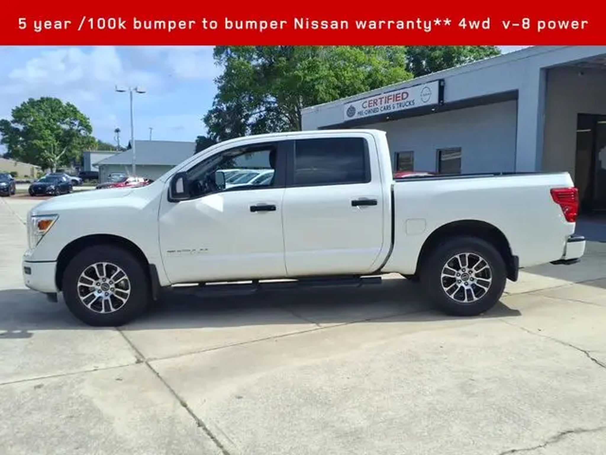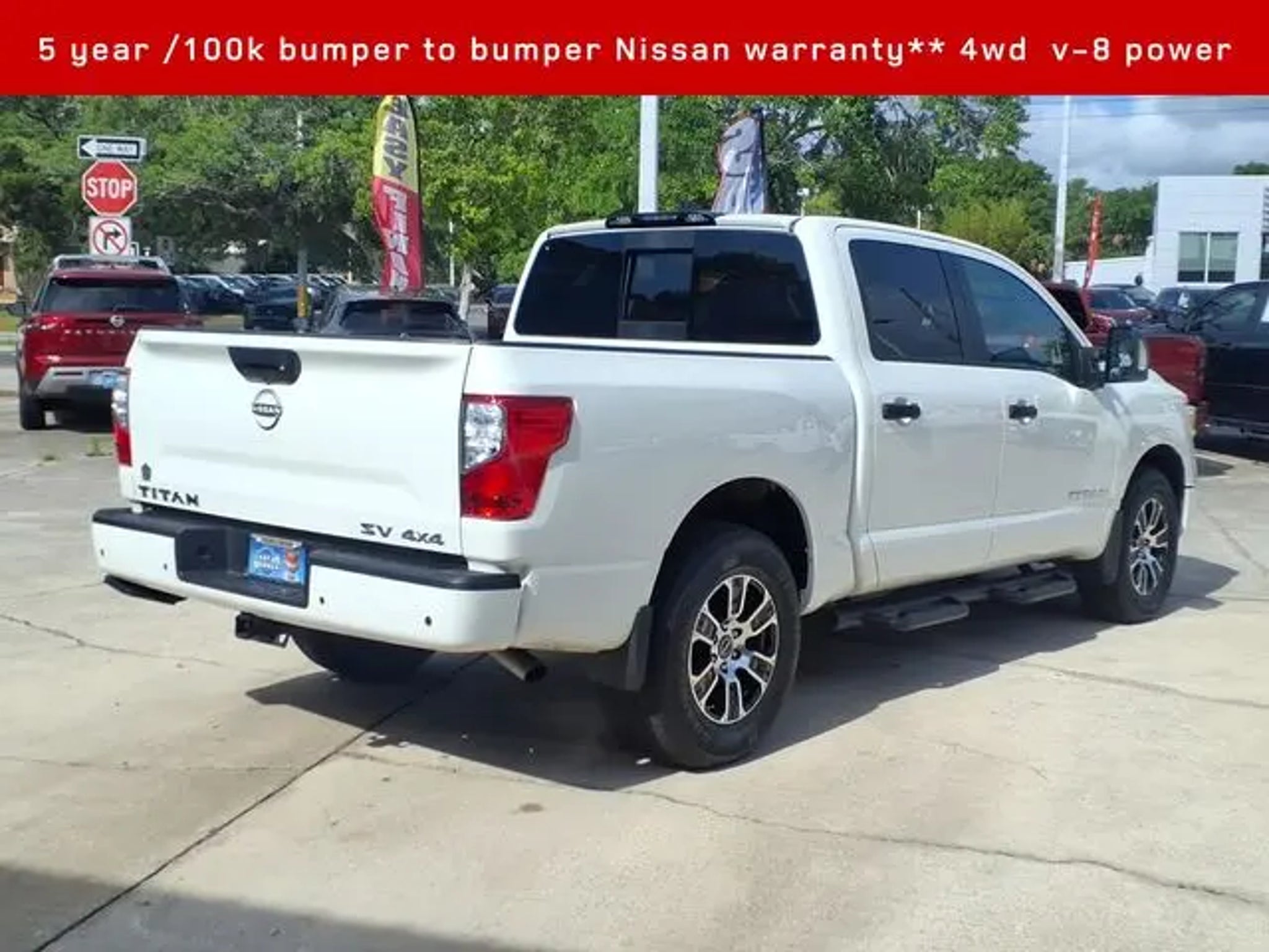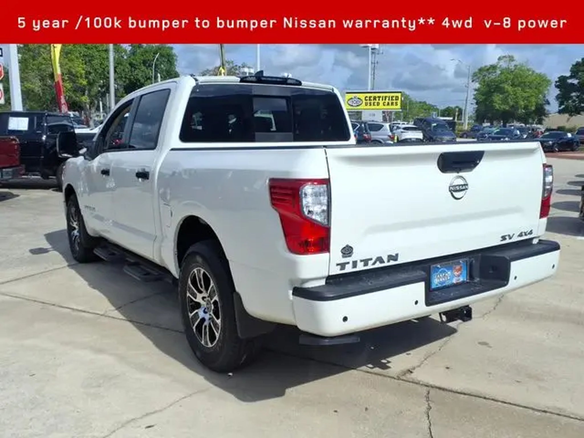 2024 Nissan Titan SV 4WD**Crew cab v-8 **Amazing full sized pickup value Titan- Corporate lease termination in like new condition / never hauled a thing and looks amazing as it is inside and out- Conveniences and comfort of an executive sedan and brute hauling power of a truck 2024 Nissan Titan SV **4D Crew Cab** 5.6L V8 DOHC 32V LEV3-ULEV70 400hp, 9-Speed Automatic Titan is powerful and boasts the only 5 year /100k full factory warranty in trucks!! 15/21 City/Highway MPG Our Nissan, factory trained, Master technician perform a 167 point inspection and completed routine maintenance. Serving the central Florida area since 1971 and continuing a wonderful history with our new and long time customers, today. We are conveniently located in Titusville, FL just 35 minutes from Orlando Int'l airport, off I-95 exit 220. East 2.7M to US1, turn right on US1- to 1128 S Hopkins Ave Titusville, FL 32780. ** Price does not reflect reconditioning fee $1195 SV Convenience Package (120V/12V Outlets In Back Of Center Console, 2 Illuminated USB-A Ports In Back Of Center Console, Auto-Dimming Rear-View Mirror, Dedicated Cell Phone Holder, Dual Illuminated Vanity Mirror Front Sun Visors, Dual Zone Automatic HVAC, Front & Rear Parking Sensors, Heated Front Captain's Chairs, Intelligent Key System, Leather-Wrapped Steering Wheel, Mood Light, NissanConnect Services, Overhead Console w/Sunglass Holder, Power Sliding Rear Window w/Defogger, Rear HVAC Vents, Remote Engine Start System, and Wi-Fi Hotspot), SV Tow Package (4-Pin/7-Pin Wiring Harness Connector (Rear Bumper), Heated Manually Extendable Tow Mirrors, Puddle Lamps, Receiver Hitch, Trailer Brake Controller, and Trailer Light Check Function On Key Fob), SV Utility Package (120V Outlet in Bed, Electronic Locking Tailgate, Flat Floor Function w/Tie Down Hooks, LED Tailgate Area Illumination, LED Under Rail Bed Lighting, Rain Sensing Wipers, Rear Utility Bed Step, Rearview Mirror w/Universal Garage Door Opener, Spray-On Bedliner, and Utilitrack System w/2 Tie-Down Cleats), Nissan Certified Certified, 4WD, 3.692 Axle Ratio, 4-Wheel Disc Brakes, 6 Speakers, ABS brakes, Air Conditioning, Alloy wheels, AM/FM radio: SiriusXM, Apple CarPlay/Android Auto, Auto High-beam Headlights, Bed Assist Grip, Blind Spot Warning, Brake assist, Bumpers: chrome, Carpet Floor Mats (L95), Cloth Seat Trim, Driver door bin, Dual front impact airbags, Dual front side impact airbags, Electronic Stability Control, Front anti-roll bar, Front Center Armrest w/Storage, Front reading lights, Front Split Bench Seat (40/20/40), Front wheel independent suspension, Fully automatic headlights, Heated door mirrors, Illuminated entry, Knee airbag, Loop Side Steps, Low tire pressure warning, Occupant sensing airbag, Outside temperature display, Overhead airbag, Overhead console, Panic alarm, Passenger door bin, Passenger vanity mirror, Power door