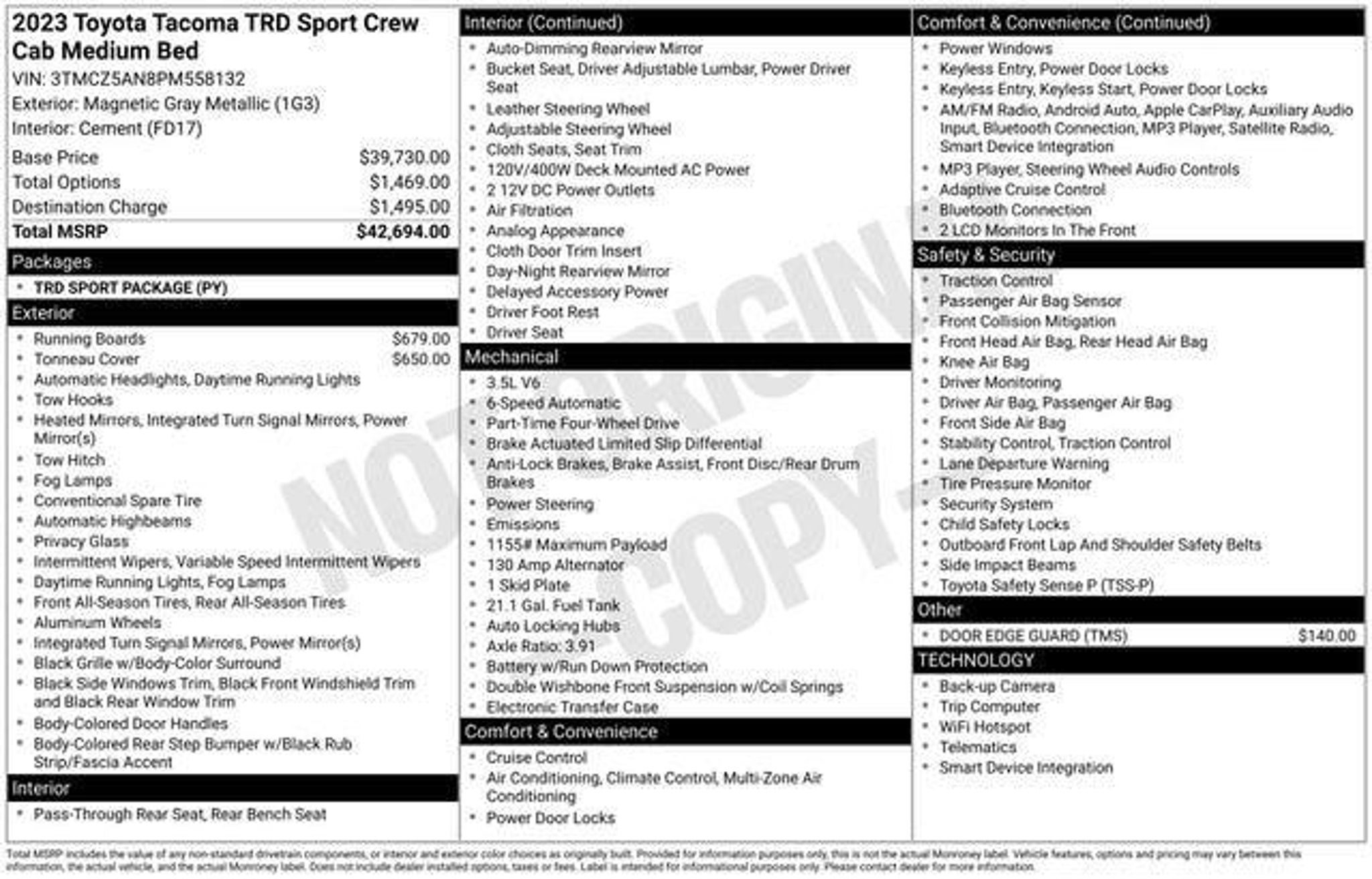 Backup Camera, Bluetooth, 20 Premium Dark Tarnished Painted Alloy wheels, 6 Speakers, ABS brakes, Air Conditioning, AM/FM radio: SiriusXM, Automatic temperature control, Electronic Stability Control, Front dual zone A/C, Heated door mirrors, Illuminated entry, Low tire pressure warning, Power driver seat, Power steering, Power windows, Radio: Audio, Remote keyless entry, Traction control. Clean CARFAX. Magnetic Gray Metallic 4WD 6-Speed Automatic 3.5L V6WE HAVE INCLUDED 30 PHOTO'S OF OUR VEHICLES. PLEASE VISIT WWW.GERMAINFORD.COM. Odometer is 9397 miles below market average!Certified. Certification Program Details: Ford Blue Advantage: Blue Certified* 139 Point Inspection* Transferable Warranty* Vehicle History* Warranty Deductible: $100* Roadside Assistance* Limited Warranty: 3 Month/4,000 Mile (whichever comes first) after new car warranty expires or from certified purchase date* and 11,000 FordPass Rewards Points to use toward first maintenance visit2023 Toyota Tacoma TRD Sport V6