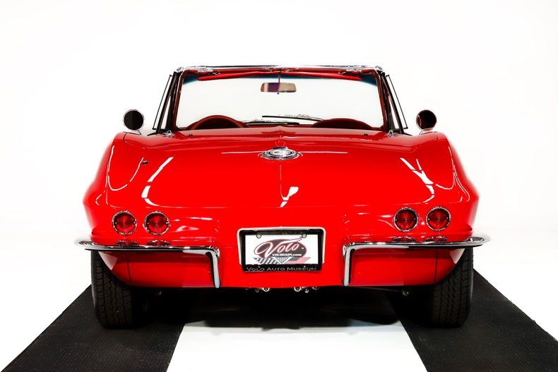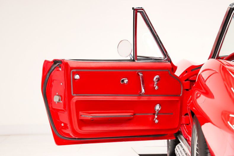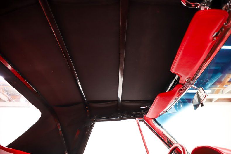 EXTERIOR: This paint is about as awesome as it gets! The body is pristine with precise gaps and excellent fitment, the headlights open and close properly. The red finish is laid out like glass and has been ceramic coated. It's topped off with a black metallic stinger stripe on the big block hood, giving it the perfect aggressive contrast. The trim, stainless, and chrome have been replaced, and it features bowtie mirrors along with a rich black cloth convertible top. The factory side exhaust looks incredible and sounds even better. It's sitting on BFGoodrich redline radial tires wrapped around reproduction knock-off wheels.
