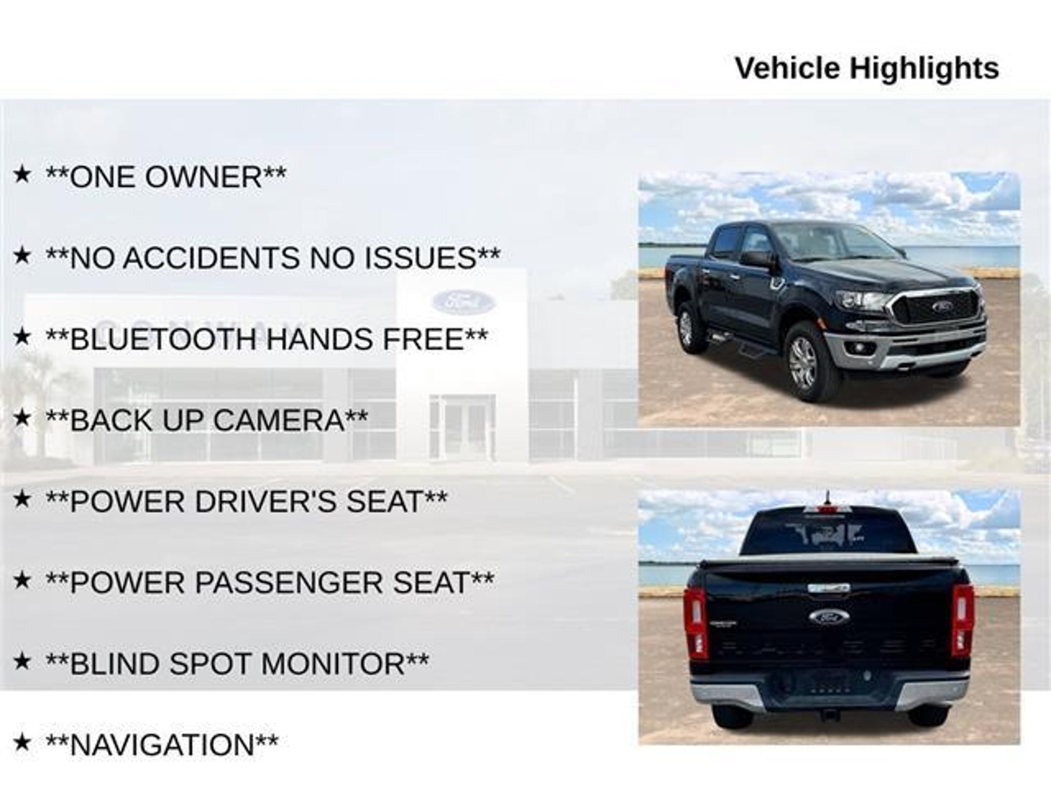 Experience the power and capability of the 2020 Ford Ranger XLT. This exceptional midsize truck combines rugged performance with advanced technology, delivering a driving experience that's both thrilling and refined. With its EcoBoost 2.3L I4 engine and 10-speed automatic transmission, the Ranger XLT offers impressive fuel efficiency without sacrificing towing capacity or off-road prowess. - Back-up camera - Blind spot monitor - Bluetooth hands-free - Fully serviced and detailed - Local trade-in - Navigation - No accidents, no issues - One owner - Power driver's and passenger's seats - Adaptive cruise control - Apple CarPlay and Android Auto - FordPass Connect - Keyless keypad - Lane keep assist - Locking differential - Remote start - Satellite radio - Sliding rear window - Trailer tow package The Ranger XLT's premium features don't stop there. This truck is equipped with the Equipment Group 302A Luxury package, which includes a sport appearance package, black grille with magnetic surround, magnetic wheel-lip molding, sport box decal, and power-folding side mirrors. The Technology Package adds forward sensing system and adaptive cruise control, while the Trailer Tow Package ensures you can haul your toys with confidence. Safety is a top priority, with features like electronic stability control, traction control, and a suite of airbags. The Ranger XLT also boasts impressive utility, with a Class IV trailer hitch receiver and exposed front tow hooks to handle your toughest jobs. Whether you're looking for a capable work truck or an adventurous weekend warrior, the 2020 Ford Ranger XLT is ready to take you there. Experience the perfect blend of power, technology, and versatility. Visit our showroom today and let us put you behind the wheel of this impressive midsize truck.