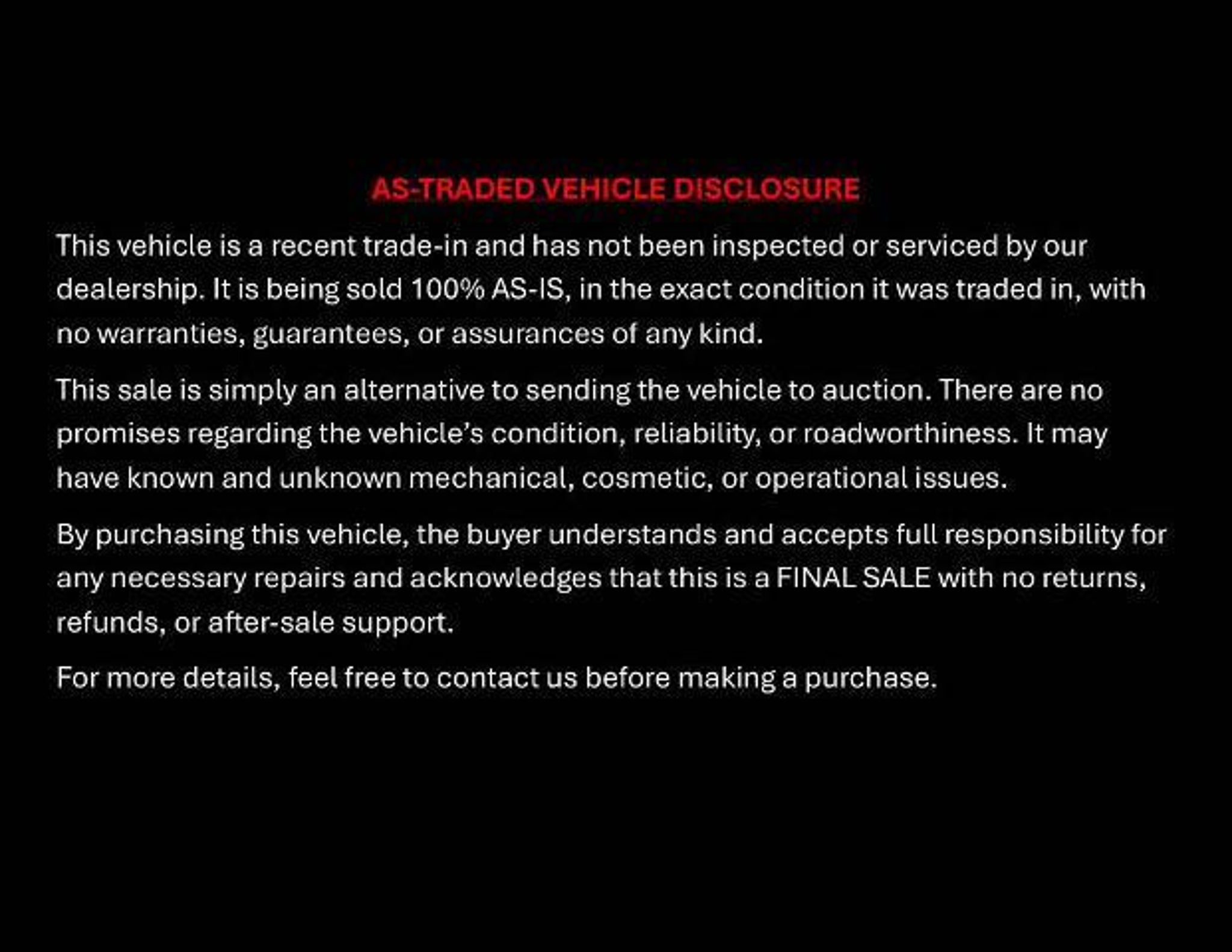 This vehicle is a recent trade-in and has not been inspected or serviced by Bayou Automotive. It is offered for sale strictly on an AS-IS basis, with no warranties, guarantees, or assurances of any kind provided by the dealership. This AS-IS sale serves as an alternative to sending the vehicle to auction. Bayou Automotive makes no representations regarding the vehicle's condition, reliability, or roadworthiness. The vehicle may have known or unknown mechanical, cosmetic, or operational issues. The buyer assumes all responsibility for any repairs or maintenance required after purchase. - 5TH WHEEL/GOOSENECK TOWING PREP GROUP - OFF ROAD PACKAGE - NIGHT EDITION - ANTI-SPIN DIFFERENTIAL REAR AXLE - POWER 2-WAY DRIVER LUMBAR ADJUST - CLEARANCE LAMPS - PAINTED FLAT WHEEL-TO-WHEEL SIDE STEPS - 9 ALPINE SPEAKERS W/SUBWOOFER - RADIO: UCONNECT 5 NAV W/12.0 DISPLAY - REMOTE START SYSTEM This 2024 Ram 2500 Big Horn is a powerful and versatile pickup built to handle your toughest jobs. Equipped with the legendary Cummins 6.7L I6 Turbodiesel engine and 4-wheel drive, this truck delivers exceptional performance and capability. The Off-Road Package adds rugged features like skid plates, performance-tuned shocks, and hill descent control, making it ready to tackle any terrain. The Night Edition package gives this Ram an aggressive, blacked-out style with features like black exterior badging, wheels, and grille. Inside, you'll find premium cloth bucket seats with power-adjustable lumbar support for all-day comfort. The Uconnect 5 infotainment system with a massive 12-inch touchscreen keeps you connected and entertained on the road. Whether you're hauling a heavy trailer, navigating off-road trails, or simply commuting in style, this 2024 Ram 2500 Big Horn is up for the challenge. Its combination of capability, technology, and bold styling make it a standout choice in the heavy-duty truck segment. We invite you to experience the power and versatility of this exceptional Ram 2500 for yourself. Schedule a test drive today and discover how this truck can transform the way you work and play. Bayou Automotive is a locally owned and operated dealership committed to providing a no-hassle, transparent car buying experience. Our primary goal is to deliver outstanding service and ensure every customer enjoys a positive and straightforward purchasing process. If you have any questions or concerns regarding your shopping experience, please feel free to contact our owner, Ben Gaiennie, directly at owners@bayouautomotive.com. We