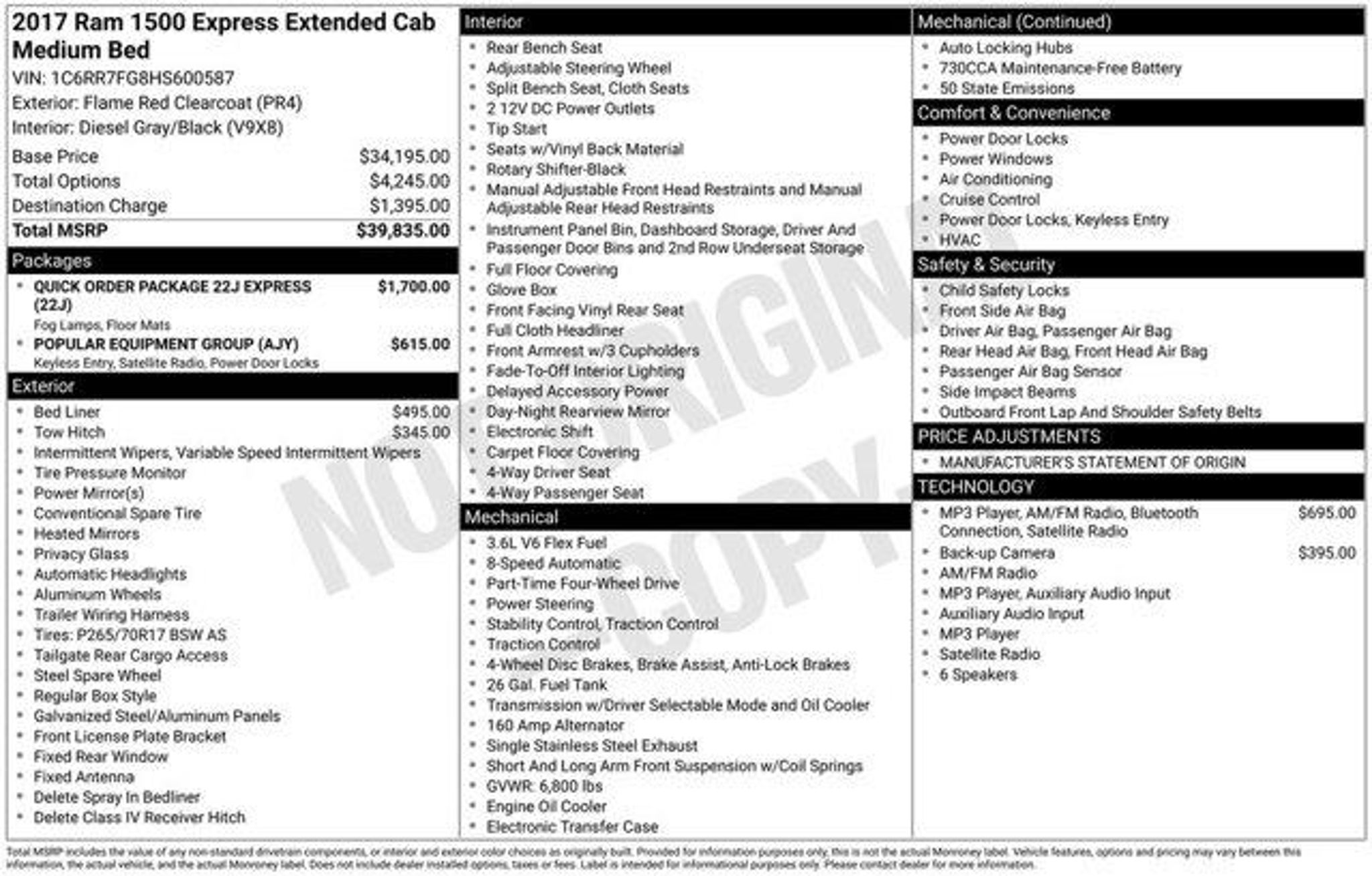 Certified. 2017 Ram 1500 Express Flame Red Clearcoat 4WD 8-Speed Automatic 3.6L V6 24V VVTWelcome to Mel Hambelton Ford in Wichita, KS. All of our cars are hand picked and inspected for your peace of mind. This 1500 is equipped with the following options: Popular Equipment Group (1-Year SiriusXM Radio Service, 40/20/40 Split Bench Seat, Cloth 40/20/40 Bench Seat, For More Info, Call 800-643-2112, Front Armrest w/3 Cupholders, No Satellite Coverage w/AK/HI/PR/VI, Rear Folding Seat, Remote Keyless Entry w/All-Secure, and SiriusXM Satellite Radio), Quick Order Package 22J Express (17 x 7 Aluminum Wheels, Body Color Front Fascia, Body Color Grille, Body Color Rear Bumper w/Step Pads, Carpet Floor Covering, Center Hub, Delete Class IV Receiver Hitch, Delete Spray In Bedliner, Fog Lamps, Front & Rear Floor Mats, and Ram 1500 Express), 17 x 7 Steel Wheels, 3.21 Rear Axle Ratio, 4-Wheel Disc Brakes, 5.0 Touchscreen Display, 6 Speakers, ABS brakes, Active Grille Shutters, Add Class IV Receiver Hitch, Add Spray In Bedliner, Air Conditioning, AM/FM radio, Audio Jack Input for Mobile Devices, Black Exterior Mirrors, Brake assist, Charge Only Remote USB Port, Delay-off headlights, Driver door bin, Dual front impact airbags, Dual front side impact airbags, Electronic Shift, Electronic Stability Control, Exterior Mirrors w/Heating Element, Front anti-roll bar, Front Center Armrest, Front wheel independent suspension, Fully automatic headlights, GPS Antenna Input, Heated door mirrors, Heavy Duty Vinyl 40/20/40 Split Bench Seat, Integrated Voice Command w/Bluetooth, Low tire pressure warning, Manufacturer's Statement of Origin, Media Hub (USB, AUX), Occupant sensing airbag, Overhead airbag, Overhead Console, ParkView Rear Back-Up Camera, Passenger door bin, Power door mirrors, Power steering, Power windows, Radio data system, Radio: 3.0, Radio: Uconnect 3 w/5 Display, Rear anti-roll bar, Rear step bumper, Remote USB Port, Rotary Shifter-Black, Speed control, Tachometer, Temperature & Compass Gauge, Tilt steering wheel, Tip Start, Traction control, Variably intermittent wipers, and Voltmeter.New tires installed!, New air and cabin air filters!, New front wiper blades!, Resurfaced front rotors!, Fresh oil and filter!.View our entire inventory at www.mhford.com. See your wait time for Quick Lane service with our NEW Online Quick Lane Check-in tool at http://www.mhford.com/online-quick-lane-check-in.htm. Visit http://www.mhford.com/featured-vehicles/pre-owned.htm so you won?t miss out on all of our great vehicle Specials!