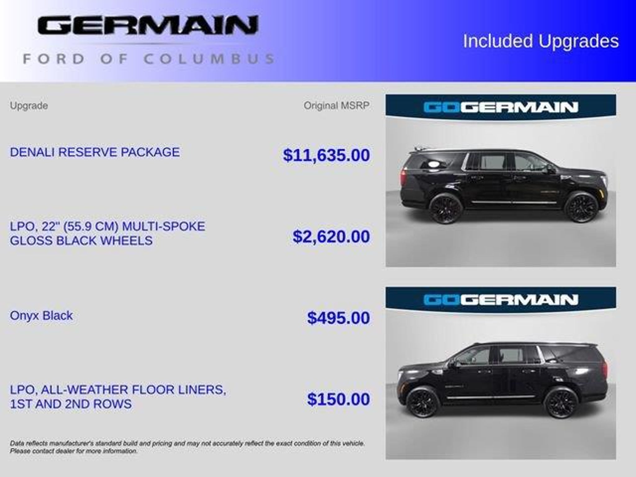 Advanced Technology Package, Denali Reserve Package, Dual-Pane Panoramic Power Sunroof, Max Trailering and Enhanced Trailering Technology Package, Power-Retractable Assist Steps. CARFAX One-Owner. Clean CARFAX. Onyx Black 4WD 10-Speed Automatic with Overdrive EcoTec3 6.2L V8WE HAVE INCLUDED 30 PHOTO'S OF OUR VEHICLES. PLEASE VISIT WWW.GERMAINFORD.COM. Recent Arrival!What is Live Market Pricing? Simple. Live Market Pricing provides the most competitive prices on all our pre-owned vehicles, all the time. Pre-owned Live Market Pricing is achieved by polling over 40,000 pre-owned websites every hour to ensure that every single customer receives real-time Value Pricing on every single Pre-Owned Vehicle we sell. We don't play the pricing games. See for yourself how we measure up to the competitors by. 2025 GMC Yukon XL Denali
