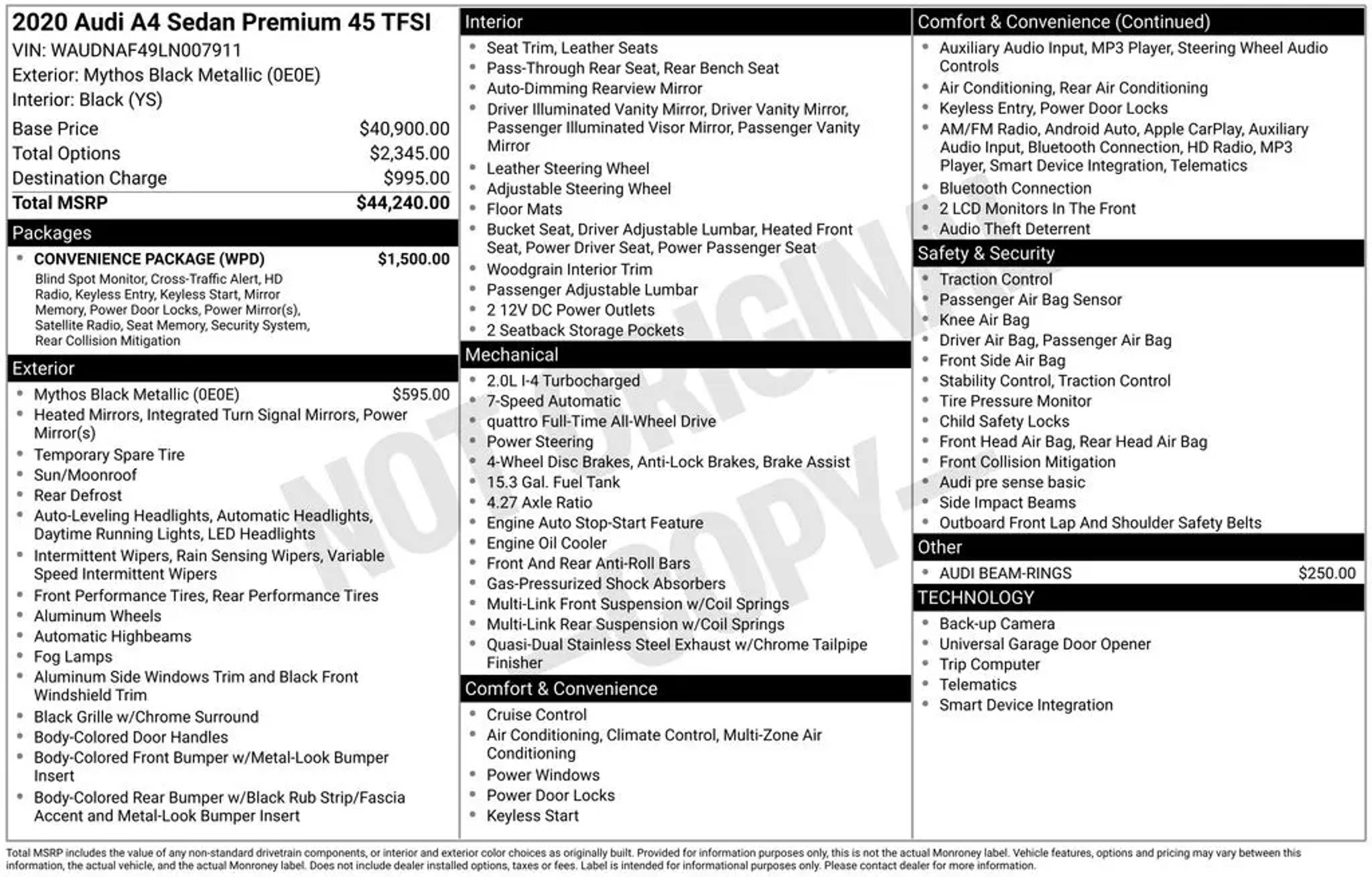 Discover the exceptional 2020 Audi A4 45 Premium quattro - a sophisticated and dynamic sedan that combines exhilarating performance with uncompromising luxury. This meticulously maintained Audi is the perfect blend of style, technology, and driving enjoyment, making it the ideal choice for the discerning automotive enthusiast. Boasting a striking Mythos Black Metallic exterior and a well-appointed Black interior, this A4 45 Premium quattro is a true head-turner. Complementing the sleek design are a host of premium features, including: - CONVENIENCE PACKAGE: Enjoy the added convenience of a memory driver's seat, auto-dimming exterior mirrors, an advanced alarm system, SiriusXM satellite radio, and Audi's innovative Side Assist with Pre Sense Rear technology. - AUDI BEAM-RINGS: Elevate your arrival with the distinctive Audi logo displayed on the lower door trim. Powered by a potent 2.0L I4 TFSI DOHC engine mated to a responsive 7-Speed Automatic S tronic transmission, this A4 delivers an exceptional balance of performance and efficiency, with an EPA-estimated 24 city / 32 highway MPG. Step inside the well-appointed cabin and you'll be surrounded by premium materials, including genuine wood accents and leather seating surfaces. Indulge in the comfort of heated front sport bucket seats, while the Audi Sound System and Audi smartphone interface with Apple CarPlay and Android Auto keep you connected and entertained. Safety and technology are also at the forefront, with features like Audi's Advanced Key, Rear View Camera, Audi Side Assist, and a comprehensive suite of airbags and driver-assist systems. The A4's quattro all-wheel-drive system ensures confident handling in a variety of road conditions, providing a truly engaging driving experience. With its impressive combination of performance, luxury, and advanced technology, this 2020 Audi A4 45 Premium quattro is a must-see for the discerning automotive enthusiast. We invite you to schedule a test drive and experience the unparalleled refinement and driving dynamics that have made the Audi brand a true benchmark in the luxury sedan segment.