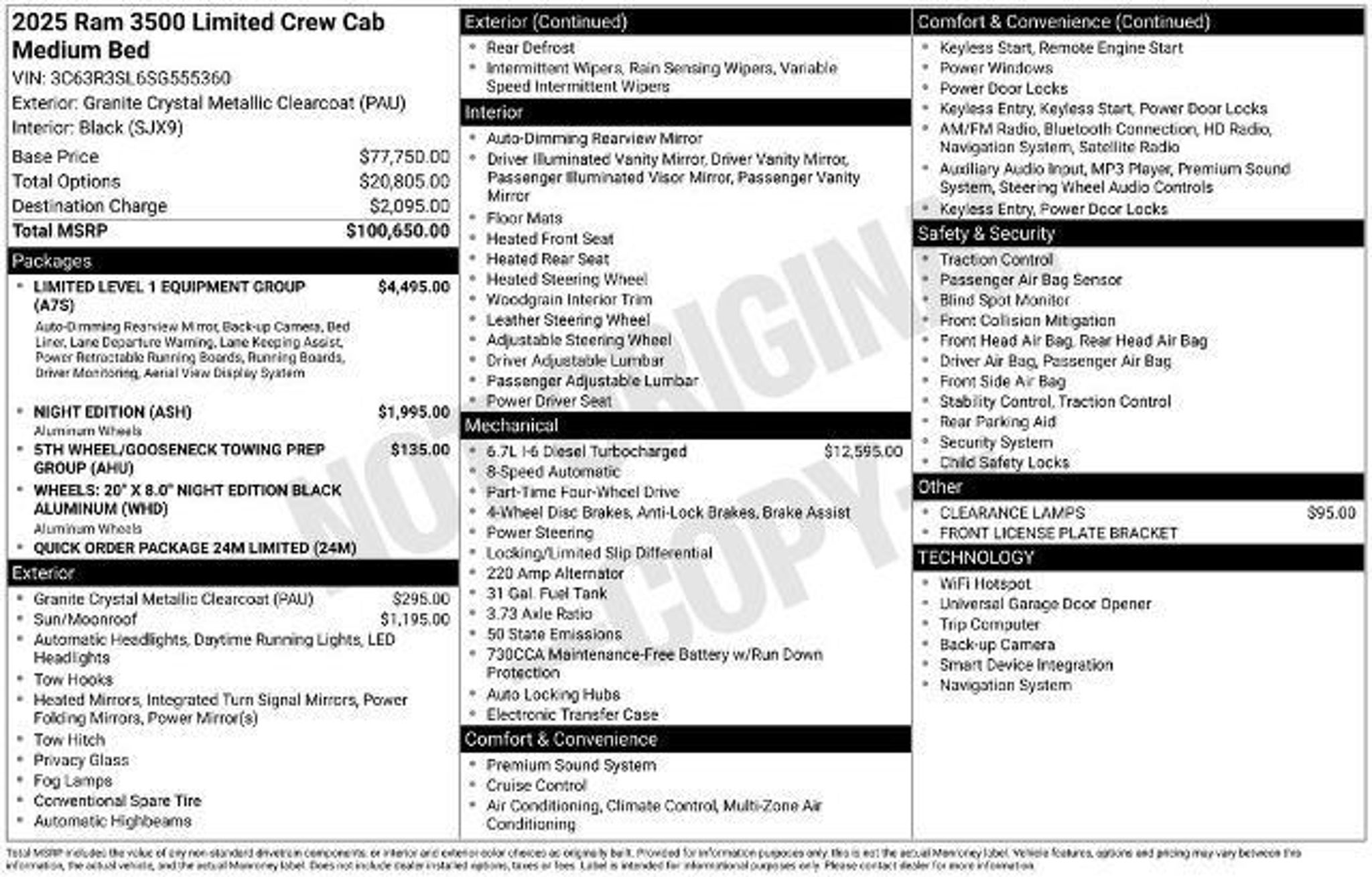 Details > 2025 RAM 3500 4X4 Limited Longhorn 4DR Crew Cab 6.3 FT. SB SRW Pickup For Sale in Dayton, OH Private Party Sellers Click here to place your ad now! You auta tell them you saw the ad in AutaBuy when you call or email. 1/34 2/34 3/34 4/34 5/34 6/34 7/34 8/34 9/34 10/34 11/34 12/34 13/34 14/34 15/34 16/34 17/34 18/34 19/34 20/34 21/34 22/34 23/34 24/34 25/34 26/34 27/34 28/34 29/34 30/34 31/34 32/34 33/34 34/34 View 34 Photos View All Add to My Garage Parked in Your Garage! Germain Ford of Beavercreek Contact Seller: I would like to: Make Offer Check Availability Ask A Question Request More Photos Check Financing Options Send a copy of this message to me Add this listing to my garage Send to Mobile Mileage 5,704 Exterior Color Granite Crystal Clearcoat Metallic Interior Color Black Doors 4 Engine 6.7L I6 Transmission 8 Speed Auto Stock # F612561A VIN 3C63R3SL6SG555360 Estimated Monthly Payment $1,443 mo Apply Now J.J. Best Banc & Co. 2025 RAM 3500 4X4 Limited Longhorn 4DR Crew Cab 6.3 FT. SB SRW Pickup Description: CARFAX One-Owner. The Right car, The Right price, The Right way. https://www.kbb.com/kbbreport/mw17t · Mileage: 5,704 · Color: Granite Crystal Clearcoat Metallic Price: $82,977. Price: $82,942. Mileage 5,704 Exterior Color Granite Crystal Clearcoat Metallic Interior Color Black Doors 4 Engine 6.7L I6 Transmission 8 Speed Auto Stock # F612561A VIN 3C63R3SL6SG555360 Estimated Monthly Payment $1,443 mo Apply Now J.J. Best Banc & Co. Add to My Garage Parked in Your Garage! Message Seller Germain Ford of Beavercreek Contact Seller: I would like to: Make Offer Check Availability Ask A Question Request More Photos Check Financing Options Send a copy of this message to me Add this listing to my garage Offered for sale by Germain Ford of Beavercreek DAYTON, OH Price: $82,977. Price: $82,942. Offered for sale by Germain Ford of Beavercreek DAYTON, OH [entire inventory] Ask Auta Intelligence The first collector-car AI built directly into a classic car marketplace What's the typical towing capacity in this configuration? How far is this from me? What transmission options did these offer? Tell me about this model What trim levels were available for this model? How easy are parts to find for this model? How many 3500s were produced in Granite Crystal Clearcoat Metallic? What does this VIN number tell me? Can you show me more pickups/trucks for a similar price? What kind of mileage do these get? How many of these were produced? What colors did these come in? What size tires does this run from the factory? Where is this located? What engine options did these come with? What factory options were available on this model? When was this model first introduced? Do you have a similar car to sell? List It Now! Questions about this car? Ask Auta Intelligence for production numbers, available options, etc. · Subscribe to AutaBuy! · Send a Gift Subscription Notice to a Friend