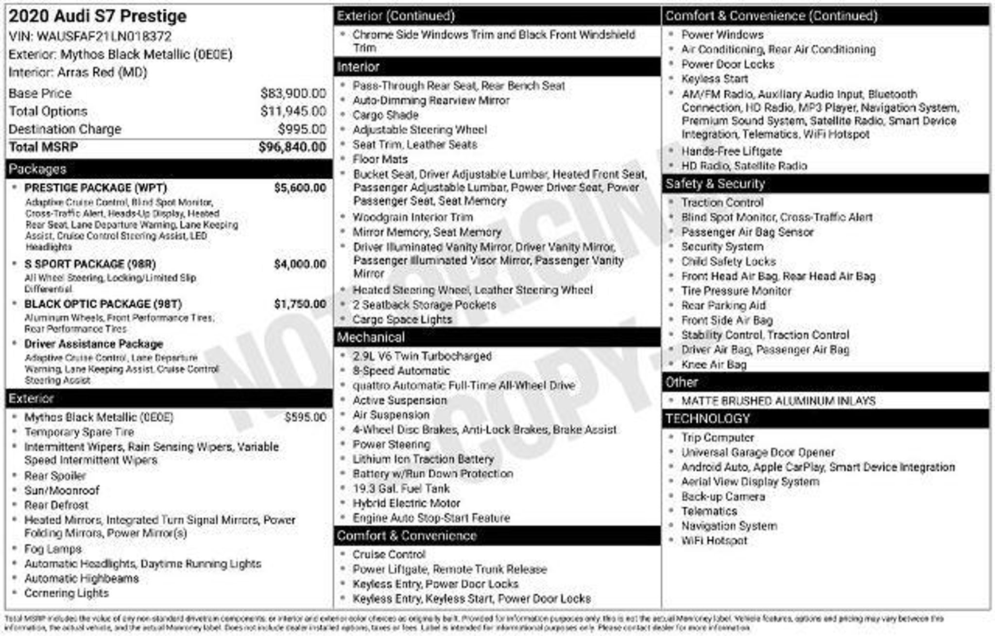 **UPFRONT NO HAGGLE PRICING**, **REVERSE SENSORS**, **SPORT SEATS**, **DUAL POWER SEATS**, **LEATHER SEATING**, **BLIND SPOT MONITOR!**, **AWD**, **PUSH BUTTON START**, **DIGITAL CLUSTER**, **NAVIGATION!**, **BACK-UP CAMERA**, **PRE-COLLISION ASSIST**, **APPLE CARPLAY**, **LANE KEEPING TECHNOLOGY**, **BLUE CERTIFIED**, Audi Side Assist w/Pre Sense Rear, Audi Side Assist w/Rear Cross Traffic, Black Optic Package, Driver Assistance Package, Dual Pane Acoustic Glass, Dynamic All-Wheel Steering, Head-Up Display, Power Soft-Closing Doors, Premium Air Quality w/Ionizer & Fragrance, Prestige Package, quattro Sport Rear Differential, Red Painted Brake Calipers, S Sport Package, S7 Executive Package, Sport Exhaust, Wheels: 21 5-V-Spoke-Star Design. quattro 2.9L V6 Turbocharged DOHC 24V LEV3-ULEV70 444hp Priced below KBB Fair Purchase Price! Odometer is 6919 miles below market average! Clean CARFAX. THE FORD BLUE ADVANTAGE: BLUE CERTIFIED 139 Point Inspection, Vehicle History,* Warranty Deductible: $100, * Roadside Assistance, * Limited Warranty: 3 Month/4,000 Mile (whichever comes first) after new car warranty expires or from certified purchase date, and 11,000 FordPass Rewards Points to use toward first maintenance visit. ALL VEHICLES ARE GUARANTEED 1 KEY and MAY NOT HAVE FLOORMATS UNLESS CPO or NEW. **WHY MULLINAX: UpFront Discounted Pricing SINCE 1970; No Dealer Fee; Hassle/Haggle FREE; ?WE PRICE OUR CARS, NOT OUR CUSTOMER!?