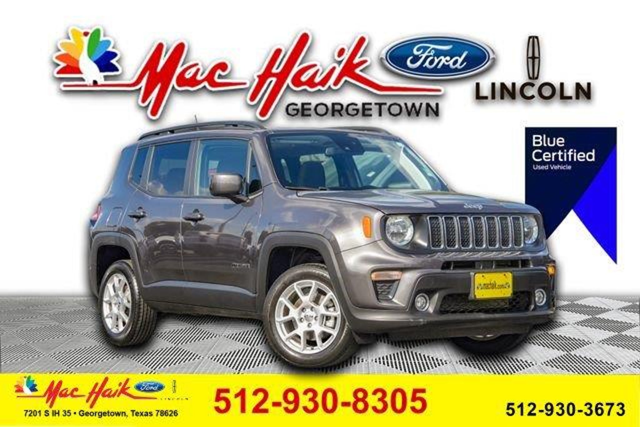 CARFAX One-Owner. Clean CARFAX. LOCAL TRADE, NON SMOKER, ONE OWNER, SERVICED HERE, OIL CHANGE, DETAILED, Renegade Latitude, 4D Sport Utility, 2.4L I4, 9-Speed 948TE Automatic, 4WD, Granite Crystal Metallic Clearcoat, Black Cloth. Odometer is 6949 miles below market average! 21/29 City/Highway MPG CALL 512-930-3673 TO SCHEDULE YOUR TEST DRIVE TODAY! This 2021 Jeep Renegade Latitude in Granite Crystal Metallic Clearcoat comes with the following features: 2.4L I4 9-Speed 948TE Automatic 4WD Convenience Group (115V Auxiliary Power Outlet, 40/20/40 Rear Seat w/Trunk Pass-Thru, All-Season Floor Mats, Auto-Dimming Rear-View Mirror, Heated Front Seats, Heated Steering Wheel, Manual Adjust 4-Way Front Passenger Seat, Power 4-Way Driver Lumbar Adjust, Power Adjust 8-Way Driver Seat, Rain Sensitive Windshield Wipers, Tonneau Cover, and Windshield Wiper De-Icer), Passive Entry Remote Start Package (Keyless Entry w/Panic Alarm and Remote Start System), Quick Order Package 2XB, Sun Sound Group (DISC) (Dual-Pane Panoramic Power Sunroof and Kenwood Premium Audio System), Renegade Latitude, 4D Sport Utility, 2.4L I4, 9-Speed 948TE Automatic, 4WD, Granite Crystal Metallic Clearcoat, Black Cloth, 17' x 7.0' Aluminum Wheels, 3.734 Final Drive Ratio, 4-Wheel Disc Brakes, 6 Speakers, ABS brakes, Air Conditioning, Alloy wheels, AM/FM radio: SiriusXM, Anti-whiplash front head restraints, Apple CarPlay/Android Auto, Automatic temperature control, Brake assist, Compass, Delay-off headlights, Driver door bin, Driver vanity mirror, Dual front impact airbags, Dual front side impact airbags, Electronic Stability Control, Emergency communication system: SiriusXM Guardian, Four wheel independent suspension, Front anti-roll bar, Front Bucket Seats, Front Center Armrest, Front dual zone A/C, Front fog lights, Front reading lights, Fully automatic headlights, Heated door mirrors, Illuminated entry, Knee airbag, Low tire pressure warning, Normal Duty Suspension, Occupant sensing airbag, Outside temperature display, Overhead airbag, Panic alarm, ParkView Rear Back-Up Camera, Passenger door bin, Passenger vanity mirror, Power door mirrors, Power steering, Power windows, Premium Cloth Bucket Seats, Radio data system, Radio: Uconnect 4 w/7' Display, Rear anti-roll bar, Rear window defroster, Rear window wiper, Remote keyless entry, Roof rack: rails only, Security system, Speed control, Split folding rear seat, Spoiler, Steering wheel mounted audio controls, Tachometer, Telescoping steering wheel, Tilt steering wheel, Traction control, Trip comp