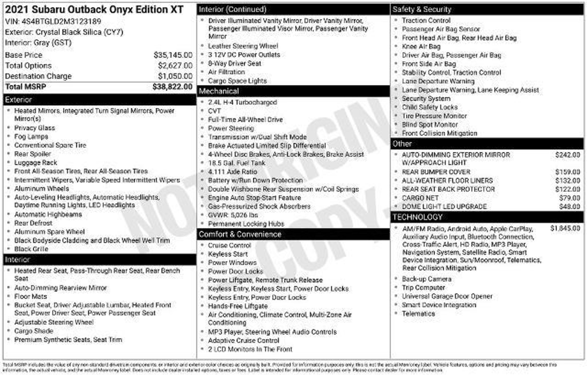 This OUTBACK ONYX EDITION XT has a calm, solid feel to it. The 2.4L H-4 TURBOCHARGED ENGINE gives you smooth, steady power, especially nice when you're heading along the river roads near Guttenberg or making a longer run. FULL-TIME ALL-WHEEL DRIVE just handles Iowa weather without much thought, and ADAPTIVE CRUISE CONTROL takes a little edge off highway drives. The HANDS-FREE POWER LIFTGATE comes in handy more than you'd expect groceries, gear, whatever the day brings. You've got HEATED FRONT SEATS and a HEATED REAR SEAT, so no ones fighting over comfort in the winter. Its practical, quiet, and easy to settle into. Come take a walk around it and see what you think.