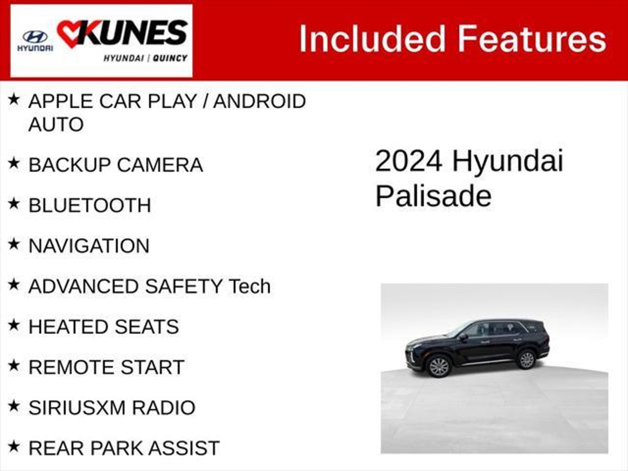 Details > 2024 Hyundai Palisade AWD SEL 4DR SUV For Sale in Quincy, IL Private Party Sellers Click here to place your ad now! You auta tell them you saw the ad in AutaBuy when you call or email. 1/34 2/34 3/34 4/34 5/34 6/34 7/34 8/34 9/34 10/34 11/34 12/34 13/34 14/34 15/34 16/34 17/34 18/34 19/34 20/34 21/34 22/34 23/34 24/34 25/34 26/34 27/34 28/34 29/34 30/34 31/34 32/34 33/34 34/34 View 34 Photos View All Add to My Garage Parked in Your Garage! Kunes Country Hyundai of Quincy Contact Seller: I would like to: Make Offer Check Availability Ask A Question Request More Photos Check Financing Options Send a copy of this message to me Add this listing to my garage Send to Mobile Mileage 43,556 Exterior Color Abyss Black Pearl Interior Color Gray/Black Doors 4 Engine 3.8L V6 Transmission 8 Speed Auto Stock # 14P1001 Ad ID 108732323 VIN KM8R2DGEXRU751814 Estimated Monthly Payment $573 mo Apply Now J.J. Best Banc & Co. 2024 Hyundai Palisade AWD SEL 4DR SUV Description: Kunes Country Hyundai of Quincy · Mileage: 43,556 · Color: Abyss Black Pearl Price: $33,810. Price: $32,949. Mileage 43,556 Exterior Color Abyss Black Pearl Interior Color Gray/Black Doors 4 Engine 3.8L V6 Transmission 8 Speed Auto Stock # 14P1001 Ad ID 108732323 VIN KM8R2DGEXRU751814 Estimated Monthly Payment $573 mo Apply Now J.J. Best Banc & Co. Add to My Garage Parked in Your Garage! Message Seller Kunes Country Hyundai of Quincy Contact Seller: I would like to: Make Offer Check Availability Ask A Question Request More Photos Check Financing Options Send a copy of this message to me Add this listing to my garage Offered for sale by Kunes Country Hyundai of Quincy QUINCY, IL Price: $33,810. Price: $32,949. Offered for sale by Kunes Country Hyundai of Quincy QUINCY, IL [entire inventory] Ask Auta Intelligence The first collector-car AI built directly into a classic car marketplace What engine options did these come with? Where is this located? What safety features does this model offer? Tell me about this model What transmission options did these offer? What kind of mileage do these get? How many Palisades were produced in Black? What does this VIN number tell me? How many of these were produced? How many passengers can this seat comfortably? What trim levels were available for this model? Can you show me more suvs for a similar price? How far is this from me? What colors did these come in? When was this model first introduced? What factory options were available on this model? How easy are parts to find for this model? Do you have a similar car to sell? List It Now! Questions about this car? Ask Auta Intelligence for production numbers, available options, etc. · Subscribe to AutaBuy! · Send a Gift Subscription Notice to a Friend