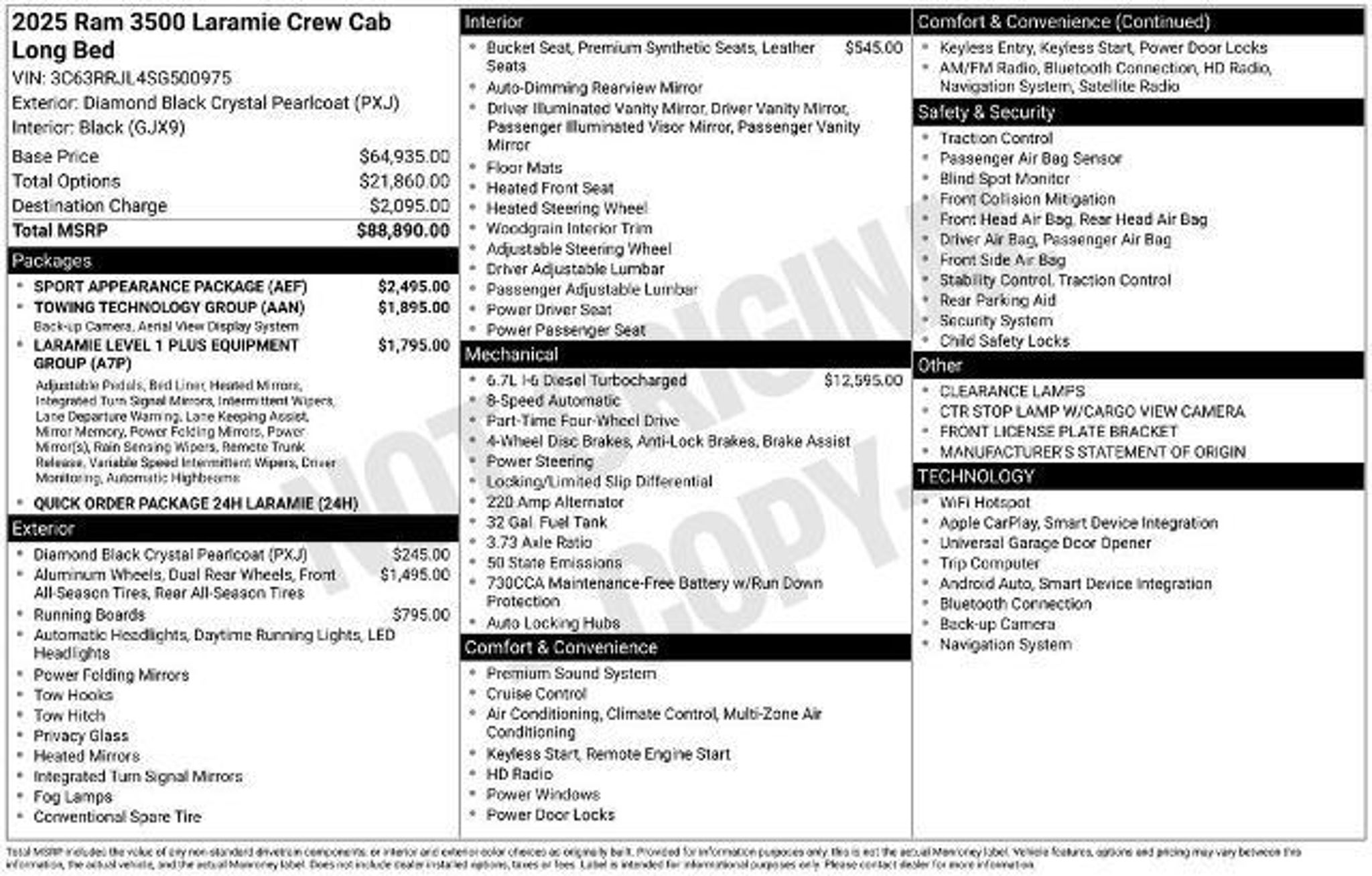Recent Arrival! Diamond Black Crystal Pearlcoat 2025 Ram 3500 Laramie 4WD 6.7L I6 Diamond Black Crystal PearlCoat Exterior Paint $245 3.42 Axle Ratio Towing Technology Group $1,595 SurroundView Camera System Trailer Reverse Guidance Trailer Tire Pressure Monitoring System Sport Appearance Package $1,295 BodyColor GrilleSurround Sport Performance Hood Laramie Level 1 Plus Equipment Group $1,795 Power Adjustable Pedals with Memory Dual Wireless Charging Pad Traffic Sign Recognition Deployable BedStep by Mopar Drowsy Driver Detection Active LaneManagement System Power Heat/Fold/Telescoping Memory Mirrors AutomaticDimming Exterior PassengerMirror Automatic AdjustinReverse Exterior Mirrors Auto Dimming Exterior Mirror Center Stop Lamp with CargoView Camera LeatherTrimmed Bucket Seats LED Bed Lighting RainSensitive Windshield Wipers Remote TailgateRelease SprayIn Bedliner by Mopar Adaptive Steering System 2ndRow InFloor Storage Bins 6.7L I6 Cummins HO Turbo Diesel Engine $12,595 3.42 Axle Ratio Chrome Flat CabLength SideSteps $795 Dual Rear Wheels $1,495 17Inch Steel Spare Wheel 17Inch x 6.0Inch Polished Aluminum Wheels LT235/80R17E BSW AllSeason Tires Center Hub Box and Rear Fender Clearance Lamps You can Fill out a Free Super Quick Pre-Approval Credit Application here! https://www.smartfordsouthboston.com/finance/apply-for-financing/ FINANCING FOR ALL TYPES OF CREDIT! SLOW PAYMENTS, BANKRUPTCY, REPOSESSION, COLLECTIONS, JUDGEMENTS, DIVORCE NO PROBLEM! MONTHLY PAYMENTS TO FIT ANY INCOME! TRADE-INS WELCOME! WE BUY CARS Everyday, Even if you don't buy ours! Prices do not include additional fees and costs of closing, including government fees and taxes, any finance charges, any dealer administrative fees, any emissions testing fees or other fees. All prices, specifications and availability subject to change without notice. Contact dealer for most current information. Laramie Level 1 Plus Equipment Group (#1 Seat Foam Cushion, 115V Auxiliary Rear Power Outlet, 2 Way Rear Headrest Seat, 2nd Row In Floor Storage Bins, 4 Way Front Headrests, Active Lane Management System, Adaptive Steering System, Auto Adjust In Reverse Exterior Mirrors, Auto Dimming Exterior Passenger Mirror, Auto High Beam Headlamp Control, Auto Power-Folding Mirrors, Auto-Dimming Exterior Mirrors, Bucket Seats, Chrome Exterior Mirrors, CTR Stop Lamp w/Cargo View Camera, Drowsy Driver Detection, Dual Wireless Charging Pad, Exterior Mirrors Courtesy Lamps, Exterior Mirrors w/Heating Element, Exterior Mirrors w/Memory, Exterior Mirrors w/Supplemental Signals, Foam Bottle Insert (Door Trim Panel), Folding Flat Load Floor Storage, Forward & Reverse Utility Lights, Front Seat Back Map Pockets, Full Length Upgraded Floor Console, Heated Front Seats, Heated Steering Wheel, High Back Seats, Leather Trimmed Bucket Seats, LED Bed Lighting, Mirror Running Lights, MOPAR Deployable Bed Step, MOPAR Spray In Bedliner, Power 2-Way Driver Lumbar Adjust, Power 2-Way Passenger Lumbar Adjust, Power Adjust 8-Way Driver Seat, Power Adjust 8-Way Front Passenger Seat, Power Adjust Mirrors, Power Adjustable Pedals w/Memory, Power Heat Fold Memory Telescopic Mirrors, Power Telescoping Mirrors, Power-Adjustable Convex Aux Mirrors, Rain Sensitive Windshield Wipers, Rear 60/40 Folding Seat, Remote Tailgate Release, and Traffic Sign Recognition), Quick Order Package 24H Laramie, Sport Appearance Package (Body Color Grille Surround, Sport Decal, and Sport Performance Hood), Towing Technology Group (Surround View Camera System, Trailer Reverse Guidance, and Trailer Tire Pressure Monitoring System), 10 Speakers, 4-Wheel Disc Brakes, 4G LTE Wi-Fi Hot Spot, 6000# Front Axle w/Hub Ext, ABS brakes, Air Conditioning, Alexa Built-In, Alloy wheels, AM/FM radio: SiriusXM with 360L, Apple C