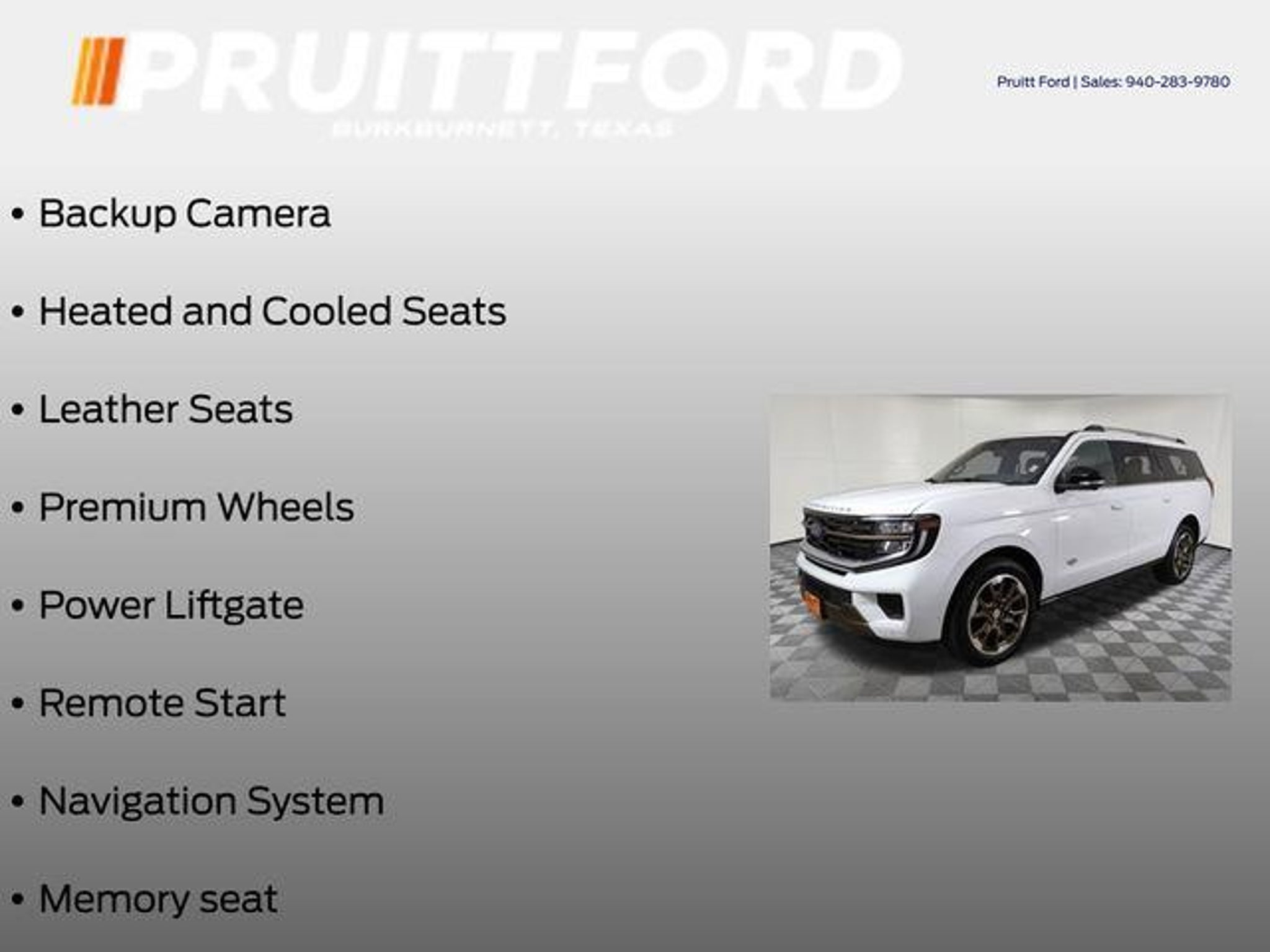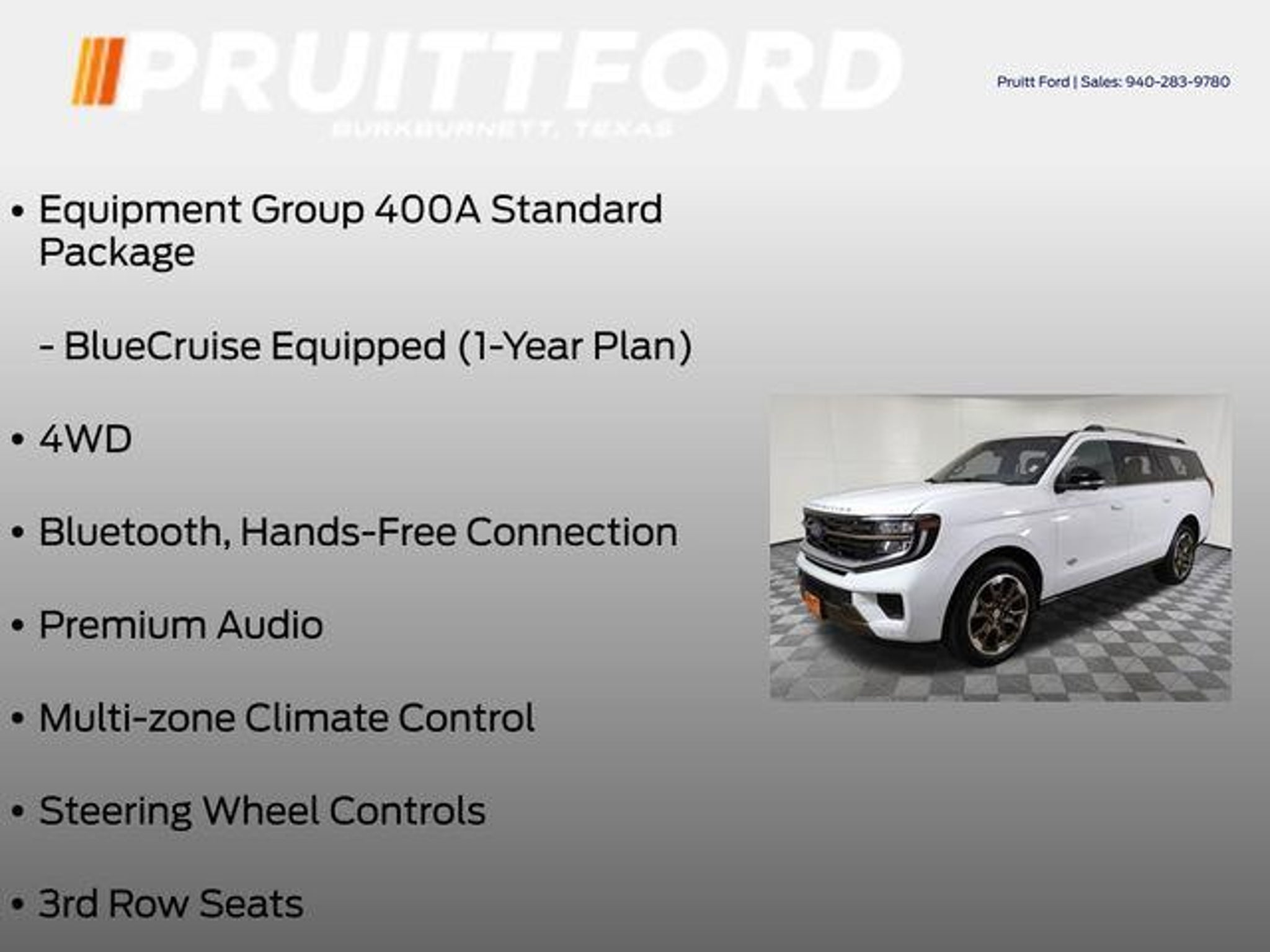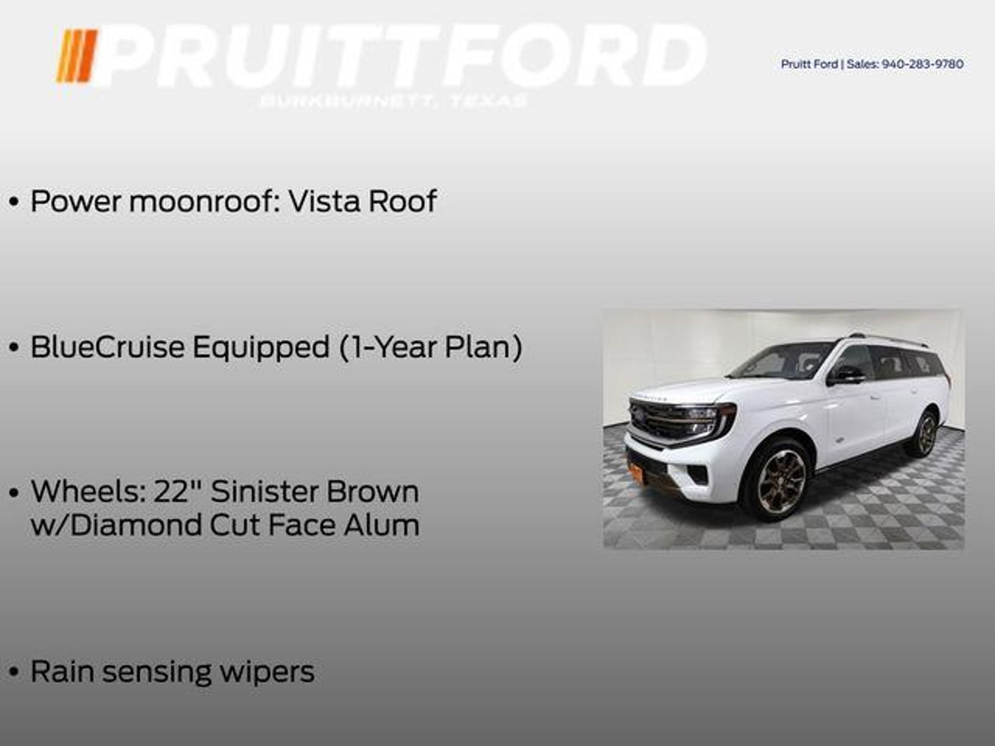 Discover the ultimate in luxury and capability with the 2025 Ford Expedition Max King Ranch. This exceptional SUV is a true testament to Ford's commitment to crafting vehicles that seamlessly blend power, technology, and refined sophistication. Boasting an impressive array of features, the Expedition Max King Ranch is designed to elevate your driving experience. Key highlights include: - 3rd Row Seats - 4WD - Backup Camera - Bluetooth, Hands-Free Connection - Heated and Cooled Seats - Leather Seats - Multi-zone Climate Control - Power Liftgate - Premium Audio - Premium Wheels - Remote Start - Steering Wheel Controls Beyond these impressive amenities, the Expedition Max King Ranch also offers the Connectivity Package, providing you with a one-time purchase solution to stay connected on the go. Additionally, the standard Equipment Group 400A package ensures you have all the essential features you desire. The true standout features of this vehicle include the Memory Seat, BlueCruise Equipped (1-Year Plan), Navigation System, Power Moonroof, and the stunning 22 Sinister Brown with Diamond Cut Face Aluminum Wheels. These premium elements elevate the Expedition Max King Ranch to a level of unparalleled luxury and convenience. Powered by the EcoBoost 3.5L V6 GTDi DOHC 24V Twin Turbocharged engine, this SUV delivers exceptional performance and efficiency, seamlessly paired with a 10-Speed Automatic transmission and 4WD capabilities. Whether you're navigating city streets or tackling off-road adventures, the Expedition Max King Ranch is ready to take you there with confidence and style. Imagine the possibilities that await you in this remarkable 2025 Ford Expedition Max King Ranch. Experience the perfect blend of utility, technology, and refined elegance that will transform your driving experience. Visit our showroom today to witness the impressive capabilities of this exceptional SUV and discover how it can enhance your lifestyle.