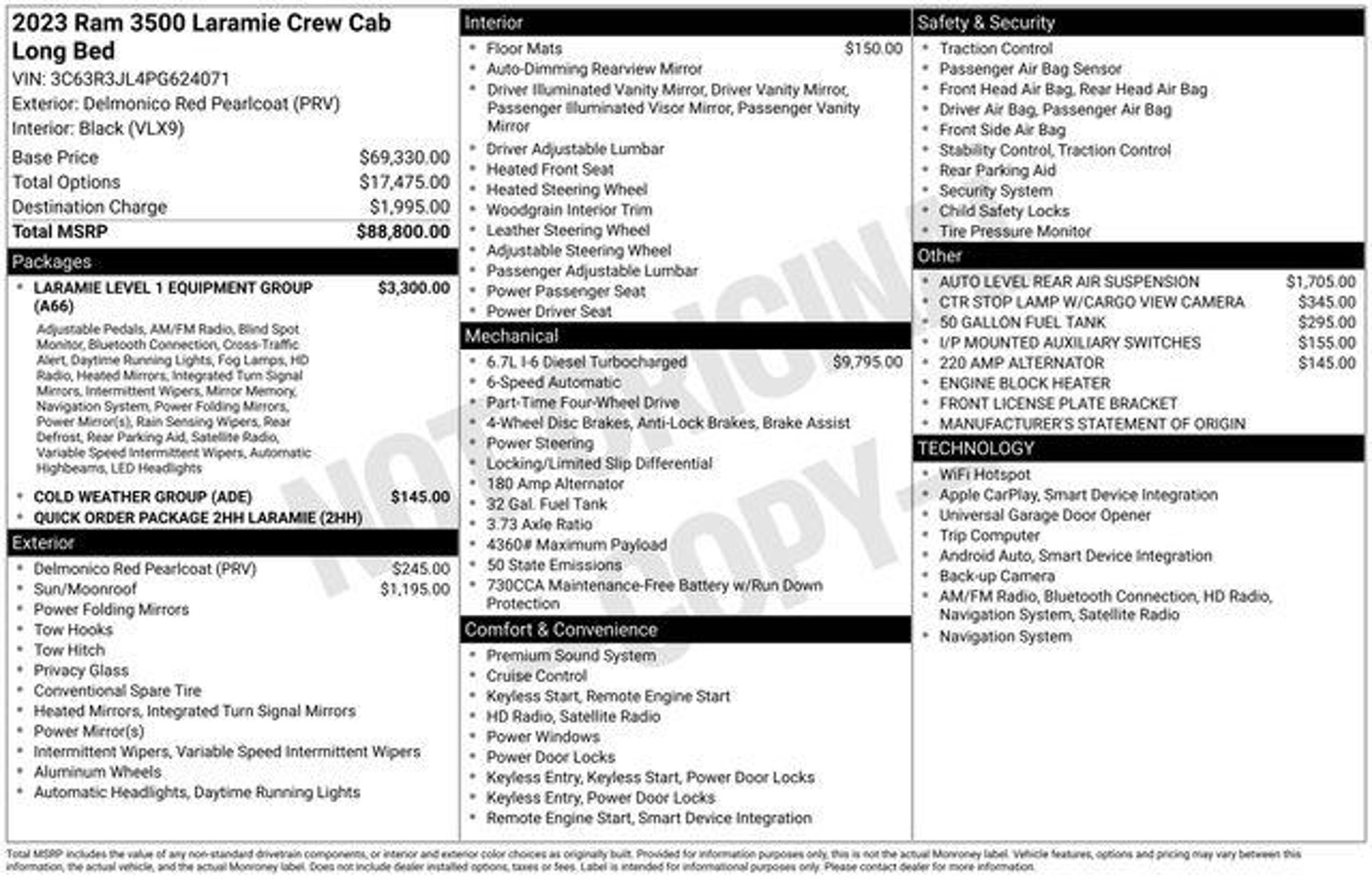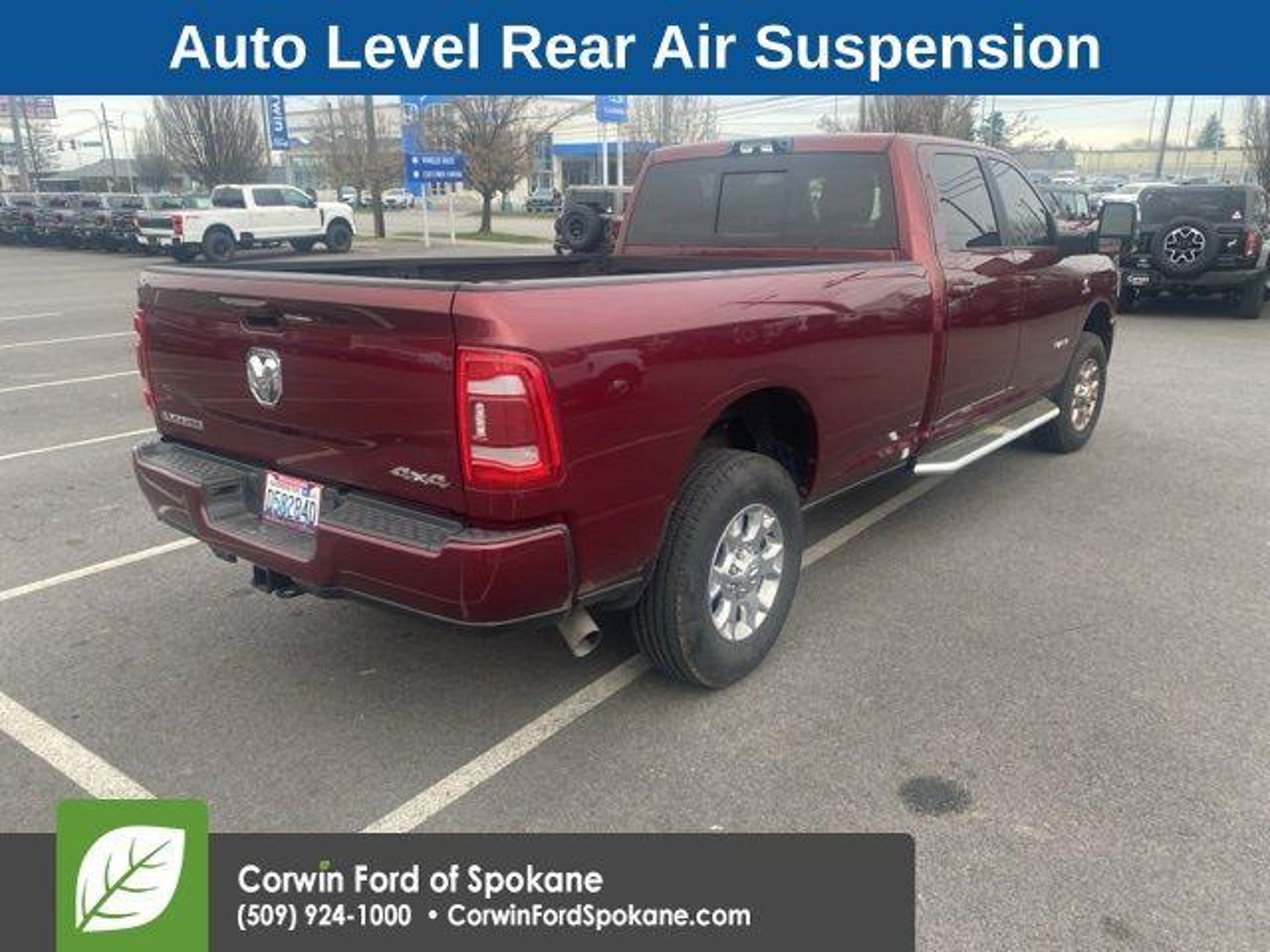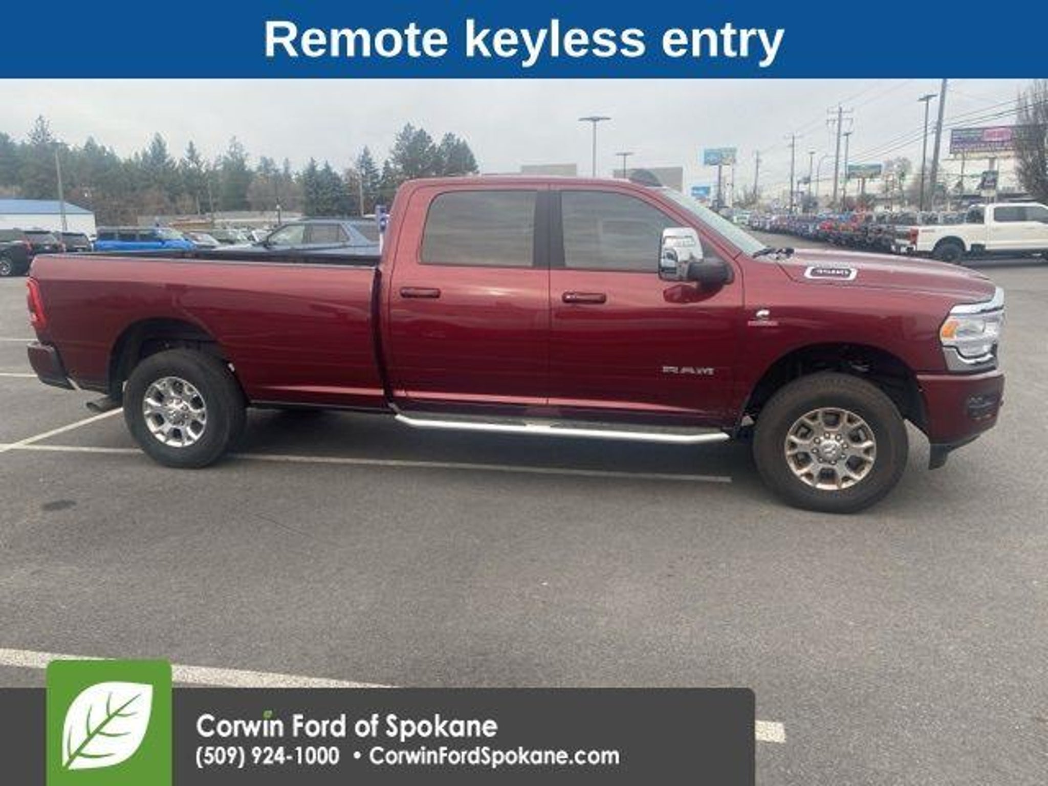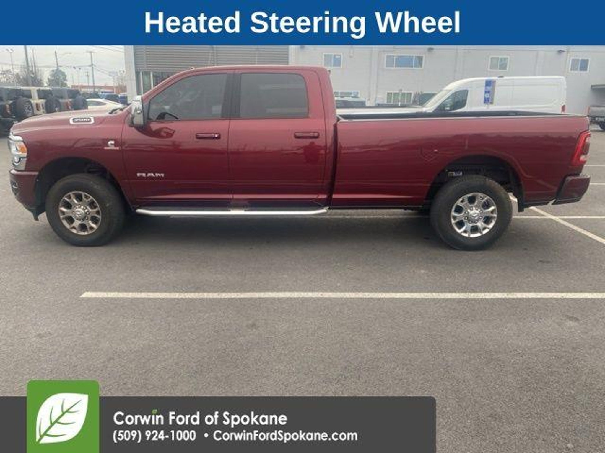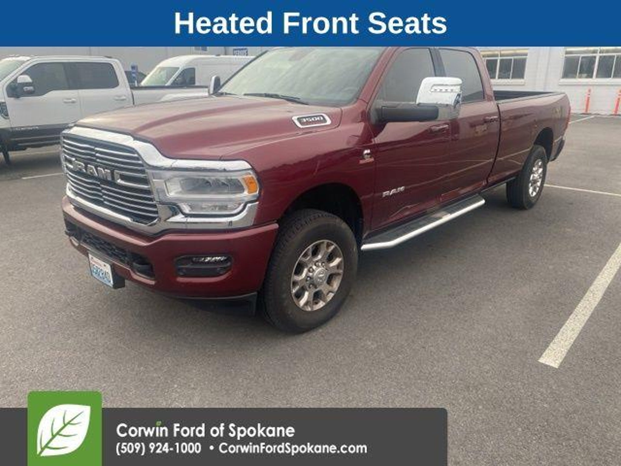 Discover the ultimate in power, capability, and comfort with the 2023 Ram 3500 Laramie. This extraordinary truck is engineered to conquer any challenge, whether you're tackling tough terrain or navigating the city streets. - Backup Camera - Panoramic Moonroof - Remote Start - Remote Tailgate Release - Heated Steering Wheel - Keyless Entry - Heated Front Seats - Auto Level Rear Air Suspension - 50 Gallon Fuel Tank The Laramie's impressive Cummins 6.7L I6 Turbodiesel engine, paired with a 6-speed automatic transmission and 4-wheel drive, delivers unparalleled performance and efficiency. With a best-in-class maximum towing capacity of over 35,000 lbs, this truck is ready to handle any job, from hauling heavy equipment to towing your favorite toys. Indulge in the ultimate in comfort and convenience with features like the heated steering wheel, heated front seats, and power sunroof. The Laramie's luxurious interior, complete with premium leather-trimmed upholstery and advanced technology, ensures you'll enjoy every mile of your journey. Safety is paramount in the Ram 3500 Laramie, with advanced driver-assistance features like Blind Spot Monitoring, Rear Cross-Path Detection, and the ParkSense Front/Rear Park Assist System. You'll have peace of mind knowing you and your loved ones are protected on the road. Experience the ultimate in power, capability, and refinement with the 2023 Ram 3500 Laramie. Visit our showroom today and let us demonstrate why this exceptional truck should be your next vehicle. See us today at Corwin Ford Spokane. Family owned for over 100 years! Excellent selection of New and Used vehicles, Financing options. Serving Spokane, Pasco, Kennewick, Richland, Walla Walla, Hermiston, Umatilla, Yakima, Sunnyside, Grandview, Dayton, Prescott, Denton County, Franklin County, Yakima County, Spokane County, Adams County, Grant County, and the Greater Columbia Basin. *All Prices plus applicable sales tax, license, and a negotiable documentary service fee up to $200 may be added to sales price or capitalized cost of the vehicle. One vehicle unless otherwise noted and subject to prior sale without notice. While supplies last. EPA mileage estimates are for newly manufactured vehicles only. Your actual mileage will vary depending on how you drive and maintain your vehicle.