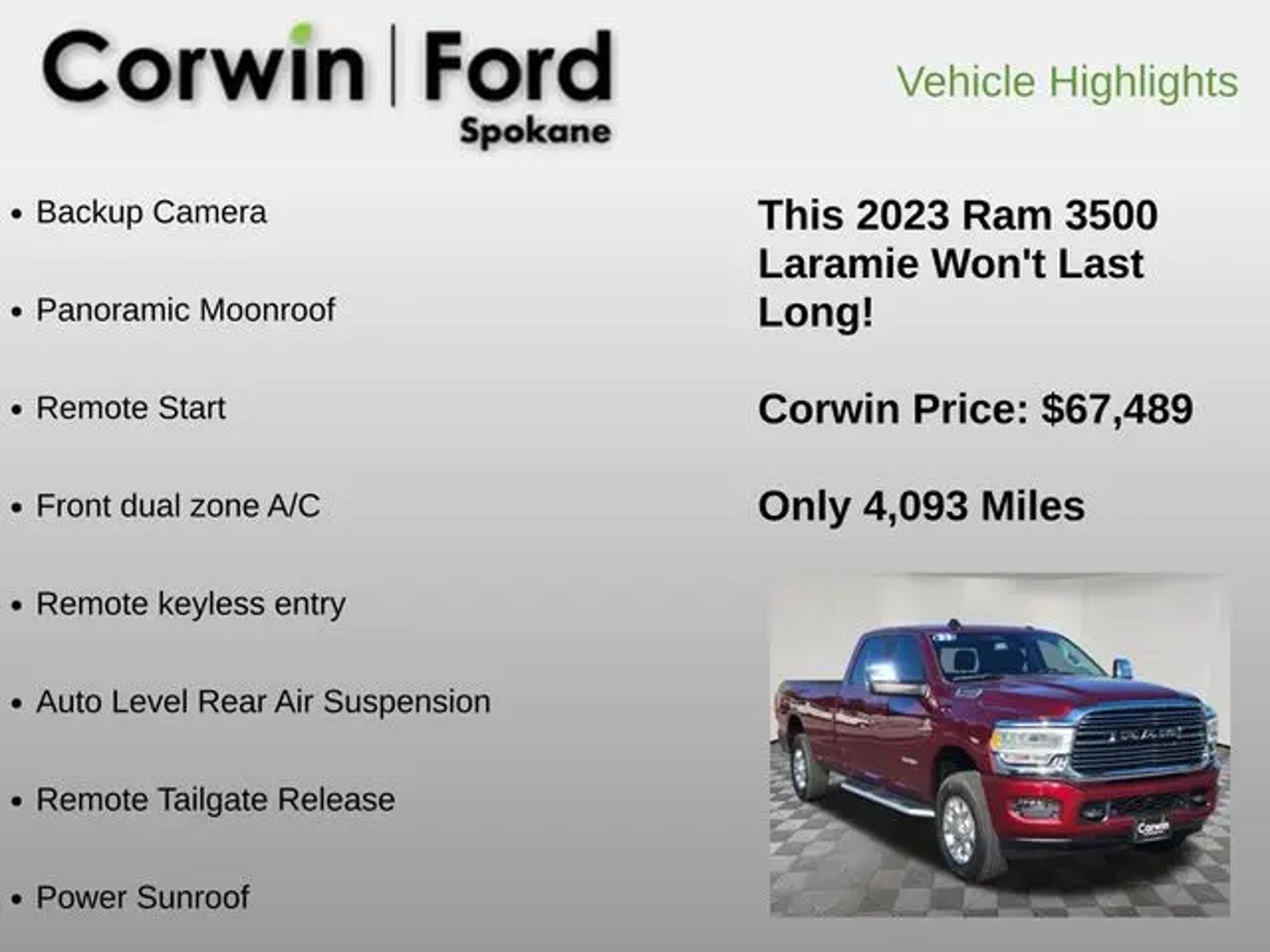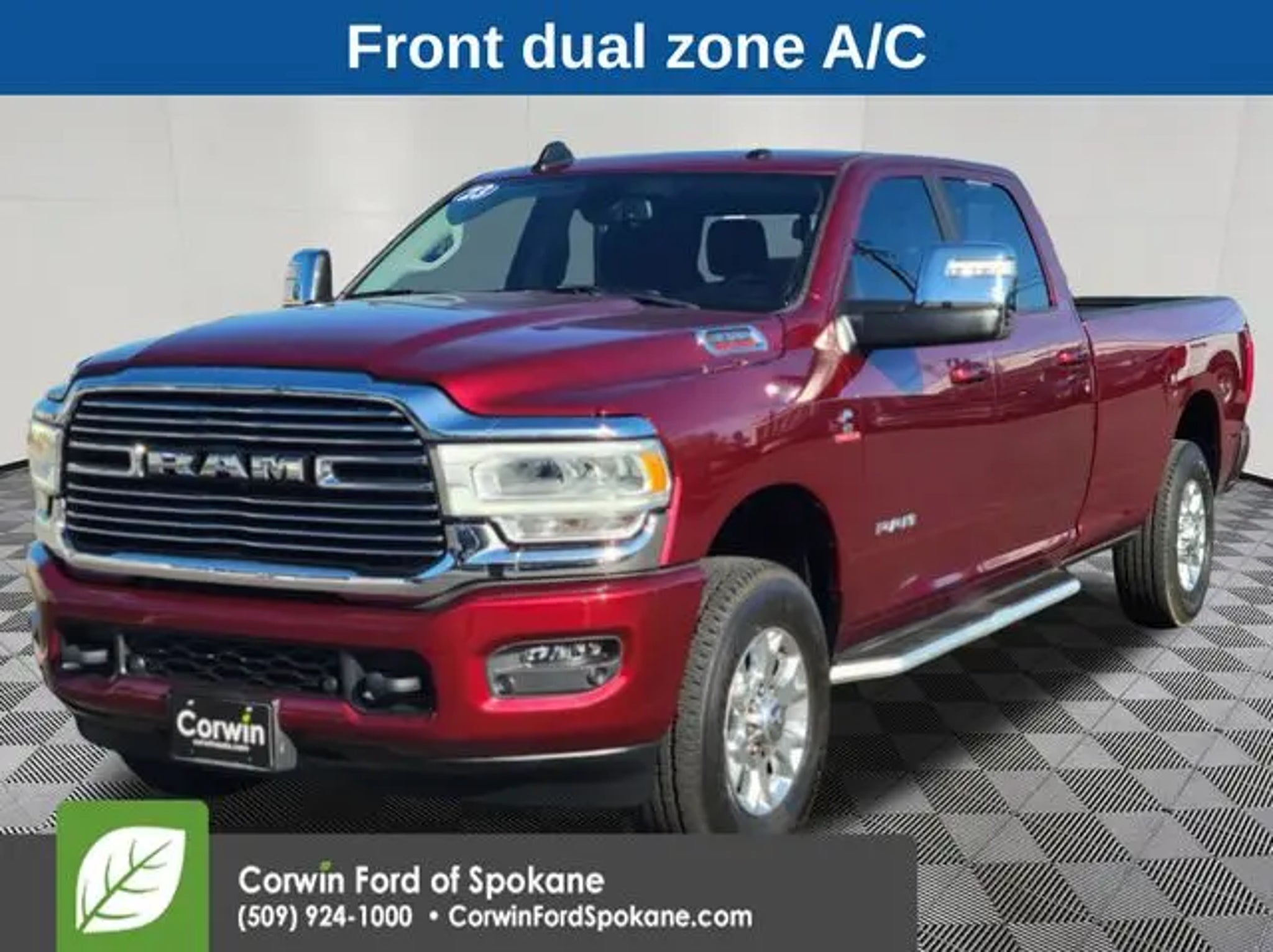 Discover the ultimate in power, capability, and comfort with the 2023 Ram 3500 Laramie. This extraordinary truck is engineered to conquer any challenge, whether you're tackling tough terrain or navigating the city streets. - Backup Camera - Panoramic Moonroof - Remote Start - Remote Tailgate Release - Heated Steering Wheel - Keyless Entry - Heated Front Seats - Auto Level Rear Air Suspension - 50 Gallon Fuel Tank The Laramie's impressive Cummins 6.7L I6 Turbodiesel engine, paired with a 6-speed automatic transmission and 4-wheel drive, delivers unparalleled performance and efficiency. With a best-in-class maximum towing capacity of over 35,000 lbs, this truck is ready to handle any job, from hauling heavy equipment to towing your favorite toys. Indulge in the ultimate in comfort and convenience with features like the heated steering wheel, heated front seats, and power sunroof. The Laramie's luxurious interior, complete with premium leather-trimmed upholstery and advanced technology, ensures you'll enjoy every mile of your journey. Safety is paramount in the Ram 3500 Laramie, with advanced driver-assistance features like Blind Spot Monitoring, Rear Cross-Path Detection, and the ParkSense Front/Rear Park Assist System. You'll have peace of mind knowing you and your loved ones are protected on the road. Experience the ultimate in power, capability, and refinement with the 2023 Ram 3500 Laramie. Visit our showroom today and let us demonstrate why this exceptional truck should be your next vehicle. See us today at Corwin Ford Spokane. Family owned for over 100 years! Excellent selection of New and Used vehicles, Financing options. Serving Spokane, Pasco, Kennewick, Richland, Walla Walla, Hermiston, Umatilla, Yakima, Sunnyside, Grandview, Dayton, Prescott, Denton County, Franklin County, Yakima County, Spokane County, Adams County, Grant County, and the Greater Columbia Basin. *All Prices plus applicable sales tax, license, and a negotiable documentary service fee up to $200 may be added to sales price or capitalized cost of the vehicle. One vehicle unless otherwise noted and subject to prior sale without notice. While supplies last. EPA mileage estimates are for newly manufactured vehicles only. Your actual mileage will vary depending on how you drive and maintain your vehicle.