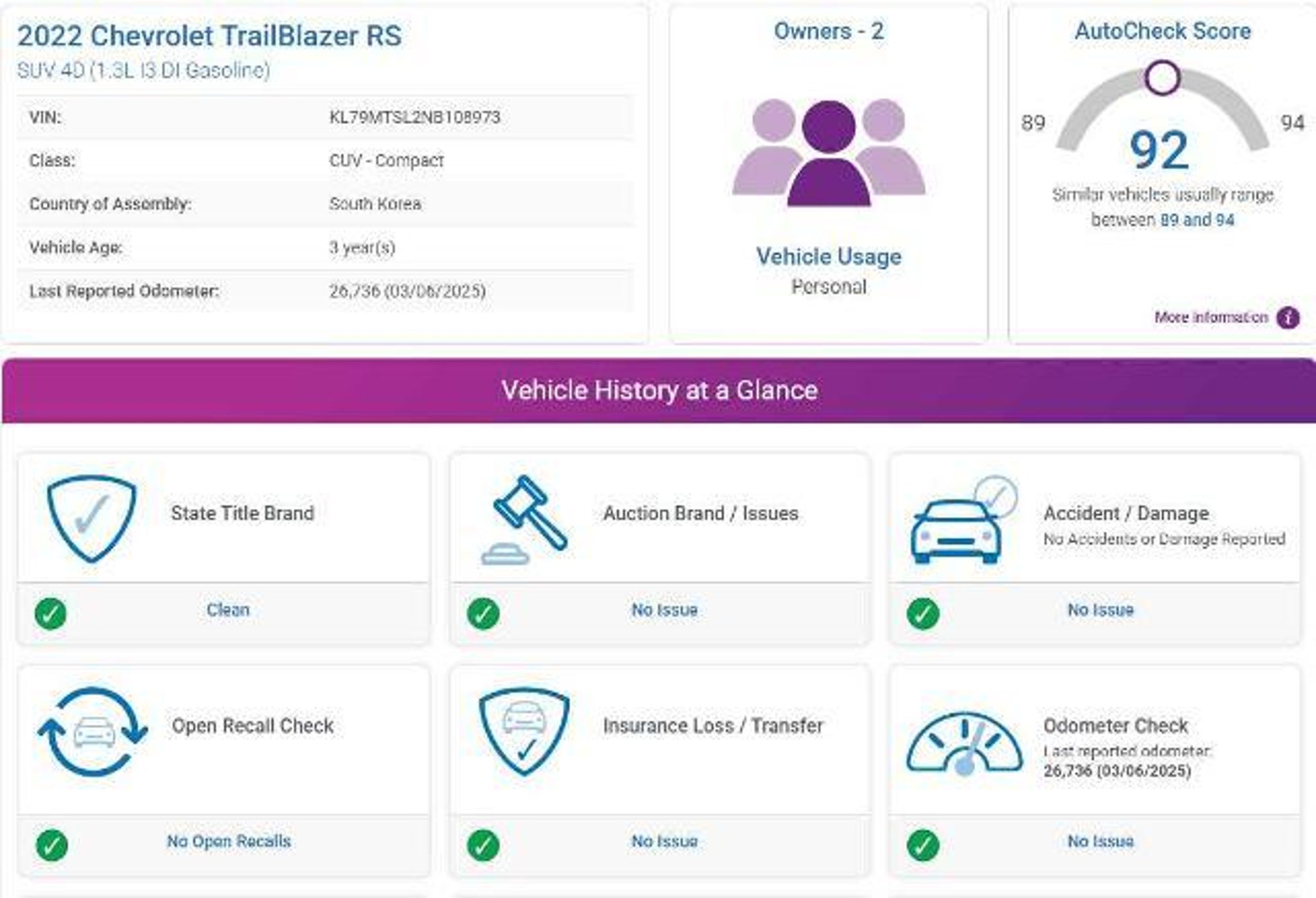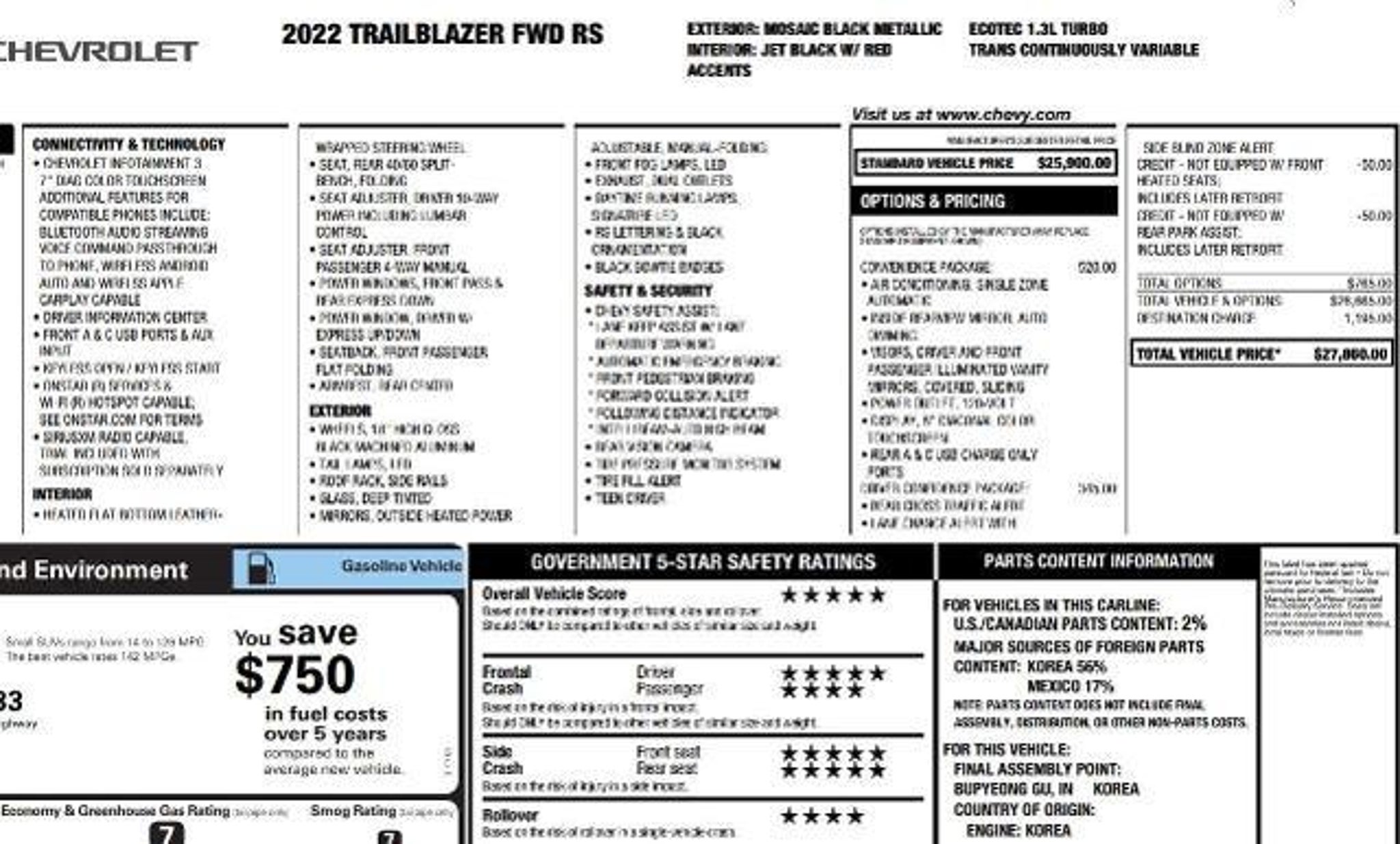 RS trim. FUEL EFFICIENT 33 MPG Hwy/29 MPG City! Heated Seats, Onboard Communications System, Satellite Radio, Back-Up Camera, Alloy Wheels, CONVENIENCE PACKAGE, DRIVER CONFIDENCE PACKAGE, TRANSMISSION, CONTINUOUSLY VARIABLE (... KEY FEATURES INCLUDE Heated Driver Seat, Back-Up Camera, Satellite Radio, Onboard Communications System, Aluminum Wheels. Chevrolet RS with Mosaic Black Metallic exterior and Jet Black with Red accents interior features a 3 Cylinder Engine with 155 HP at 5600 RPM*. OPTION PACKAGES includes (C68) automatic climate control air conditioning, (UIJ) 8 diagonal color touchscreen display, (USS) one type-A and one type-C charging only USB ports, (KI6) 120-volt power outlet, (DD8) inside rearview auto-dimming mirror and (DMS) driver and front passenger illuminated vanity mirrors, covered, sliding visors, includes (UKC) Lane Change Alert with Side Blind Zone Alert, (UFG) Rear Cross Traffic Alert and (UD7) Rear Park Assist (Vehicles built prior to January 10, 2022 include Rear Park Assist. Certain vehicles built on or after January 10, 2022, will be forced to include (00Y) Not Equipped with Rear Park Assist, which removes Rear Park Assist. See dealer for details or the window label for the features on a specific vehicle.), 7 diagonal color touchscreen, AM/FM stereo. Additional features for compatible phones include: Bluetooth? audio streaming for 2 active devices, voice command pass-through to phone, Apple CarPlay? and Android Auto? capable. (8 screen when (ZL3) Convenience Package and (ZL5) Driver Confidence Package or (SOR) Confidence II Package are ordered.) (STD), (155 hp [115 kW] @ 5600 rpm, 174 lb-ft torque [236 N-m] @ 1600 rpm) (STD), (STD). EXCELLENT VALUE Reduced from $20,990. This Trailblazer is priced $1,500 below Kelley Blue Book. WHY BUY FROM US? At Rick Ridings Ford we understand that your vehicle purchase is one of the biggest purchases you will make. Were here to make that process as easy and fun as possible. We cant wait to hear from you. Pricing analysis performed on 3/31/2026. Horsepower calculations based on trim engine configuration. Fuel economy calculations based on original manufacturer data for trim engine configuration. Please confirm the accuracy of the included equipment by calling us prior to purchase.