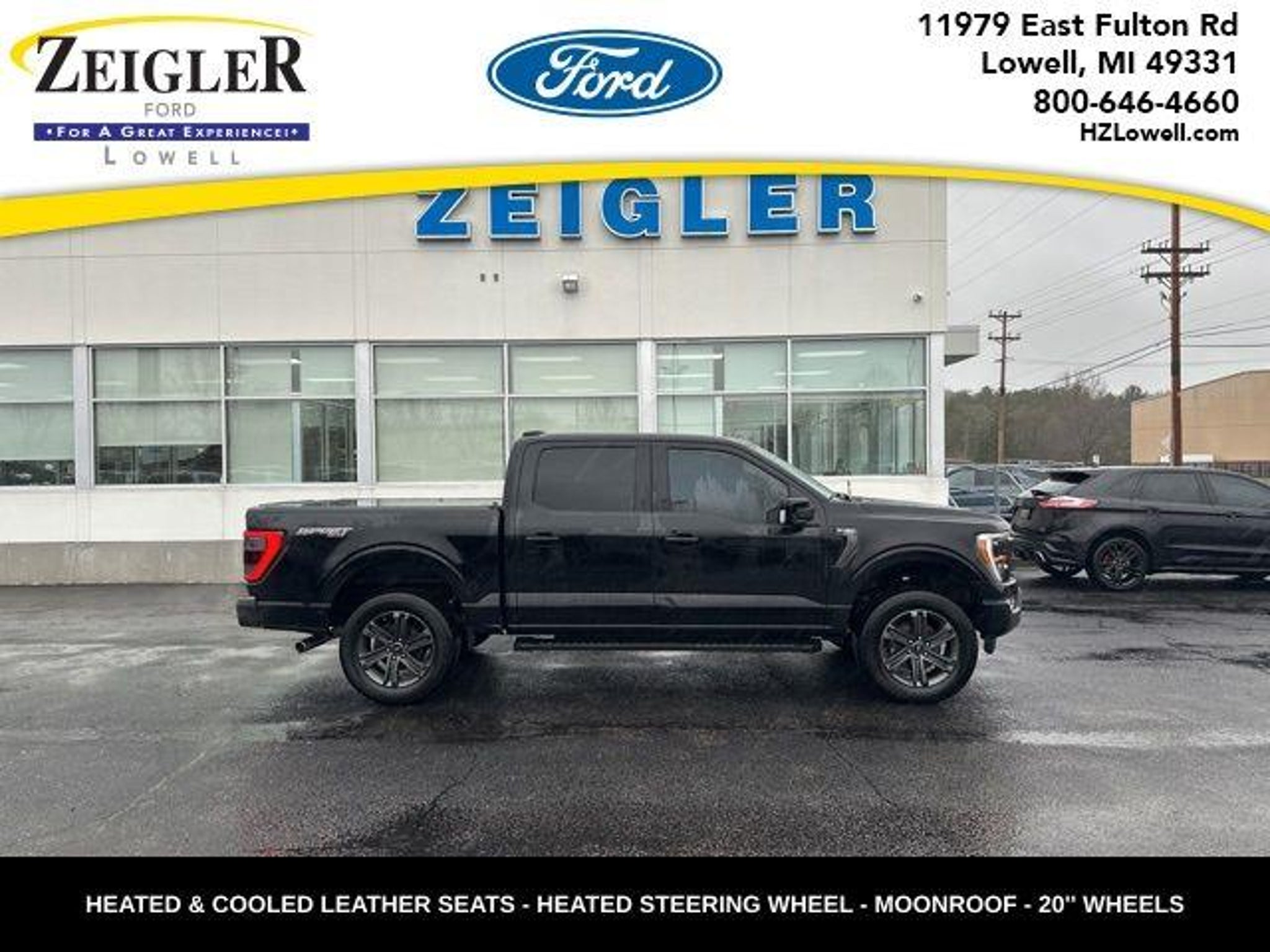 **SPORT APPEARANCE PACKAGE**HEATED AND COOLED LEATHER SEATS**HEATED STEERING WHEEL**TWIN PANEL MOONROOF**20 WHEELS**WIRELESS CHARGING PAD**12 TOUCHSCREEN WITH NAVIGATION**BLIS WITH CROSS TRAFFIC ALERT**B&O AUDIO SYSTEM**ADAPTIVE CRUISE CONTROL**FULLY INSPECTED AND SERVICED**Agate Black Metallic 2023 Ford F-150 Lariat TWIN PANEL MOONROOF 4WD 10-Speed Automatic 2.7L V6 EcoBoost *MOONROOF, *NAVIGATION, *LOCAL TRADE, *FULLY SERVICED, *REMOTE START, *20 WHEELS, *REARVIEW CAMERA, *TRAILER TOW PACKAGE, *LEATHER HEATED SEATS, 4WD, 2nd Row Heated Seats, ABS brakes, Accent-Color Angular Step Bars, Alloy wheels, Body-Color Front & Rear Bumpers, Box Side Decals, Chrome Single-Tip Exhaust, Class IV Trailer Hitch Receiver, Compass, Connected Built-In Navigation, Dark 2-Bar & 1 Minor Bar Style Grille, Electronic Stability Control, Equipment Group 502A High, Evasive Steering Assist, Ford Co-Pilot360 Assist 2.0, Front dual zone A/C, Heated door mirrors, Heated front seats, Illuminated entry, Integrated Trailer Brake Controller, Intelligent Adaptive Cruise Control w/Stop & Go, Intersection Assist, Lariat Sport Appearance Package, LED Projector w/Dynamic Bending Headlamps, Low tire pressure warning, Power Tilt/Telescoping Steering Column w/Memory, Pro Trailer Backup Assist & Pro Trailer Hitch Assist, Rain-Sensing Wipers, Remote keyless entry, Speed Sign Recognition, Traction control, Trailer Tow Package, Wheels: 20 Chrome-Like PVD, Wireless Charging Pad. YOUR BEST PRICE on ANY NEW FORD is Always at Zeigler Ford-Lowell. HOME OF THE BEST PRICE GUARANTEE ON ANY NEW FORD & GET THE MOST MONEY FOR YOUR TRADE! Recent Arrival! Odometer is 10053 miles below market average! At Zeigler Ford, Home of the BEST PRICE GUARANTEE & GUARANTEED FINANCING, we take pride in treating our customers like family, ensuring that your experience is one that you will never forget. Every vehicle has been through a 172 point safety inspection completed by a certified technician and fully detailed. Pre-Owned Ford Vehicles 2017-2016-2015-2014-2013-2012-2011-2010 Ford Escapes, Fusions, Focus, Edges, Flex, F- Series, Heavy Duty Diesel Trucks and more For sale. Take advantage of our VIP internet experience by calling 616-897-8431 to schedule a test drive. Read our customer reviews at www.hzlowell.com/reviews or visit us on the web at www.hzlowell.com, or stop by today, located at 11979 East Fulton, Lowell, MI 49331. We are proud to service customer's saving you time & money on any New or Pre-owned vehicle! See dealer for complete details, dealer is not res