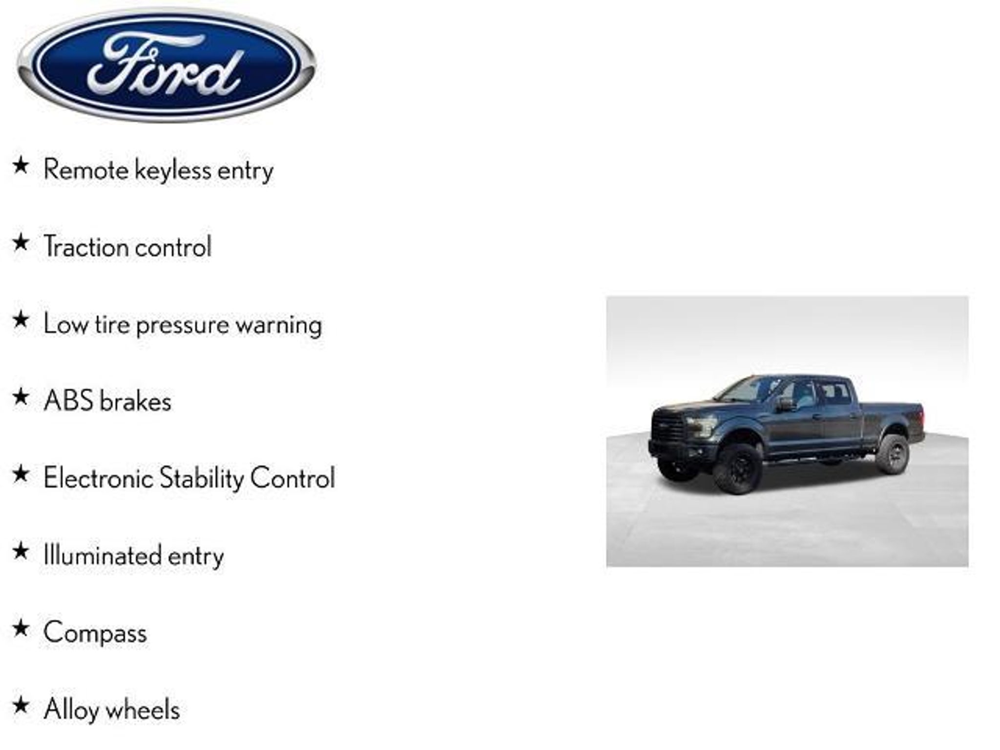 Discover the perfect blend of power, capability, and style in this 2016 Ford F-150 XLT. With its impressive 5.0L V8 FFV engine, 4-wheel drive, and impressive fuel efficiency, this truck is ready to take on any challenge you throw its way. - Remote keyless entry - Electronic Stability Control - Traction control - Compass - Illuminated entry - ABS brakes - Low tire pressure warning - Alloy wheels Step inside and experience the comfort and convenience of features like SYNC Voice Recognition Communications, air conditioning, power windows, and steering wheel-mounted audio controls. The spacious interior and split-folding rear seat provide ample room for passengers and cargo, while the chrome bumpers and rear step bumper add a touch of rugged style. Safety is a top priority, with dual front impact airbags, dual front side impact airbags, and an occupant sensing airbag keeping you and your loved ones protected on the road. The front anti-roll bar and front wheel independent suspension ensure a smooth and stable ride, no matter the terrain. This 2016 Ford F-150 XLT is the perfect blend of power, capability, and technology, making it the ideal choice for your next adventure. Experience the difference for yourself and schedule a test drive today. The listed online price reflects a $1,000 finance incentive and a $1,000 qualifying retail trade-in incentive; absence of either or both incentives will result in an increase of up to $2,000 to the final sale price.