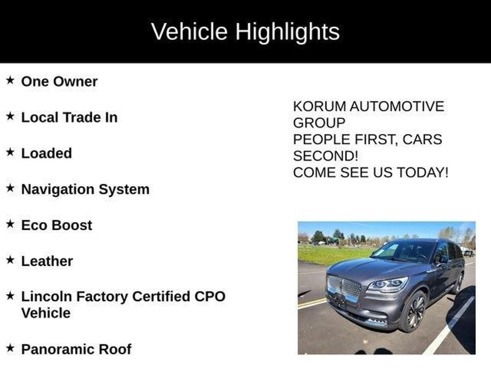 Certified. One Owner, Local Trade In, Loaded, Navigation System, Eco Boost, Leather, Lincoln Factory Certified CPO Vehicle, Panoramic Roof, Automatic Transmission, AWD, Lincoln Aviator Reserve, 4D Sport Utility, 3.0L V6, 10-Speed Automatic, AWD, Asher Gray, Roast Leather, 4-Pin & 7-Pin Connectors, Adaptive Suspension w/Road Preview, Air Glide Suspension w/Dynamic Lower Entry, Auto Air Refresh, Auto Heated/Ventilated Driver & Passenger Seats, Blind Spot Detection w/Cross Traffic Alert, Class IV Hitch & Wiring, Class IV Trailer Tow Package, Convenience Package, Dynamic Handling Package, Elements Package Plus, Equipment Group 202A, Head-Up Display, Heated Steering Wheel, Heated VisioBlade Wipers, Heated/Ventilated 2nd Row Outboard Seats, Illumination Package, Lincoln Co-Pilot360 Plus, Luxury Package, Navigation System, Phone As A Key, Smart Trailer Tow, Trailer Sway Control, Wheels: 22 Bright-Machined Aluminum, Wireless Charging Pad.Lincoln Signature Certification Details: * Warranty Deductible: $100 * Vehicle History * Roadside Assistance * Limited Warranty: 72 Month/100,000 Mile (whichever comes first) from original in-service date * Includes Car Rental and Trip Interruption Reimbursement, Lincoln Access Rewards 20,000 Points * 200 Point Inspection * Transferable Warranty2021 Lincoln Aviator Asher Gray Reserve 3.0L V6At Korum, we provide our customers with real-time value pricing on every vehicle. How? We poll over 70,000 websites hourly to ensure our customers receive the BEST PRICES. We will never inflate vehicle prices or play pricing games as a part of our negotiation strategy with our customers.Located at the corner of River Road and Meridian in downtown Puyallup, WA, we have a large selection of cars, trucks and SUVs. Shop our huge selection of vehicles online or come visit us and take a test drive today. Limitations and exclusions apply. Any vehicle used for business or commercial purposes does not qualify. See dealer for complete details. Customer is responsible for sales tax, title, and license fee. A negotiable $200 documentation fee may be applied. Photos for illustration purposes only.