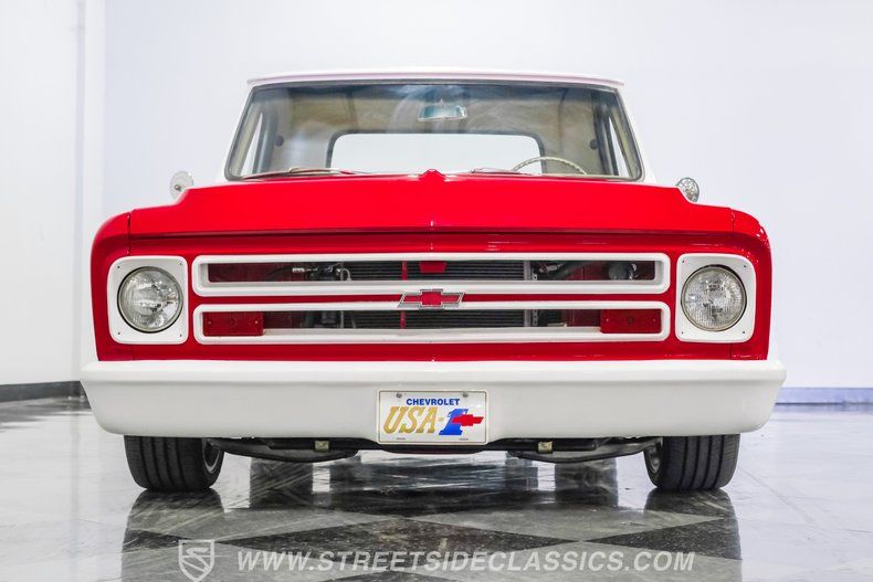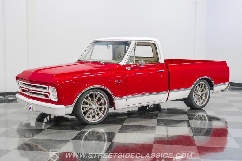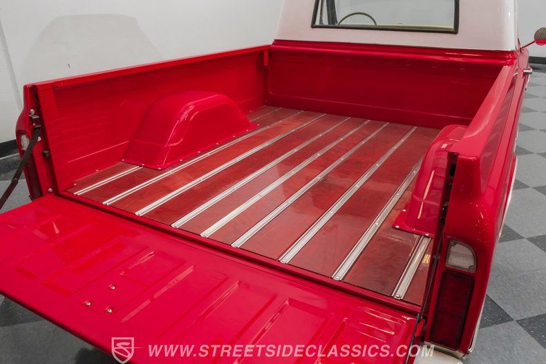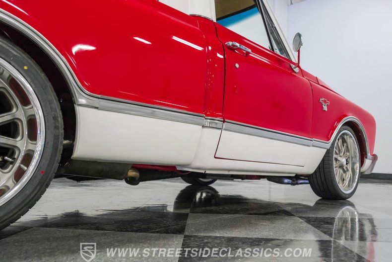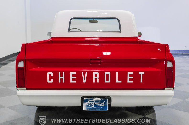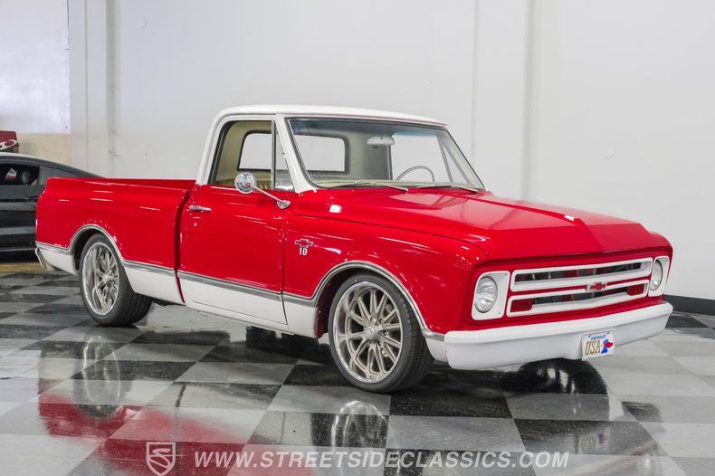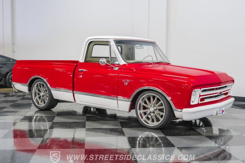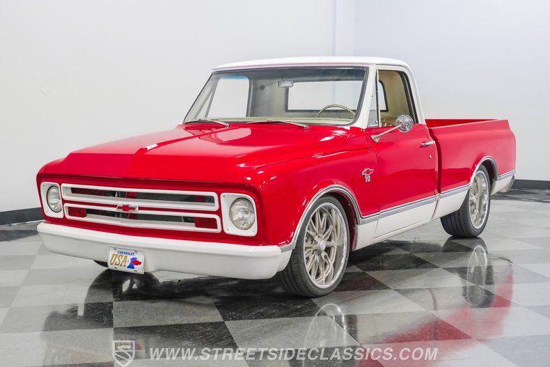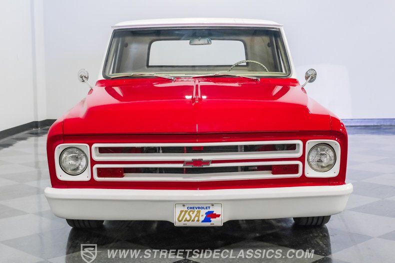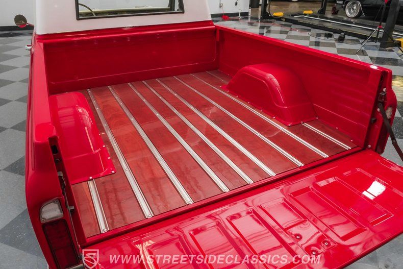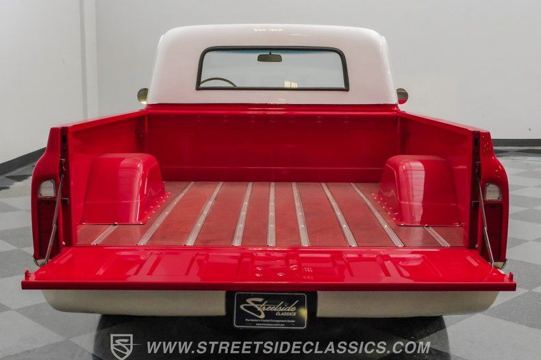 This 1967 Chevrolet C10 blends classic American utility with purposeful upgrades, finished in a striking red-and-white repaint with white accents along the lower body, roof, pillars, bumpers, and grille. Its lowered stance and wood plank bed give it an unmistakable custom presence, while the relocated under bed fuel tank keeps the lines clean and uncluttered. Equal parts vintage style and modern attitude, this C10 delivers bold looks, thoughtful execution, and the kind of curb appeal that makes it hard to ignore-exactly the truck your garage has been waiting for.