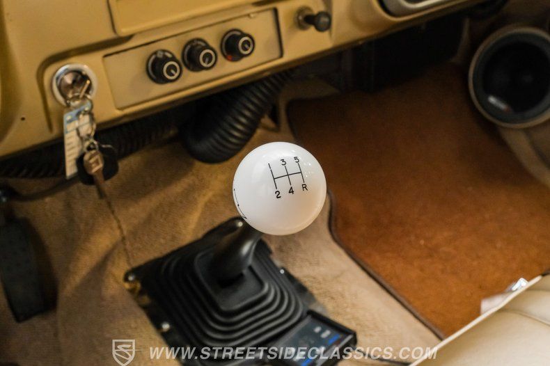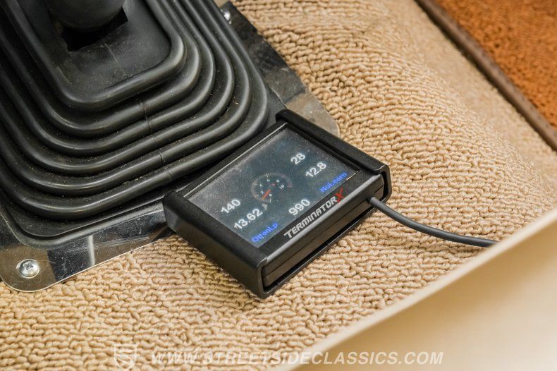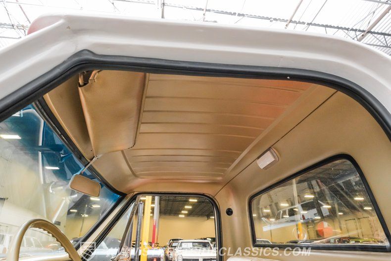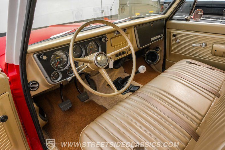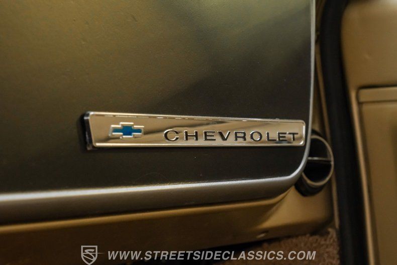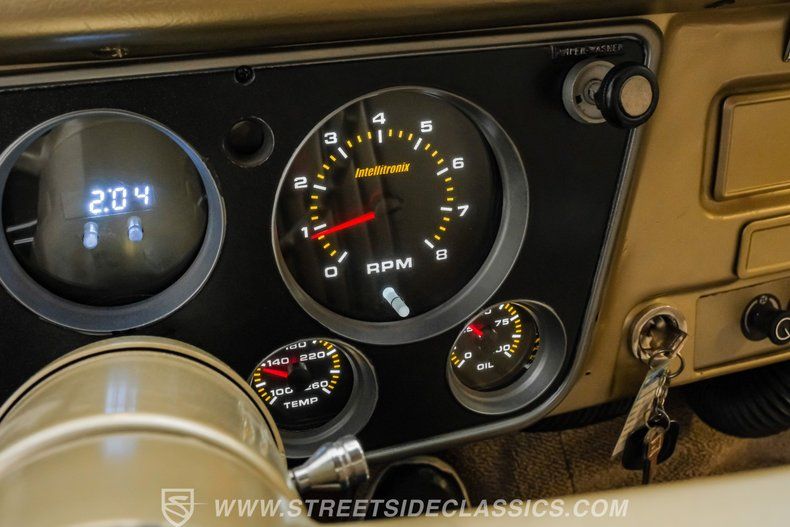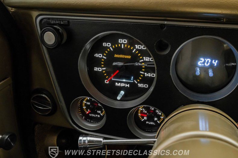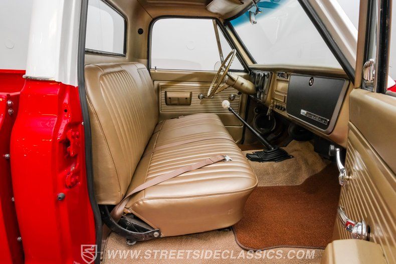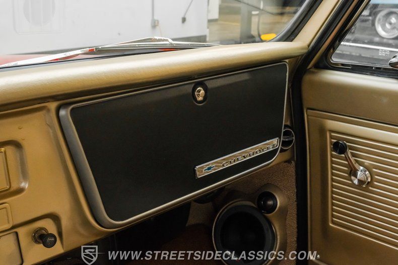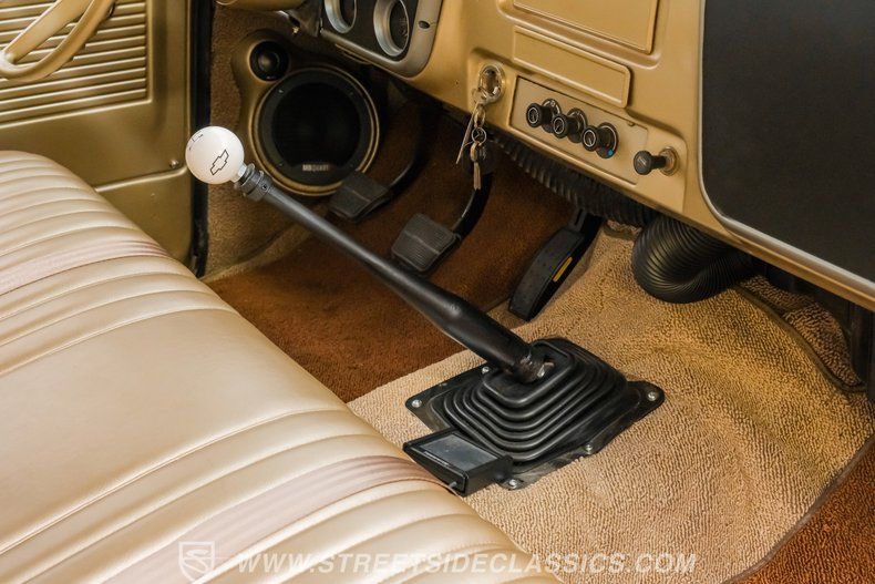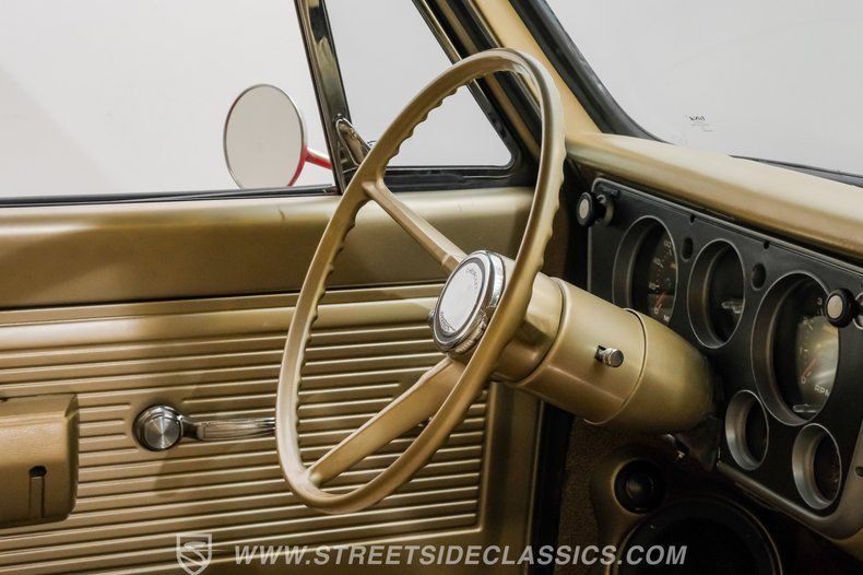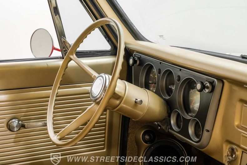 Inside, the C10 pairs classic style with smart upgrades. The Fawn tan vinyl bench seat and matching door panels set a clean, period correct tone, while the factory dash is enhanced with crisp Intellitronix gauges for modern readability. A factory steering wheel mounted on a tilt column and a floor shifter for the 5 speed manual keep the driving experience engaging and purposeful. Tan carpeting and darker brown floor mats round out a comfortable, well finished cabin. The A/C currently blows cool and may need minor servicing to reach peak performance, making this interior as enjoyable on the road as it is visually appealing.