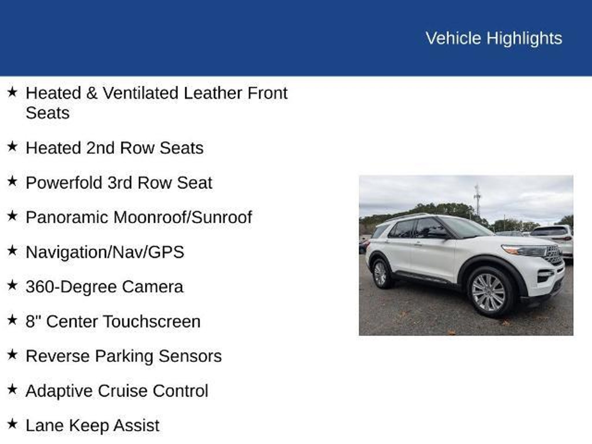 **FACTORY CERTIFIED** * Ford Blue Advantage: Blue Certified * 139 Point Inspection by Factory Certified Technicians * Roadside Assistance * Comprehensive Limited Warranty: 3 Month/4,000 Mile with Roadside Assistance ***SERVICED WITH NEW TIRES!!*** Premium comfort meets standout style in this 2020 Ford Explorer Limited (VIN 1FMSK7FH0LGB39108) with 80,321 miles, finished in eye-catching Star White Metallic Tri-Coat premium paint. Inside, this Explorer is designed to keep everyone comfortable with heated and cooled leather front seats, heated second-row seating, and a powerfold third-row bench for added flexibility. A twin panel moonroof fills the cabin with natural light, while the heated steering wheel, wireless device charging, and a 110V power outlet add everyday convenience. The B&O sound system with 12 speakers delivers rich, immersive audio throughout the cabin. Technology is front and center with an 8-inch touchscreen, navigation, remote start, and a 360-degree camera that makes parking and maneuvering easier. Equipped with Ford Co-Pilot360 Assist, this Explorer enhances confidence on the road with advanced driver-assist features. On the exterior, 20-inch hand-polished aluminum wheels, autofold mirrors, and a hands-free liftgate add both style and practicality. With its premium features, versatile three-row seating, and distinctive finish, this Explorer Limited is built to elevate every drive. Clean CARFAX. 10-Way Power Heated & Ventilated Leather Front Seats, Heated 2nd Row Seats, Powerfold 3rd Row Seat, Panoramic Moonroof/Sunroof, Navigation/Nav/GPS, 360-Degree Camera, 8 Center Touchscreen, Forward & Reverse Parking Sensors, Adaptive Cruise Control, Lane Keep Assist, Blind Spot Information System, Pre-Collision Assist with Automatic Emergency Braking, Wireless Charging Pad, 110V Power Outlet, Remote Start, Push Button Start, 172 Point Inspection completed by our Factory Certified & ASC Trained Technicians, Recent Oil Change, Vehicle Detailed, CLEAN HISTORY/NO ACCIDENTS, 20 Hand Polished Aluminum Wheels, Heated Leather Steering Wheel, Hands-Free Power Liftgate, LED Headlamps & LED Fog Lamps, Tri-Zone Automatic Climate Control, B&O Sound System by Bang & Olufsen w/12 Speakers, SYNC 3/Apple CarPlay/Android Auto, AutoFold Power Heated Side Mirrors w/LED Turn Signals & Approach Lighting, Equipment Group 300A, FordPass Connect, Garage Door Transmitter, Memory Seat, Rain Sensing Wipers, Voice-Activated Touchscreen Navigation System. Savannah, GA ? J.C. Lewis Ford Built Ford Tough. In Sa