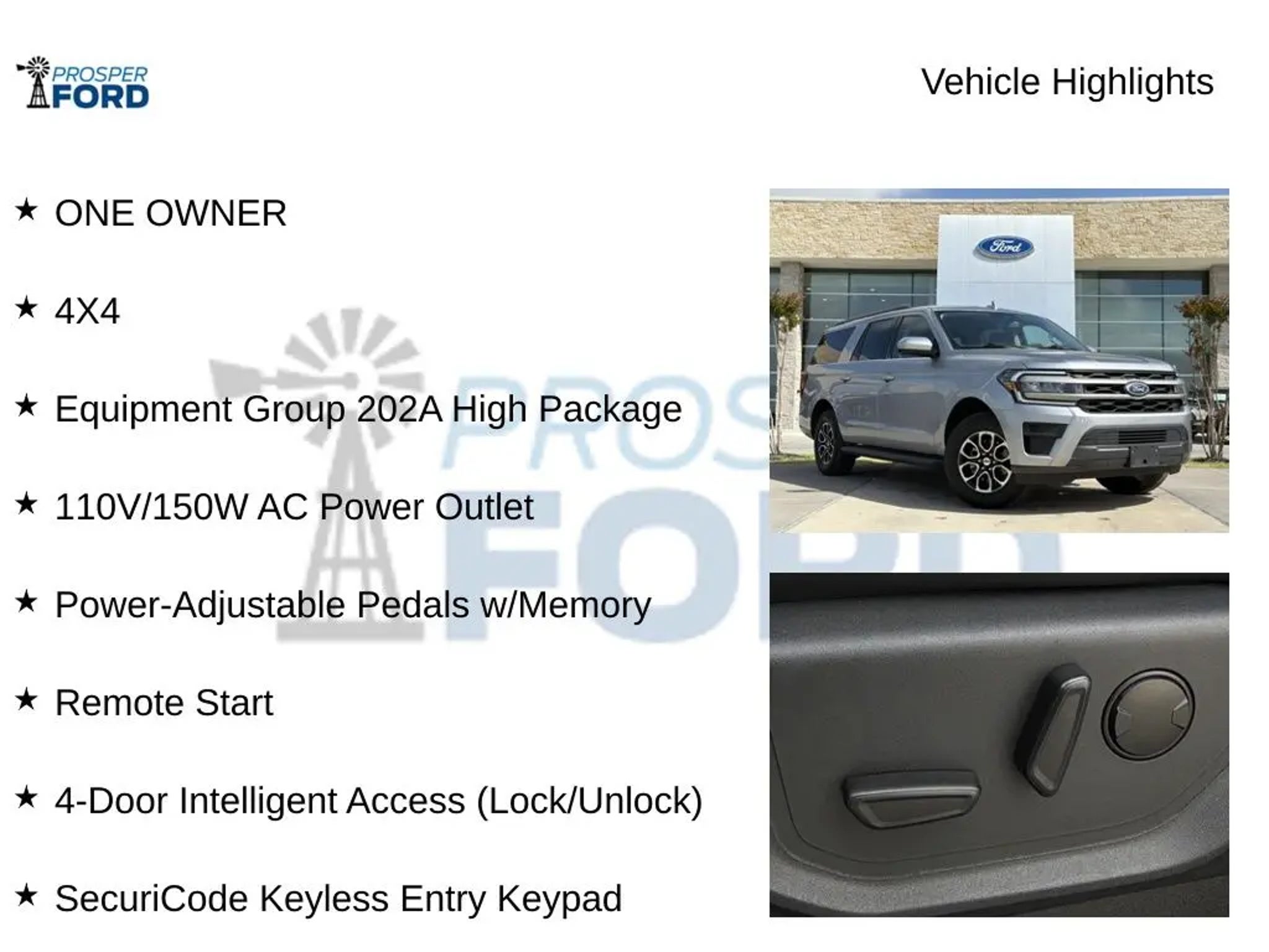 Discover the ultimate family-friendly SUV with the 2024 Ford Expedition Max XLT. This exceptional vehicle combines unparalleled capability, advanced technology, and a refined interior, making it the perfect choice for your next adventure. - ONE OWNER - 4X4 - EQUIPMENT GROUP 202A HIGH PACKAGE featuring a Wireless Charging Pad, Power Liftgate, 2nd Row Power-Folding Captain's Chairs, Heated Steering Wheel, Heated/Ventilated Front Seats, Remote Start, and much more. - Powerful EcoBoost 3.5L V6 engine delivering a responsive and efficient driving experience. - Spacious interior with seating for up to 7 passengers and ample cargo room, perfect for family road trips or hauling gear. - Sophisticated ActiveX-trimmed seats provide exceptional comfort and style, while the 3rd Row Vinyl Power-Folding Head Restraints offer versatile seating configurations. - Cutting-edge technology, including SYNC 4 with Enhanced Voice Recognition, Ambient Lighting, and a Wireless Charging Pad, keeps you connected and entertained on the go. - Enhance your driving experience with features like the Power-Adjustable Pedals with Memory, Power Tilt/Telescopic Steering Wheel, and 4-Door Intelligent Access, providing unparalleled convenience and customization. - Elevate your confidence on the road with the Advanced Security Pack, SecuriLock Passive Anti-Theft System, and a host of safety features, including Dual Front Impact Airbags, Occupant Sensing Airbag, and Emergency Communication System. Discover the perfect blend of capability, technology, and style with the 2024 Ford Expedition Max XLT. Experience the difference for yourself and schedule a test drive today. We're confident you'll be impressed by the exceptional value and exceptional features this vehicle has to offer.