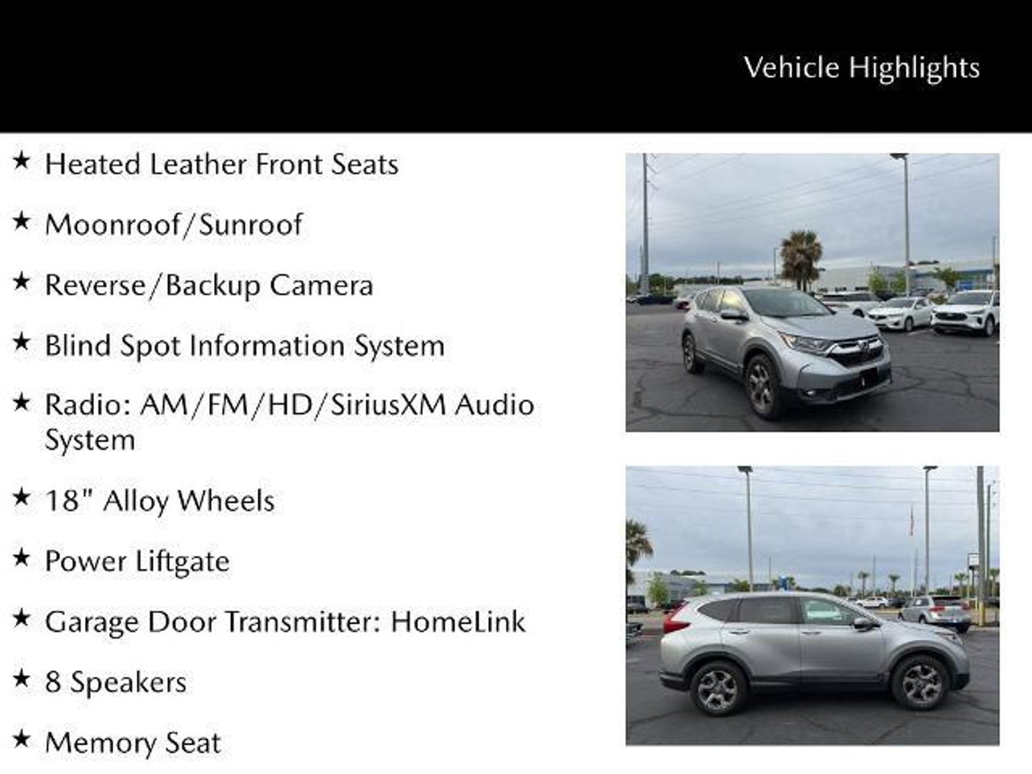 Comfort, efficiency, and proven reliability come together in this 2017 Honda CR-V EX-L (VIN 5J6RW2H82HL052181) with just 58,074 miles, offering a well-balanced SUV that?s ideal for daily driving and weekend travel. Inside, heated leather front seats and driver seat memory create a personalized, comfortable driving experience, while a power liftgate adds convenience when loading cargo. A moonroof brings in natural light, giving the cabin an open, airy feel. Technology is straightforward and functional with a backup camera that makes parking and maneuvering easier and more confident. On the exterior, 18-inch wheels give this CR-V a clean, modern stance that complements its practical design. Delivering an efficient 27 city and 33 highway MPG, this CR-V helps you go farther between fill-ups without sacrificing comfort. CARFAX One-Owner. Clean CARFAX. Heated Leather Front Seats, Moonroof/Sunroof, Reverse/Backup Camera, Blind Spot Information System, 172 Point Inspection completed by our Factory Certified & ASC Trained Technicians, CLEAN HISTORY/NO ACCIDENTS, Recent Oil Change, Vehicle Detailed, Radio: AM/FM/HD/SiriusXM Audio System, 18 Alloy Wheels, Power Liftgate, Garage Door Transmitter: HomeLink, AWD, 8 Speakers, Apple CarPlay/Android Auto, Leather Shift Knob, Memory Seat. Savannah, GA ? J.C. Lewis Lincoln Where Luxury Meets Legacy At J.C. Lewis Lincoln, we understand that true luxury is more than a vehicle ? it's a refined experience built on trust, attention to detail, and timeless style. That?s why we include over 20 high-quality photos and a professional walkaround video with every listing, so you can explore each model?s craftsmanship from the comfort of your home. From executive sedans to elegant SUVs, our curated selection represents the best in comfort, technology, and performance. We also provide a complimentary AutoCheck or CARFAX report for your complete peace of mind. Visit our brand new Vitrine showroom at 9505 Abercorn Street in Savannah, GA or call (912)-925-0592 ? and allow us to deliver the elevated service and sophistication you deserve.
