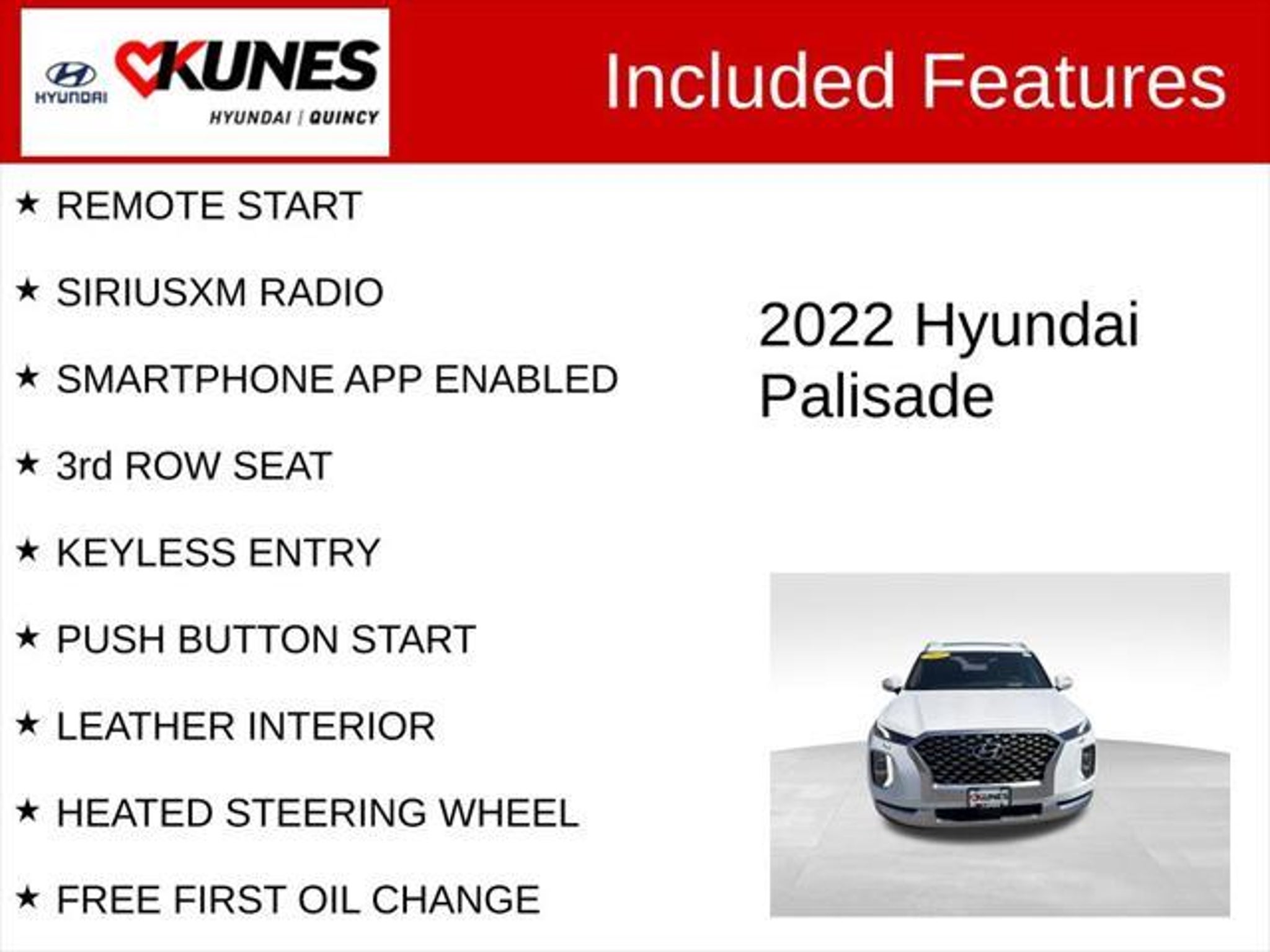 Details > 2022 Hyundai Palisade Calligraphy 4DR SUV For Sale in Quincy, IL Private Party Sellers Click here to place your ad now! You auta tell them you saw the ad in AutaBuy when you call or email. 1/32 2/32 3/32 4/32 5/32 6/32 7/32 8/32 9/32 10/32 11/32 12/32 13/32 14/32 15/32 16/32 17/32 18/32 19/32 20/32 21/32 22/32 23/32 24/32 25/32 26/32 27/32 28/32 29/32 30/32 31/32 32/32 View 32 Photos View All Add to My Garage Parked in Your Garage! Kunes Country Hyundai of Quincy Contact Seller: I would like to: Make Offer Check Availability Ask A Question Request More Photos Check Financing Options Send a copy of this message to me Add this listing to my garage Send to Mobile Mileage 128,054 Exterior Color Hyper White Interior Color Black Doors 4 Engine 3.8L V6 Transmission 8 Speed Auto Stock # 14T1358A Ad ID 108926898 VIN KM8R74HE6NU348844 Estimated Monthly Payment $443 mo Apply Now J.J. Best Banc & Co. 2022 Hyundai Palisade Calligraphy 4DR SUV Description: Kunes Country Hyundai of Quincy · Mileage: 128,054 · Color: Hyper White Price: $27,440. Price: $25,440. Mileage 128,054 Exterior Color Hyper White Interior Color Black Doors 4 Engine 3.8L V6 Transmission 8 Speed Auto Stock # 14T1358A Ad ID 108926898 VIN KM8R74HE6NU348844 Estimated Monthly Payment $443 mo Apply Now J.J. Best Banc & Co. Add to My Garage Parked in Your Garage! Message Seller Kunes Country Hyundai of Quincy Contact Seller: I would like to: Make Offer Check Availability Ask A Question Request More Photos Check Financing Options Send a copy of this message to me Add this listing to my garage Offered for sale by Kunes Country Hyundai of Quincy QUINCY, IL Price: $27,440. Price: $25,440. Offered for sale by Kunes Country Hyundai of Quincy QUINCY, IL [entire inventory] Ask Auta Intelligence The first collector-car AI built directly into a classic car marketplace What colors did these come in? How easy are parts to find for this model? When was this model first introduced? Tell me about this model What safety features does this model offer? What trim levels were available for this model? How far is this from me? What kind of mileage do these get? How many passengers can this seat comfortably? What engine options did these come with? What transmission options did these offer? Where is this located? How many of these were produced? What does this VIN number tell me? What factory options were available on this model? Can you show me more suvs for a similar price? How many Palisades were produced in White? Do you have a similar car to sell? List It Now! Questions about this car? Ask Auta Intelligence for production numbers, available options, etc. · Subscribe to AutaBuy! · Send a Gift Subscription Notice to a Friend