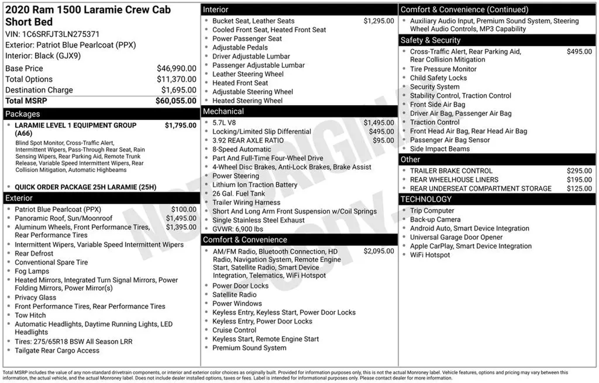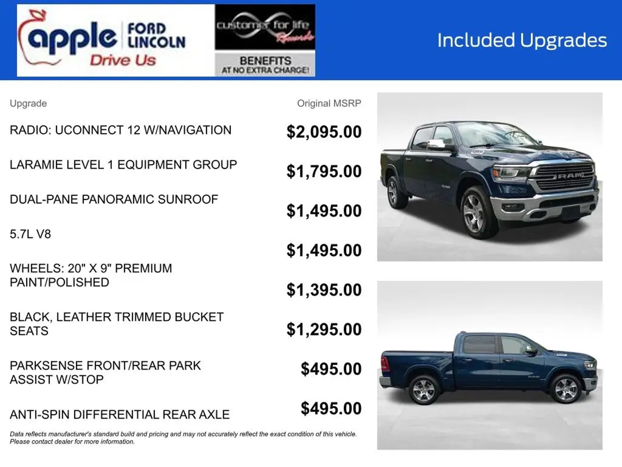 New Arrival"”Currently going through our Reconditioning process. More Photos coming soon! This 2020 Ram 1500 Laramie is a powerful and well-equipped pickup that's ready to take on any task. Equipped with a HEMI 5.7L V8 engine, 4-wheel drive, and an 8-speed automatic transmission, this truck delivers impressive performance and capability. The Laramie trim level adds a host of premium features, including: - LARAMIE LEVEL 1 EQUIPMENT GROUP - 3.92 REAR AXLE RATIO - ANTI-SPIN DIFFERENTIAL REAR AXLE - BLACK, LEATHER TRIMMED BUCKET SEATS - DUAL-PANE PANORAMIC SUNROOF - RADIO: UCONNECT 12 W/NAVIGATION - WHEELS: 20 X 9 PREMIUM PAINT/POLISHED With a spacious and well-appointed interior, this Ram 1500 Laramie offers exceptional comfort and convenience. The dual-pane panoramic sunroof floods the cabin with natural light, while the premium leather-trimmed seats provide exceptional support and style. The advanced Uconnect 12 infotainment system with navigation keeps you connected and on course, with features like SiriusXM satellite radio, 4G LTE Wi-Fi, and Apple CarPlay/Android Auto integration. Designed to handle the demands of work and play, this Ram 1500 Laramie is equipped with a host of advanced safety and driver-assistance technologies. The ParkSense front and rear park assist with stop function helps you navigate tight spaces with confidence, while the blind spot and cross-path detection system enhances awareness on the road. Whether you're hauling heavy loads, towing a trailer, or simply enjoying the open road, this 2020 Ram 1500 Laramie is ready to deliver. With its powerful engine, premium features, and exceptional capability, this truck is the perfect choice for those who demand the best. Schedule a test drive today and experience the difference for yourself. Ford Blue Certified Details: * Roadside Assistance * Transferable Warranty * 139 Point Inspection * Vehicle History * and 11,000 FordPass Rewards Points to use toward first maintenance visit * Warranty Deductible: $100 * Limited Warranty: 3 Month/4,000 Mile (whichever comes first) after new car warranty expires or from certified purchase date