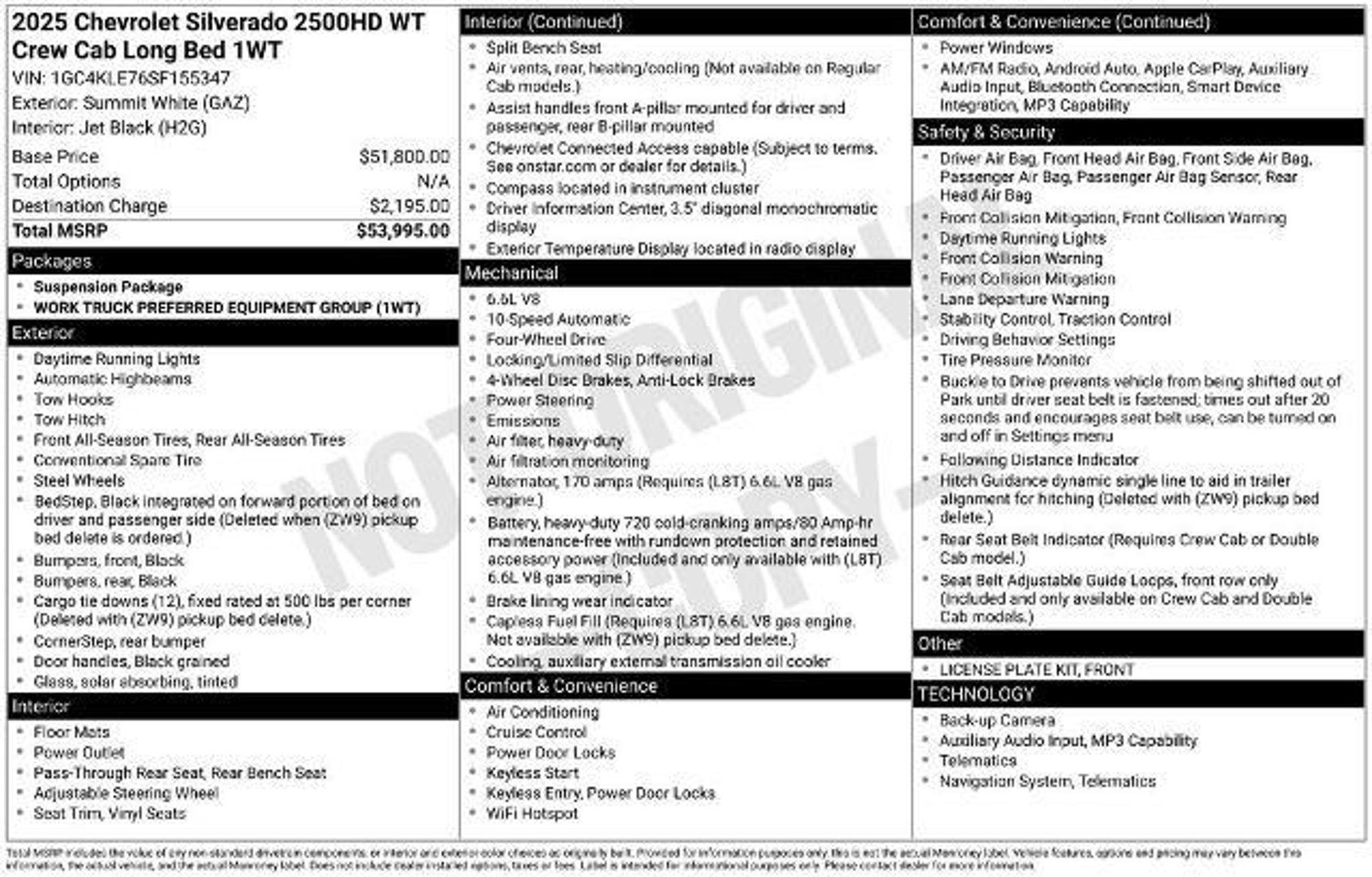 **One Owner**Accident Free**2025**Chevrolet**Silverado 2500HD** W/T**4X4**Keyless Entry**Android Auto**Apple CarPlay**Bluetooth** Our One Owner, Accident Free 2025 Chevrolet Silverado 2500 W/T Crew Cab 4X4 works hard and treats you right in Summit White! Powered by a 6.6 Liter V8 generating 401hp for a 10 Speed Allison Automatic transmission engineered for easy towing and hauling. Take command of this Four Wheel Drive truck to enjoy composed handling with a 2-speed transfer case, auto-locking rear differential, and impressive maneuverability. Well-equipped for the daily grind, our Silverado 2500 boasts rear/side bed steps, cargo-bed lighting, vertical trailering mirrors, a hitch receiver, a locking tailgate, black recovery hooks, and matching bumpers. A thoughtful layout and rewarding features greet you in our Work Truck cabin. It's all about functional comfort and convenience with supportive seats, single-zone climate control, power accessories, a 12V power outlet, and must-have technologies. A 7-inch touchscreen leads the way and lets you connect with WiFi compatibility, wireless Apple CarPlay/Android Auto, Bluetooth, and an ear-catching sound system. Chevrolet knows the importance of on-the-job safety, so it supplies automatic braking, forward collision alert, a rearview camera, a following distance indicator, hitch guidance, Stabilitrak stability/traction control, trailer sway control, hill start assistance, and more for your peace of mind. Drive our Silverado 2500 W/T and feel ready to do it all! Save this Page and Call for Availability. We Know You Will Enjoy Your Test Drive Towards Ownership!