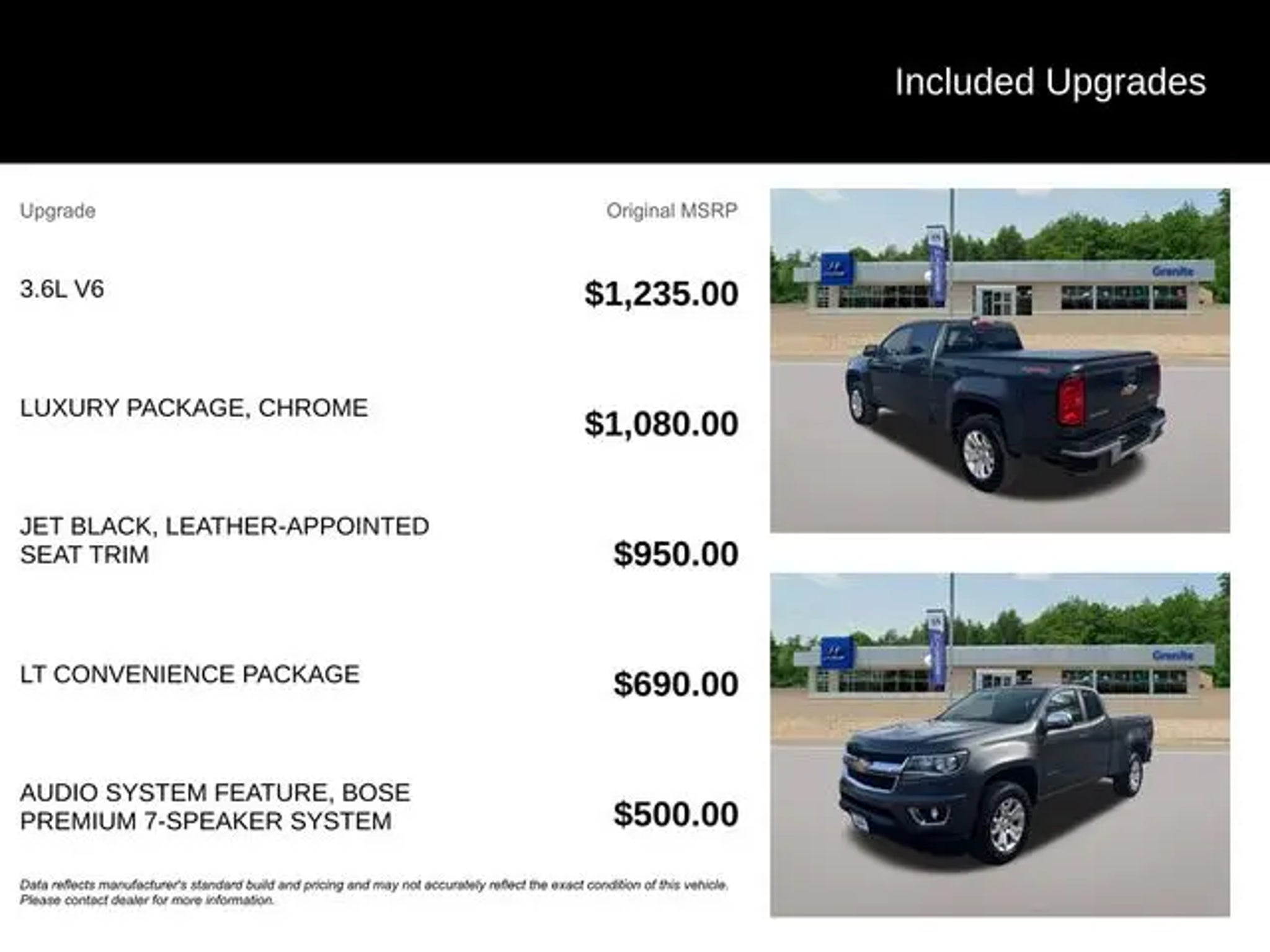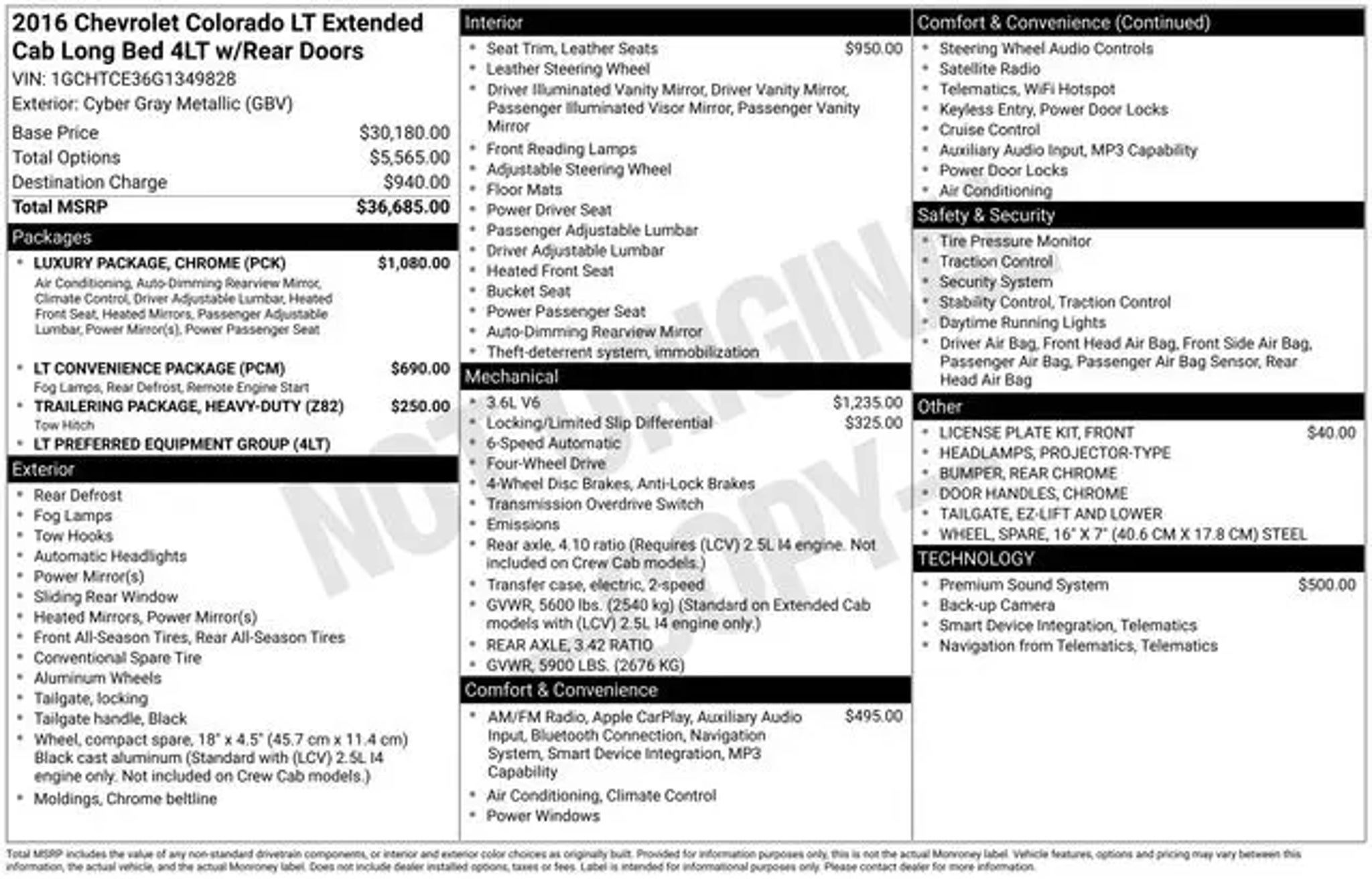 This 2016 Chevrolet Colorado LT is a rugged and capable midsize truck that's ready to take on any adventure. With its powerful 3.6L V6 engine, 4-wheel drive, and a host of premium features, this Colorado is the perfect blend of performance and luxury. - Automatic Locking Rear Differential - Bose Premium 7-Speaker Audio System - Chevrolet MyLink Radio with Navigation and 8 Touchscreen - Heated Driver and Front Passenger Seats - Power Driver and Front Passenger Lumbar Control - Remote Vehicle Starter System - Single-Zone Automatic Climate Control - Trailering Package with Trailer Hitch and 7-Pin Connector The Colorado's impressive capabilities are matched by its refined interior, featuring premium leather-appointed seating, a Bose premium audio system, and a user-friendly Chevrolet MyLink infotainment system with navigation. Whether you're hauling gear, towing a trailer, or just enjoying the ride, this Colorado LT has the power and features to make every journey a pleasure. This Colorado is also backed by a Clean CARFAX report, giving you the peace of mind that it has been well-maintained and is free of any major accidents or issues. With its combination of capability, comfort, and quality, this 2016 Chevrolet Colorado LT is an exceptional value that's sure to impress. As a certified pre-owned vehicle, this Colorado has undergone a thorough inspection and reconditioning process to ensure it meets our high standards. You can drive with confidence knowing that this truck has been meticulously cared for and is ready to provide years of reliable service. Whether you're looking for a capable work truck, a versatile adventure vehicle, or a premium daily driver, this 2016 Chevrolet Colorado LT is an exceptional choice. Come in and take it for a test drive today "“ we're confident you'll be impressed by its performance, features, and value.
