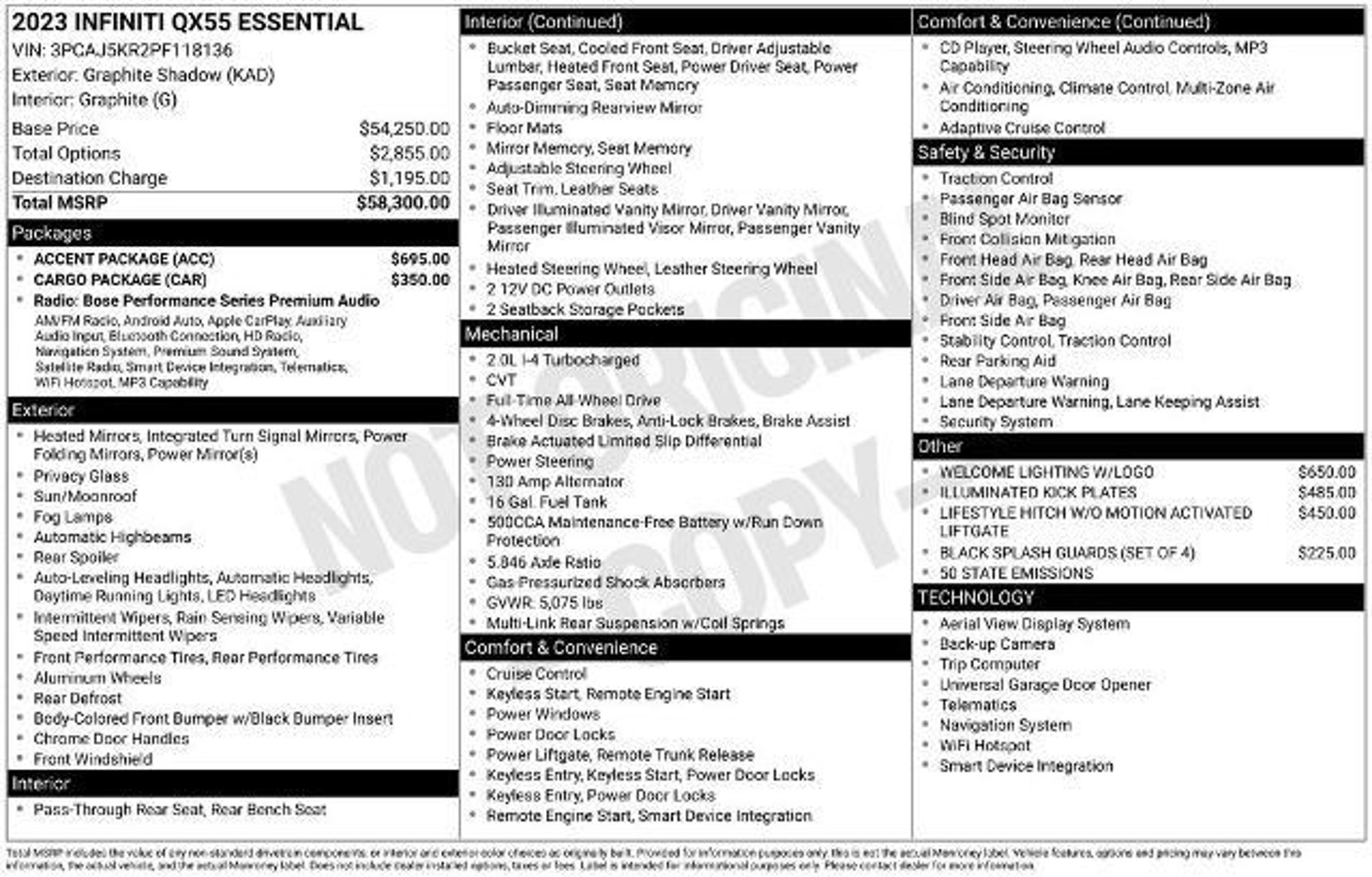Elevate your driving experience with this exceptional 2023 INFINITI QX55 ESSENTIAL. Blending style, performance, and cutting-edge technology, this SUV is poised to exceed your expectations. Crafted with meticulous attention to detail, this QX55 boasts an array of premium features that will elevate your daily commute and weekend adventures: - Accent Package with Matte Chrome Mirror Caps and Bodyside Molding - Cargo Package including Reversible Cargo Mat and Cargo Net - Illuminated Kick Plates - Lifestyle Hitch with Welcome Lighting and Logo - Black Splash Guards Beyond these thoughtful additions, this QX55 is equipped with a wealth of advanced technologies and luxurious amenities. Enjoy the seamless connectivity of the INFINITI InTouch Navigation system, the comfort of Climate Controlled Front Bucket Seats, and the confidence of the Intelligent All-Wheel Drive system. Powered by a responsive I4 engine and paired with a smooth-shifting CVT transmission, the QX55 delivers an exceptional driving experience. With an EPA-estimated 22 MPG in the city and 28 MPG on the highway, this SUV strikes the perfect balance between performance and efficiency. Safety is paramount, and the QX55 delivers with a comprehensive suite of advanced driver-assistance features. From Automatic Emergency Braking to Blind Spot Monitoring, this SUV is designed to help keep you and your loved ones secure on the road. Elevate your driving experience and make a statement with this stunning 2023 INFINITI QX55 ESSENTIAL. Contact us today to schedule a test drive and discover the exceptional craftsmanship and capabilities that this SUV has to offer.
