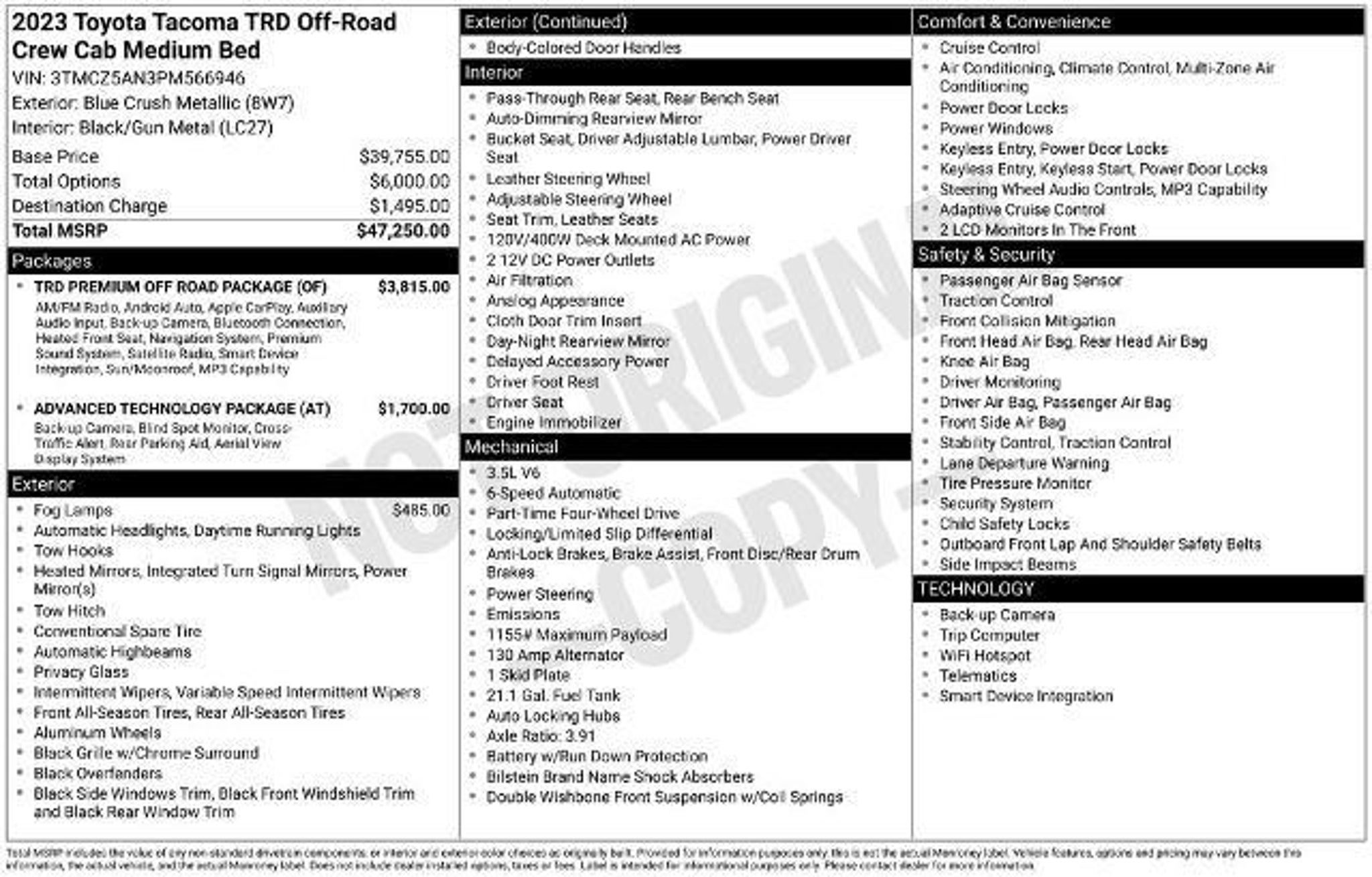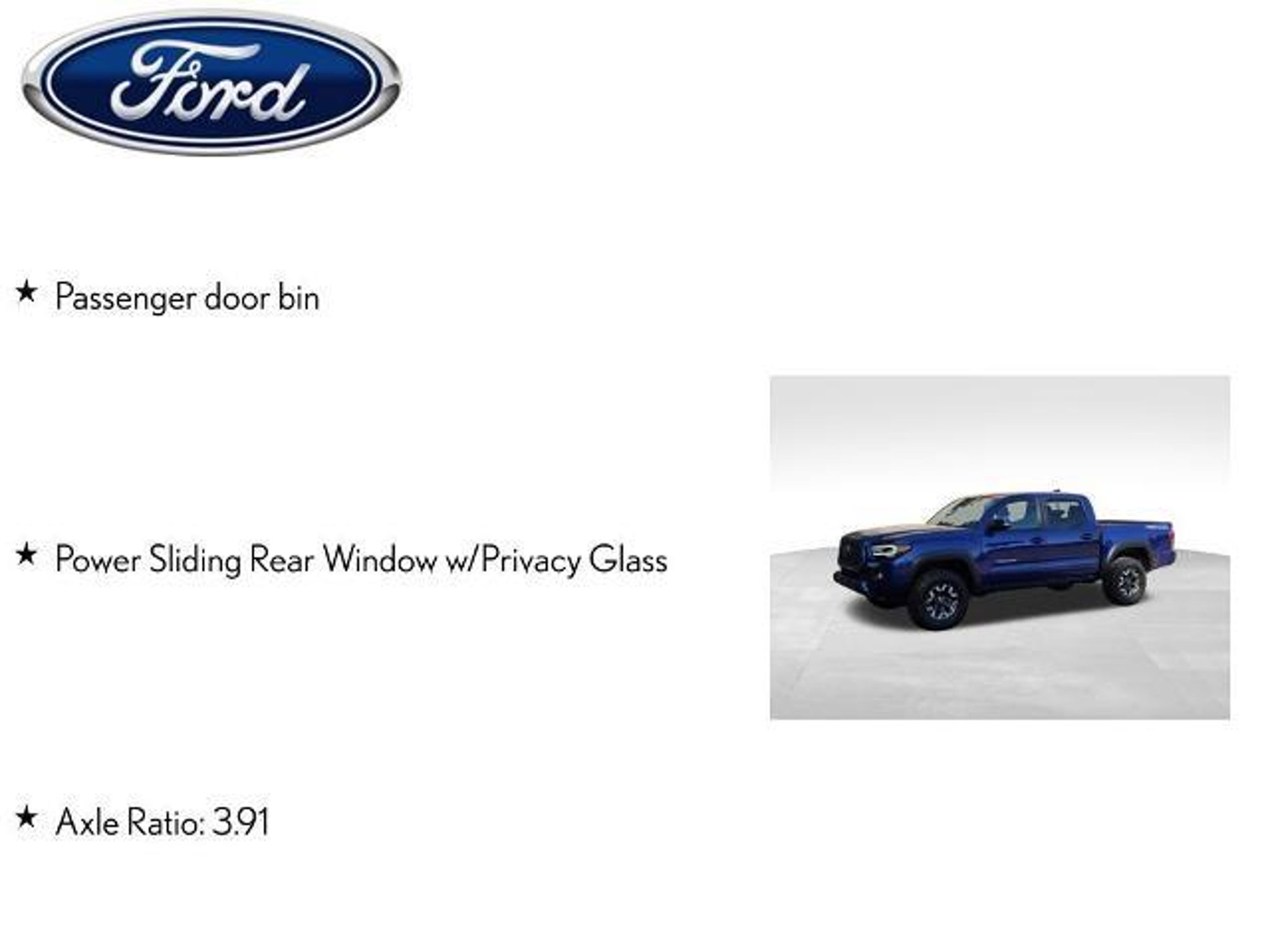 Discover the ultimate off-road companion with the 2023 Toyota Tacoma TRD Off-Road V6. This rugged and capable pickup is ready to take on any terrain, whether you're conquering the trails or navigating the city streets. With its powerful 3.5L V6 engine, 6-speed automatic transmission, and 4WD system, this Tacoma is built to tackle any challenge with confidence. The 2023 Tacoma TRD Off-Road V6 comes equipped with an impressive array of features, including: - Advanced Technology Package - LED Headlights with Black Bezel LED Fog Lights - TRD Premium Off-Road Package with Leather Shift Lever and Knob, Premium JBL Audio with Dynamic Navigation, Power Tilt/Slide Moonroof, and Heated Front Seats - 120V/400W Deck Mounted AC Power - Black Overfenders - Auto-Dimming Rearview Mirror with HomeLink - Front Door Smart Key System with Push Button Start - Power Sliding Rear Window with Privacy Glass This Tacoma is not just a capable off-road machine; it's also packed with advanced technology and premium amenities to ensure a comfortable and connected driving experience. The Premium JBL Audio system with Dynamic Navigation keeps you entertained and informed, while features like Blind Spot Monitor with Rear Cross Traffic Alert and the Multi Terrain Monitor with Camera provide added peace of mind and confidence on the road. Whether you're tackling the toughest trails or navigating the daily commute, the 2023 Toyota Tacoma TRD Off-Road V6 is the perfect companion. With its impressive fuel efficiency, delivering an EPA-estimated 18 MPG in the city and 22 MPG on the highway, this Tacoma balances power and efficiency to meet your needs. Imagine the possibilities with this exceptional Tacoma. Envision yourself behind the wheel, conquering the great outdoors or effortlessly navigating the urban landscape. This vehicle is a true testament to Toyota's commitment to quality, reliability, and off-road capability. Experience the thrill of the 2023 Toyota Tacoma TRD Off-Road V6 for yourself. Visit our showroom today and let our knowledgeable team guide you through the features and capabilities of this remarkable pickup. We're confident you'll be impressed by its performance, technology, and overall value. The listed online price reflects a $1,000 finance incentive and a $1,000 qualifying retail trade-in incentive; absence of either or both incentives will result in an increase of up to $2,000 to the final sale price.