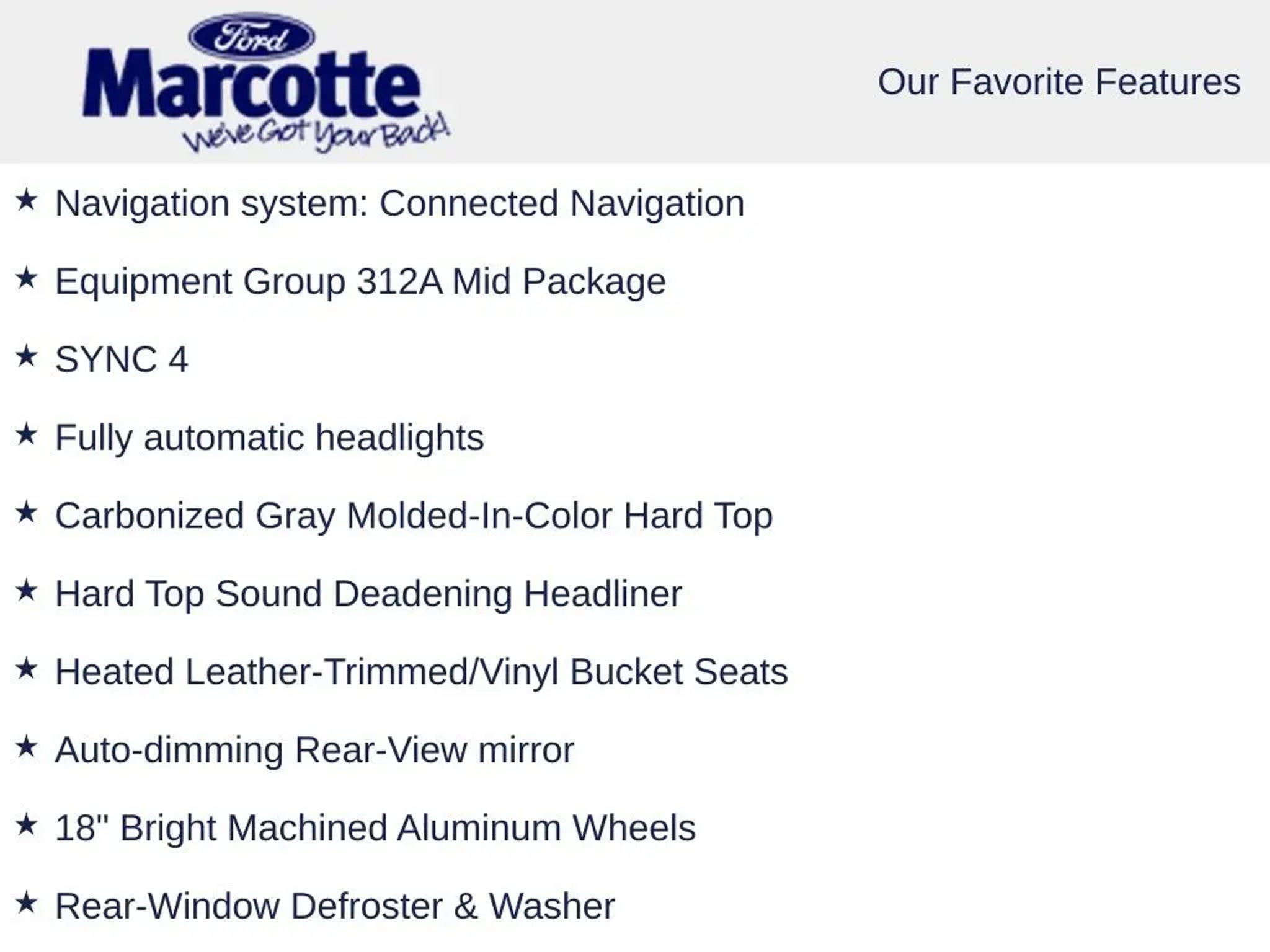 Discover the ultimate adventure-ready SUV with the 2025 Ford Bronco Outer Banks. This rugged and versatile vehicle is designed to take you on unforgettable journeys, whether you're conquering the great outdoors or navigating the city streets. Equipped with a powerful 2.3L EcoBoost I-4 engine and a smooth 10-Speed Automatic transmission, the Bronco Outer Banks delivers an exceptional driving experience. With its impressive 4WD capabilities, you'll conquer any terrain with confidence, while the fuel-efficient performance ensures you can go the distance. - Carbonized Gray Molded-In-Color Hard Top - Hard Top Sound Deadening Headliner - Fully Automatic Headlights - Auto-Dimming Rear-View Mirror - Heated Leather-Trimmed/Vinyl Bucket Seats - Navigation System: Connected Navigation - 18 Bright Machined Aluminum Wheels - Rear-Window Defroster & Washer The Bronco Outer Banks is more than just a rugged SUV; it's a statement of your adventurous spirit. With its striking White exterior and a host of premium features, this vehicle is sure to turn heads wherever you go. The SYNC 4 infotainment system keeps you connected and entertained, while the Carbonized Gray Molded-In-Color Hard Top and Hard Top Sound Deadening Headliner provide a refined and comfortable driving experience. Explore the great outdoors in style and comfort with the 2025 Ford Bronco Outer Banks. With its impressive capabilities, premium features, and bold design, this SUV is ready to elevate your adventures to new heights. Visit our showroom today and experience the power and versatility of the Bronco Outer Banks for yourself.