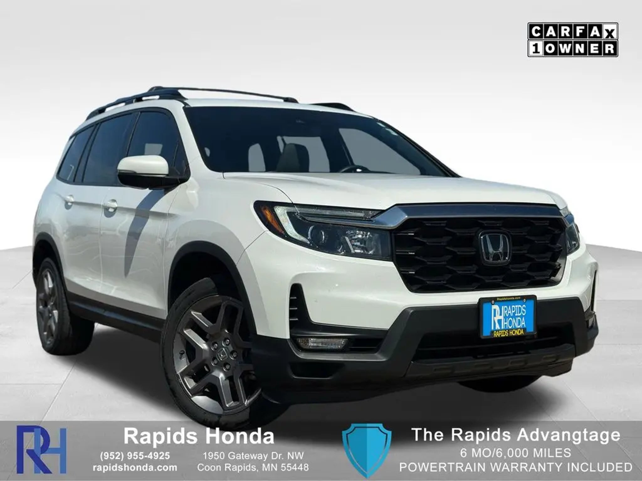 Now Available: Affordable Pre-Owned Platinum White Pearl 2023 Honda Passport EX-L with 72355 miles at Rapids Honda! This well-equipped used 2023 Honda Passport EX-L offers AWD traction, a 3.5L V6 24V SOHC i-VTEC engine with 9-Speed Automatic, and fuel efficiency rated at 19 MPG city / 24 MPG highway / 21 MPG combined. Standout features include Backup Camera and Bluetooth PairingApple CarPlay/Android Auto, Blind Spot Information (BSI) System warning, Driver's Seat Mounted Armrest, Front dual zone A/C, Garage door transmitter: HomeLink, Heated Front Bucket Seats, Leather-Trimmed Seats, Power Liftgate, Power moonroof, and Radio: 215-Watt Audio System w/7 Speakers making it ready for its next adventure. Vehicles are inspected, detailed, and come with a vehicle history report. Available on select pre-owned vehicles at Rapids Honda (see salesperson for details and eligibility requirements), The Rapids Advantage includes a 6-month/6,000-mile Powertrain Warranty covering the engine, EV battery, transmission, and drivetrain, plus $200 deductible protection. You'll also receive Lifetime Car Washes, Lifetime Windshield Repellency, Lifetime Shuttle Service, and Auto Butler Environmental Protection, giving you lasting value beyond your purchase. Visit us at 1950 Gateway Dr NW off Hwy 10 & Hanson Blvd in Coon Rapids, MN, or call us at . Open Monday-Saturday.
