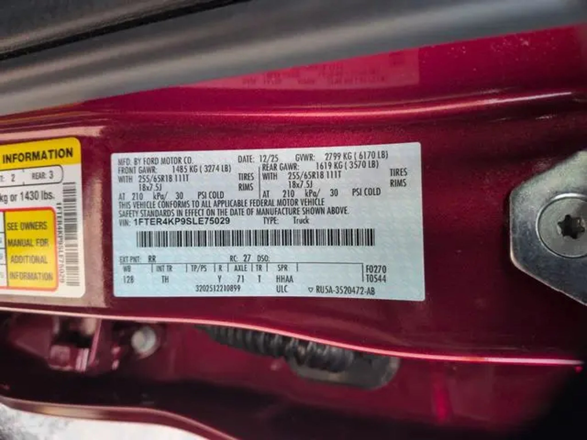 Ruby Red Metallic 2025 Ford Ranger Lariat 4WD 10-Speed Automatic 2.7L EcoBoost V6 We are currently offering Vehicle Purchase Home Delivery by appointment. Please contact for details., 4WD, 10 Speakers, 3.73 Axle Ratio, 4-Wheel Disc Brakes, ABS brakes, Advanced Towing Package, Air Conditioning, Alloy wheels, AM/FM radio: SiriusXM, Auto High-beam Headlights, Auto-dimming Rear-View mirror, Automatic temperature control, Brake assist, Class IV Trailer Hitch Receiver, Compass, Delay-off headlights, Driver door bin, Driver vanity mirror, Dual front impact airbags, Dual front side impact airbags, Electronic Stability Control, Emergency communication system: SYNC 4 911 Assist, Equipment Group 500A Standard, Front anti-roll bar, Front Bucket Seats, Front Center Armrest, Front dual zone A/C, Front fog lights, Front reading lights, Front wheel independent suspension, Fully automatic headlights, Garage door transmitter, Gray Painted Center Bar & Grille Surround, Gray Painted Front Fascia & Rear Bumper, Heated door mirrors, Heated front seats, Heated steering wheel, Illuminated entry, Internet access capable: FordPass Connect 4G, Leather Shift Knob, Leather steering wheel, Leather-Trimmed Front Heated Bucket Seats, Low tire pressure warning, Memory seat, Navigation system: Connected Navigation, Occupant sensing airbag, Outside temperature display, Overhead airbag, Overhead console, Panic alarm, Passenger door bin, Passenger vanity mirror, Power door mirrors, Power driver seat, Power passenger seat, Power steering, Power windows, Pro Trailer Backup Assist, Radio: B&O Sound System by Bang & Olufsen, Rain sensing wipers, Rear Parking Sensors w/Trailer Guidance, Rear reading lights, Rear seat center armrest, Rear step bumper, Rear window defroster, Remote keyless entry, Security system, SiriusXM Satellite Radio, Speed control, Speed-sensing steering, Sport Appearance Package, Sport Box Decal, Steering wheel mounted audio controls, SYNC 4A w/Connected Navigation, Telescoping steering wheel, Tilt steering wheel, Traction control, Trailer Brake Controller, Trailer Tow Package, Trip computer, Turn signal indicator mirrors, Variably intermittent wipers, Voltmeter, Wheels: 18 Machined Aluminum w/Dark Pockets, 4WD. Recent Arrival! *Every Internet Price includes current applicable dealer discounts. Your additional costs are sales tax, tag and title fees for the state in which the vehicle will be registered, any dealer-installed options (if applicable) and a dealer processing fee ($995 Virginia & North Carolina). Prices are subject to change, and prior sales are excluded. While every reasonable effort is made to ensure the accuracy of this information, we are not responsible for any errors or omissions contained on these pages. Please verify any information in question with the dealer.