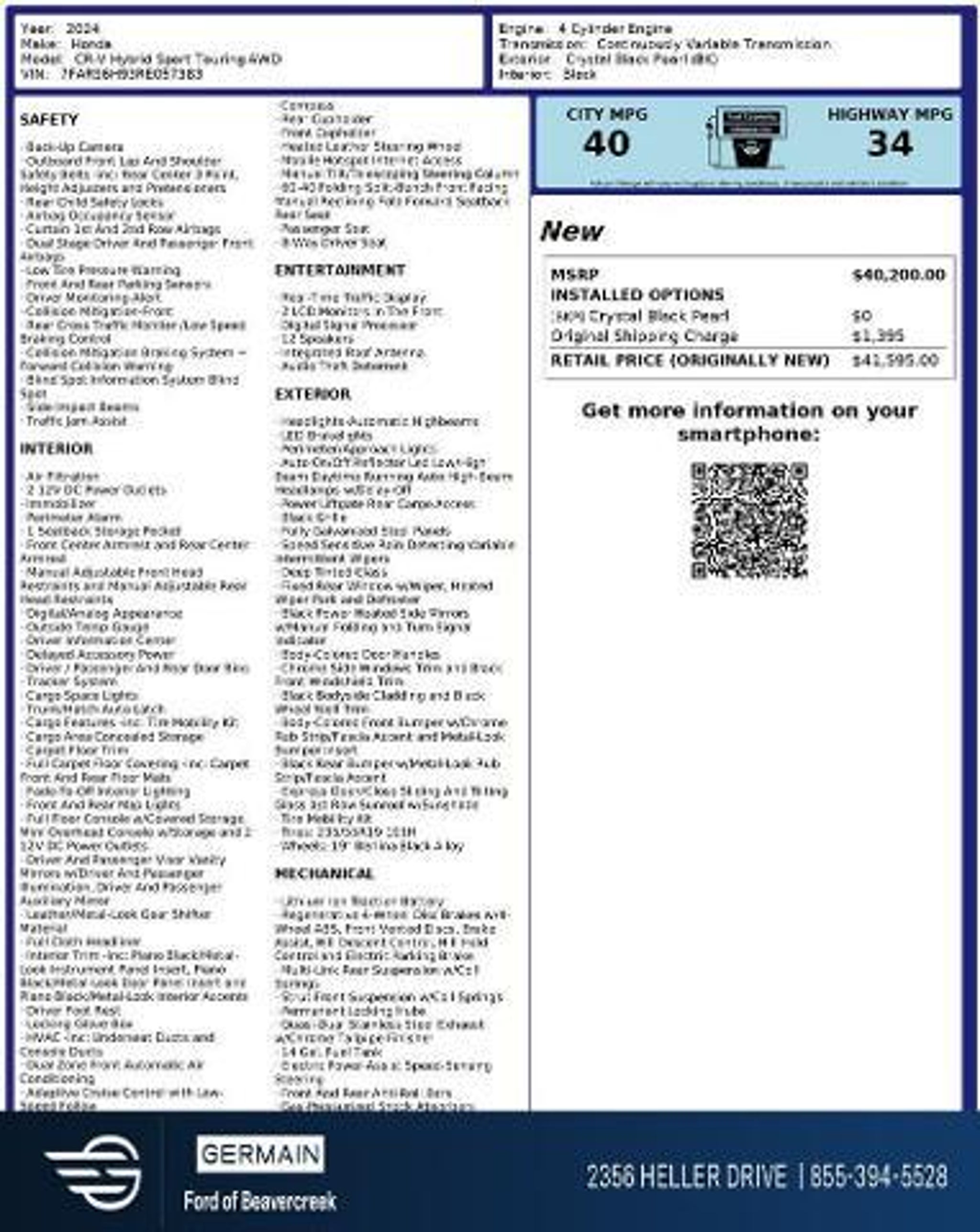 Details > 2024 Honda CR-V Hybrid AWD Sport Touring 4DR SUV For Sale in Dayton, OH Private Party Sellers Click here to place your ad now! You auta tell them you saw the ad in AutaBuy when you call or email. 1/33 2/33 3/33 4/33 5/33 6/33 7/33 8/33 9/33 10/33 11/33 12/33 13/33 14/33 15/33 16/33 17/33 18/33 19/33 20/33 21/33 22/33 23/33 24/33 25/33 26/33 27/33 28/33 29/33 30/33 31/33 32/33 33/33 View 33 Photos View All Add to My Garage Parked in Your Garage! Germain Ford of Beavercreek Contact Seller: I would like to: Make Offer Check Availability Ask A Question Request More Photos Check Financing Options Send a copy of this message to me Add this listing to my garage Send to Mobile Mileage 45,535 Exterior Color Black Doors 4 Engine 2.0L I4 Transmission 1 Speed Auto Stock # TNF8570 Ad ID 109077108 VIN 7FARS6H93RE057383 2024 Honda CR-V Hybrid AWD Sport Touring 4DR SUV Description: 2.0L I4 DOHC 16V. Recent Arrival! 40/34 City/Highway MPG The Right car, The Right price, The Right way. · Mileage: 45,535 · Color: Black Mileage 45,535 Exterior Color Black Doors 4 Engine 2.0L I4 Transmission 1 Speed Auto Stock # TNF8570 Ad ID 109077108 VIN 7FARS6H93RE057383 Add to My Garage Parked in Your Garage! Message Seller Germain Ford of Beavercreek Contact Seller: I would like to: Make Offer Check Availability Ask A Question Request More Photos Check Financing Options Send a copy of this message to me Add this listing to my garage Offered for sale by Germain Ford of Beavercreek DAYTON, OH Offered for sale by Germain Ford of Beavercreek DAYTON, OH [entire inventory] Ask Auta Intelligence The first collector-car AI built directly into a classic car marketplace How many passengers can this seat comfortably? What factory options were available on this model? What transmission options did these offer? What kind of mileage do these get? Tell me more about this model How many CR-V Hybrids were produced in Black? How many of these were produced? How easy are parts to find for this model? How far is this from me? What colors did these come in? What engine options did these come with? What trim levels were available for this model? What does this VIN number tell me? What safety features does this model offer? When was this model first introduced? Where is this located? Do you have a similar car to sell? List It Now! Questions about this car? Ask Auta Intelligence for production numbers, available options, etc. · Subscribe to AutaBuy! · Send a Gift Subscription Notice to a Friend