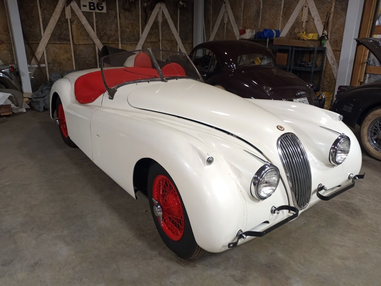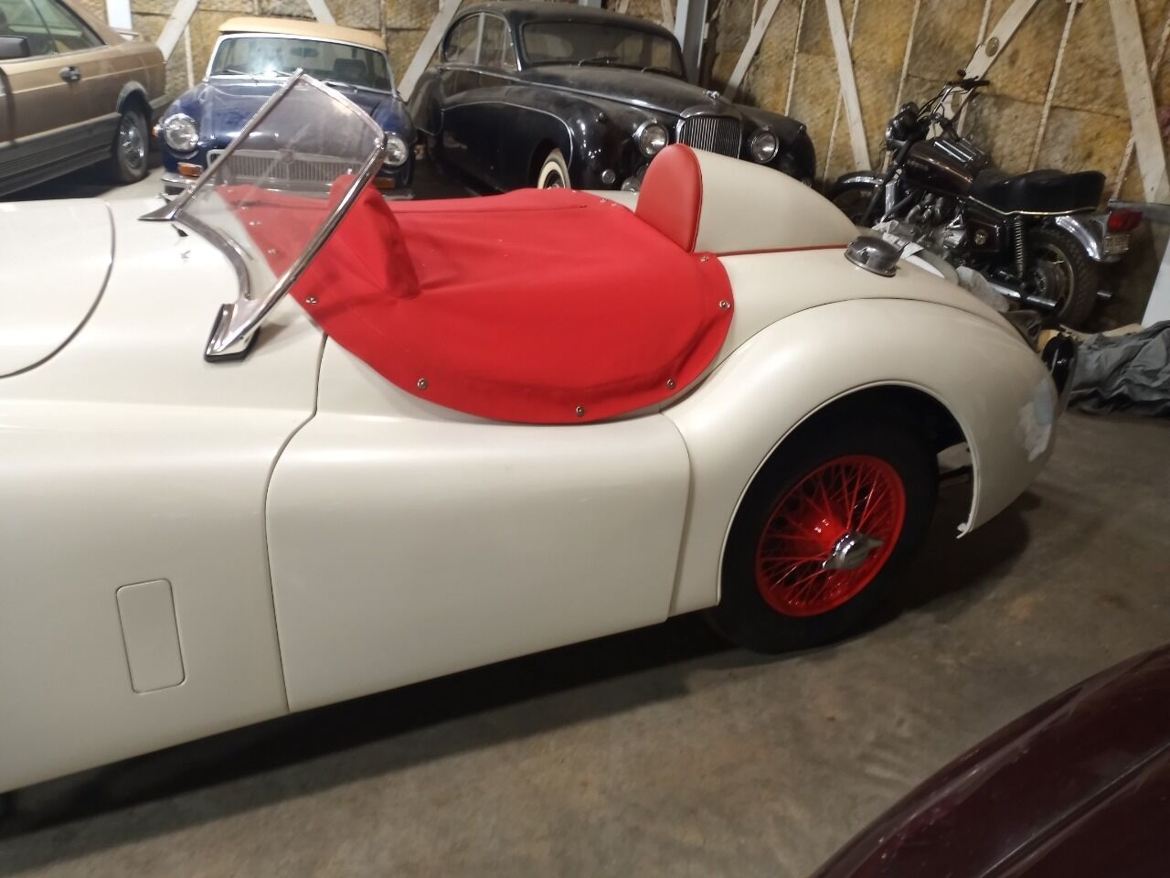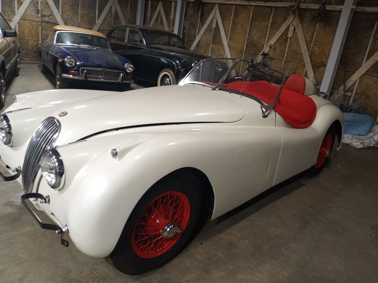 Restored XK120 Roadster. Body stripped with a show quality paint job. Engine rebuilt. New clutch, pressure plate and throwout bearing. Trans is in good working condition. Differential in good working order with new axle seals. New brake wheel cylinders, shoes and hoses. New brake master cylinder. New wiring harness. All of front suspension rebuilt. Custon built aluminum radiator, with all new belts, and hoses. New red leather seats and door panels. New carpet. Beautiful car to add to any collection. Pre-owned State and local taxes, tags, registration and title fees are not included in the advertised price.