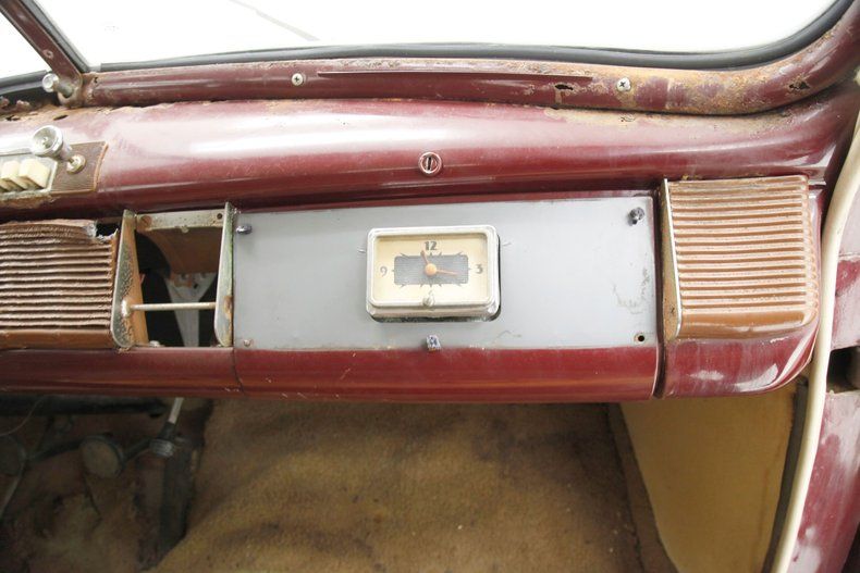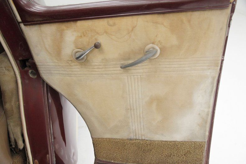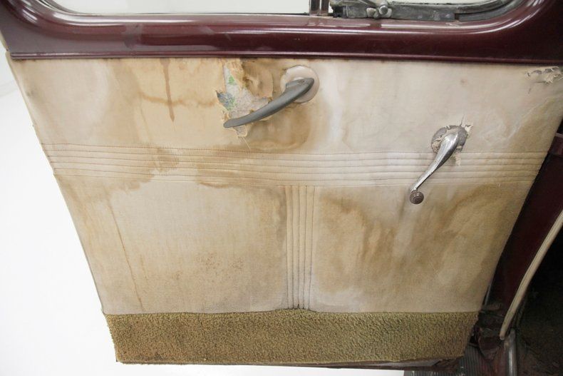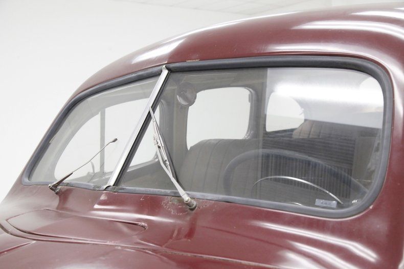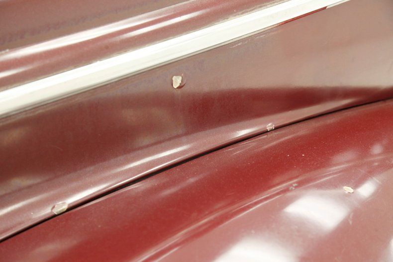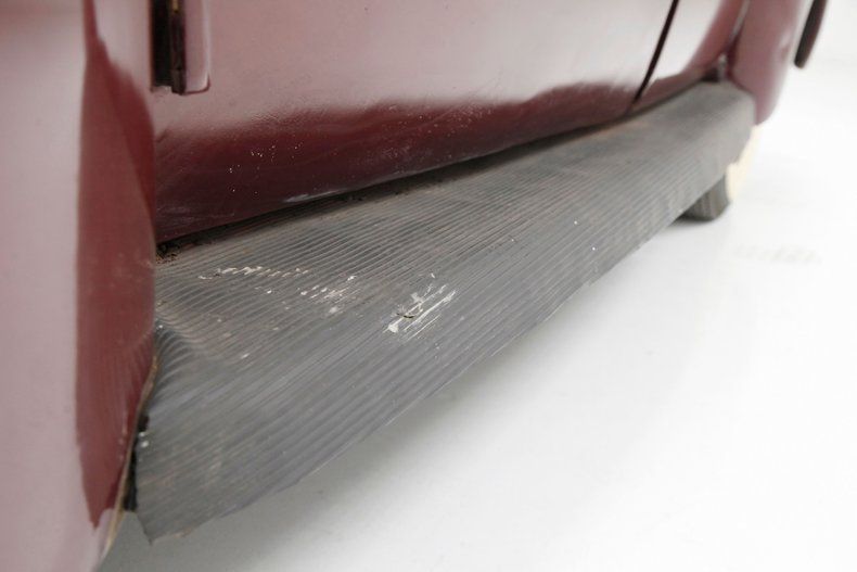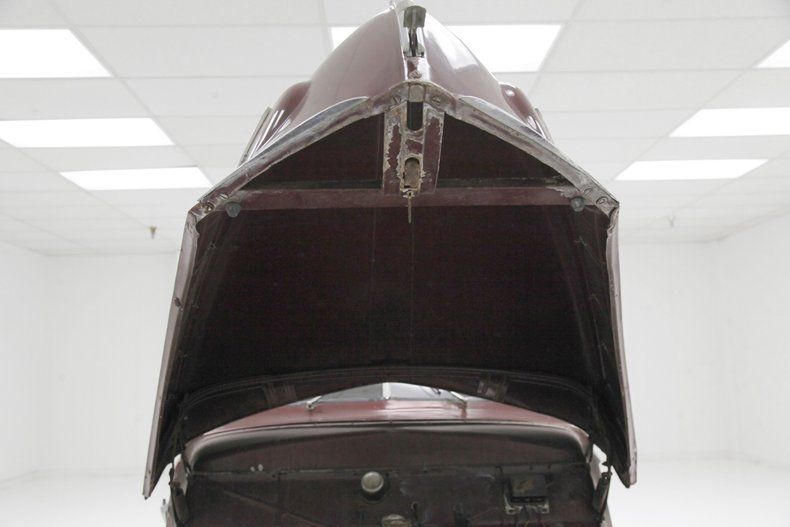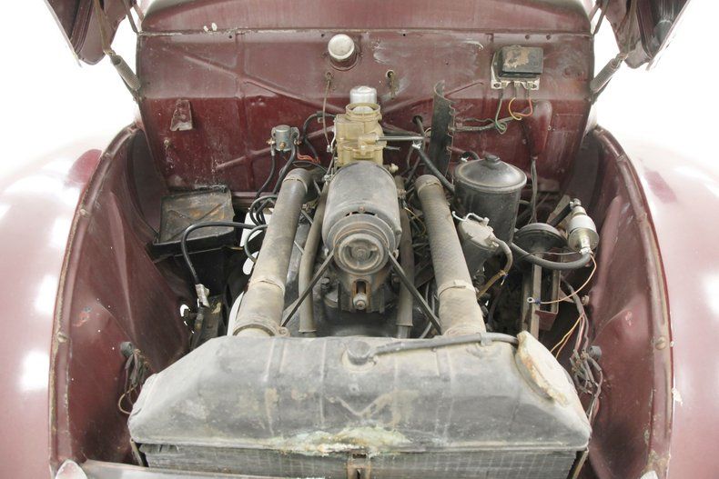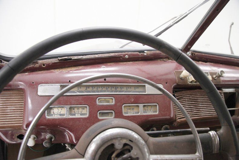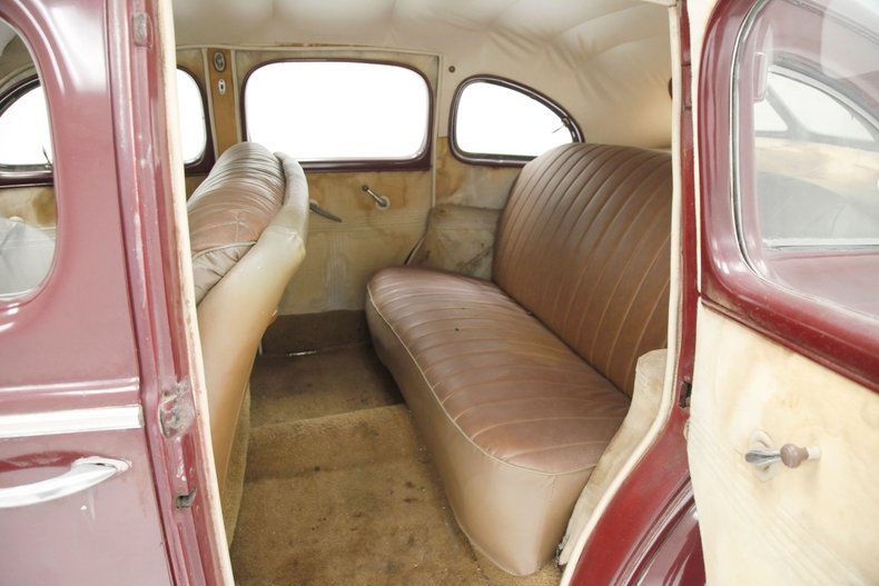The overall designs they are-a-changin' with disappearing running boards, integrated teardrop headlights in the fenders, a belt line trim spear, simple curved solid bumper complete with optional guards, bulbous fenders, and a rounded sloping down roof line and trunk lid. The beginnings of aerodynamics are in their infancy with the design of this car. The chrome is lightly pitted but still retains its shine and the metal panels are fairly straight. Invasive rust rears its head on the right side of the lower front valance and a few spot in paint repairs are noted throughout the body. A few bars of the grille have broken off and more invasive rust is showing on the rears of the front fenders. The running boards, with their ribbed covers, remain intact and strong, doing a fine job of connecting the graceful pontoon fenders. All of this steel is bathed in a classic hue of maroon, which has areas of light application and some notable chipping. Deeply treaded 16-inch pie crust wide whites are wrapping the maroon steel wheels with chrome beauty rings and dog dish chromed centers. The 1940's have started off with a bang.