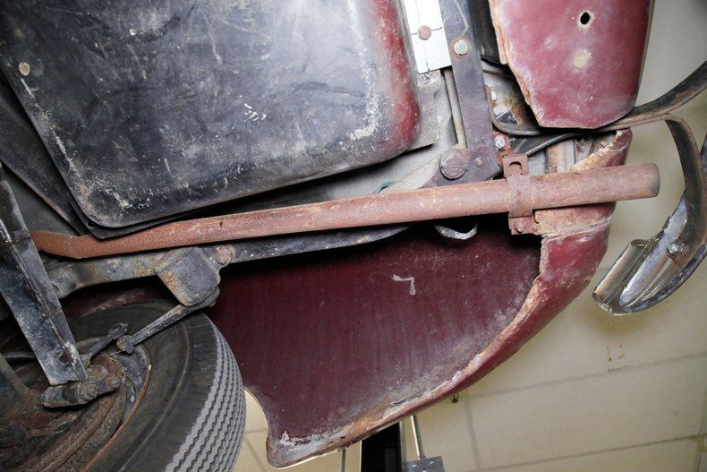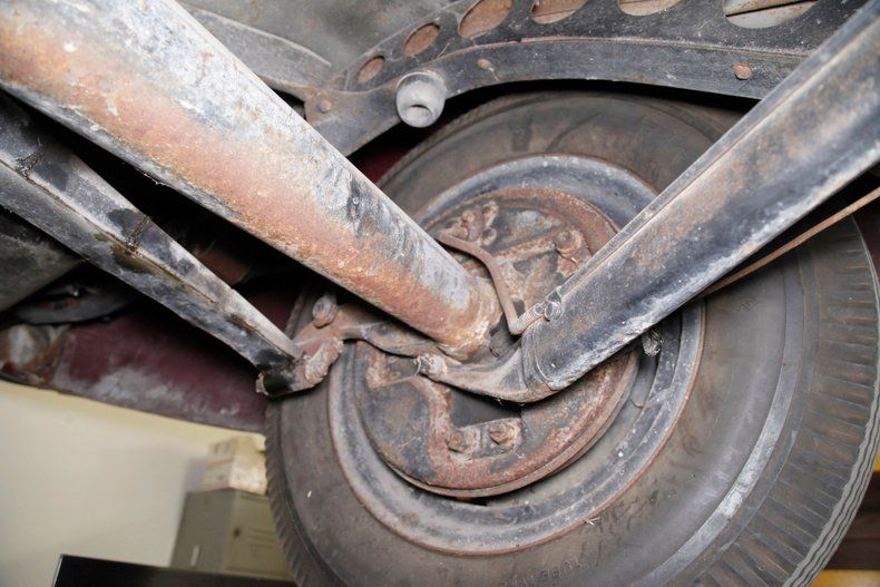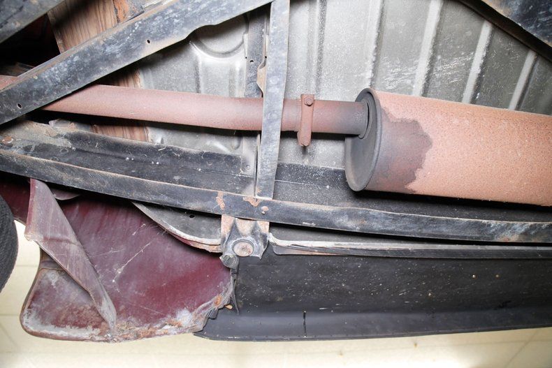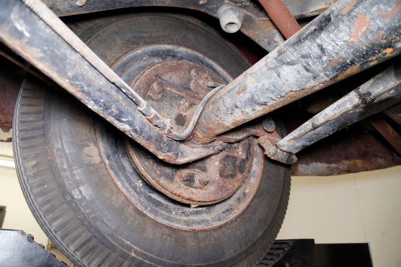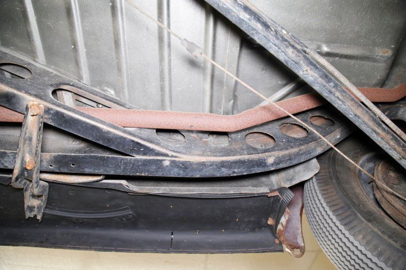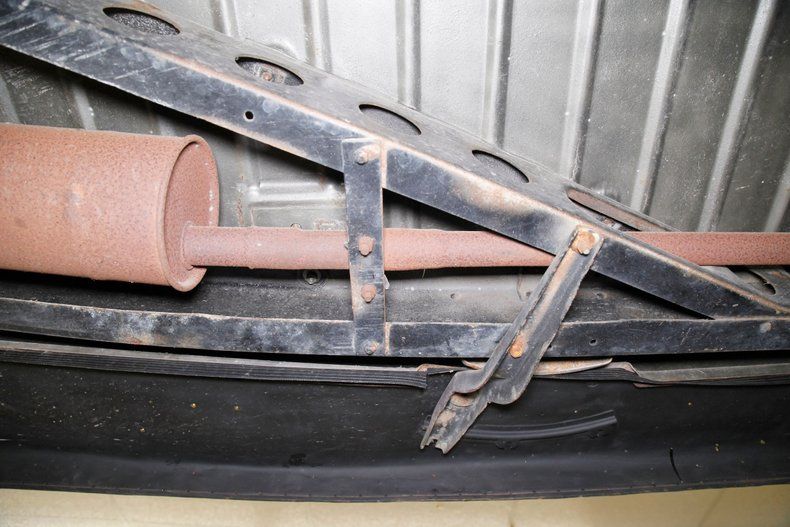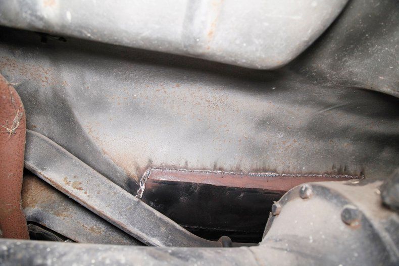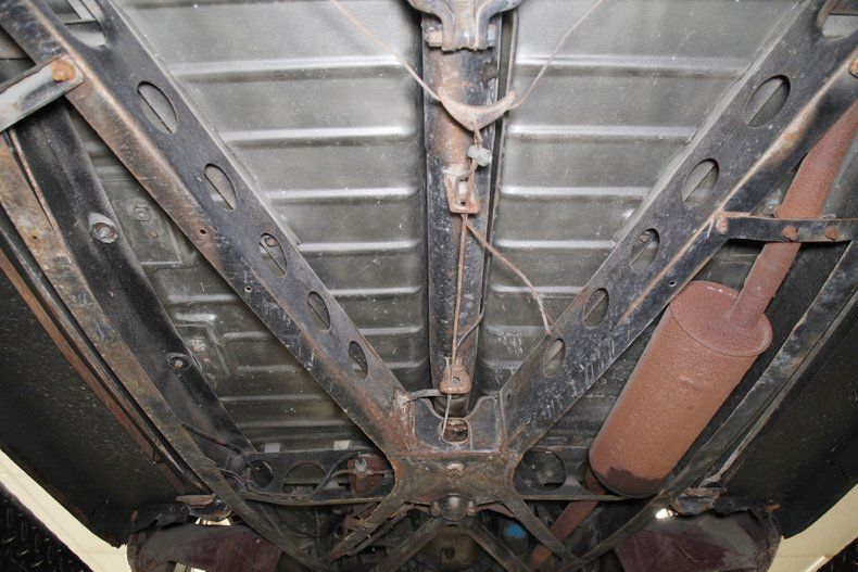 Definitely once restored but now showing some light patina and age along with surface rust for the strong X frame, sturdy body hangers, rockers and lightly sprayed black floor pans. A surface rusted single exhaust is noted and seen are transverse leaf springs for the suspension all around, and Lockheed hydraulic drum brakes are in use.
