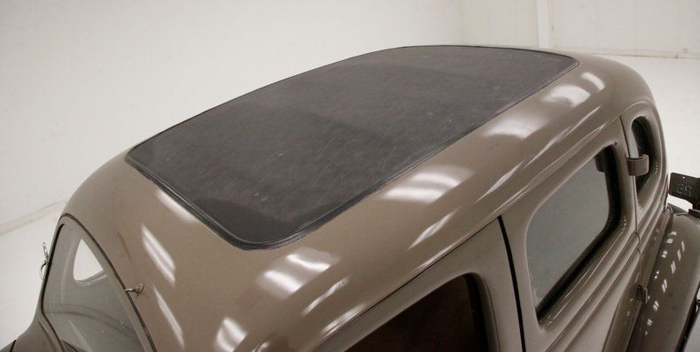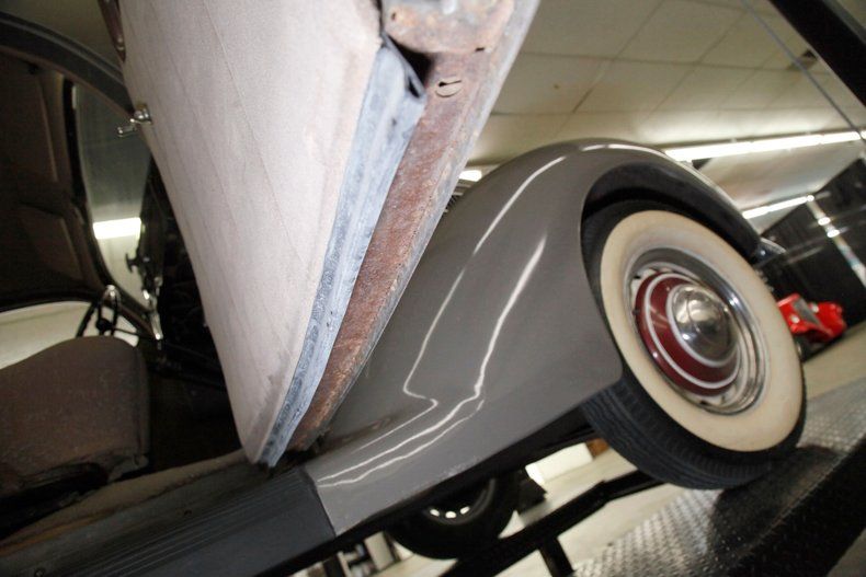 Original Henry Ford & Son sheet metal, this body features all original glass and tracks, weather strip, bumpers, bonded rubber running boards, soft roof, shared B pillar latched doors, deluxe spare tire cover and shiny hinges for said trunk. Some additional trim has been added to bling it up a tad. Throw on some horizontal ribs on the cowled hood, grille surround, and hidden black open horn bezels. Beautifully preserved gently curved chrome bumpers with vertical bars to protect them on front and rear and we are off to the rally. Following the body's teardrop design we note the addition of rear fender skirts, creating an aura of class on a fairly common car. Included are wide whitewall tires with cream painted steel wheels and moon caps with a chromed edge and a V8 badge in the center. The body itself is dipped in an era correct hue of Stonington Gray, which provides the perfect subdued backdrop for the well thought out chrome trimmings. There are a few chip offs of the paint, mostly confined to the edges near the rockers and lowers, and chrome has slight dulling but it is original. No rust is seen on this exterior steel.