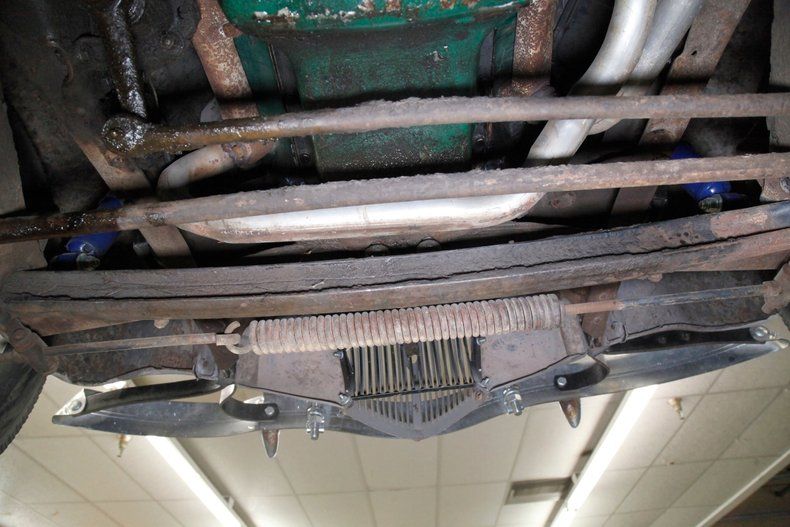 Newer blue shocks stick out in a field of heavily surface rusted undercarriage framing, floor pans, and suspension with mechanicals also surface rusted. Speaking of which we see mechanical drum brakes all around and transverse leaf springs for front and rear. A stock exhaust is installed. Despite the heavy surface rust, there does not appear to be any invasive rust causing any structural issues.